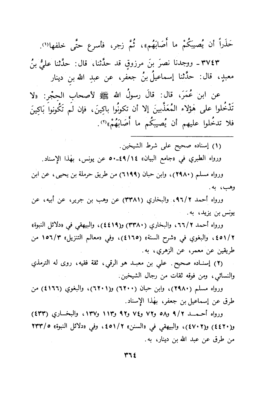 3743 - وَوَجَدْنَا نَصْرَ بْنَ مَرْزُوقٍ قَدْ حَدَّثَنَا قَالَ: حَدَّثَنَا عَلِيُّ بْنُ مَعْبَدٍ قَالَ: حَدَّثَنَا إِسْمَاعِيلُ بْنُ جَعْفَرٍ , عَنْ عَبْدِ اللهِ بْنِ دِينَارٍ , عَنِ ابْنِ عُمَرَ قَالَ: قَالَ رَسُولُ اللهِ صَلَّى اللَّهُ عَلَيْهِ وَسَلَّمَ لِأَصْحَابِ الْحِجْرِ: " لَا تَدْخُلُوا عَلَى هَؤُلَاءِ الْمُعَذَّبِينَ إِلَّا أَنْ تَكُونُوا بَاكِينَ , فَإِنْ لَمْ تَكُونُوا بَاكِينَ فَلَا تَدْخُلُوا عَلَيْهِمْ؛ أَنْ يُصِيبَكُمْ مَا أَصَابَهُمْ " -[365]-