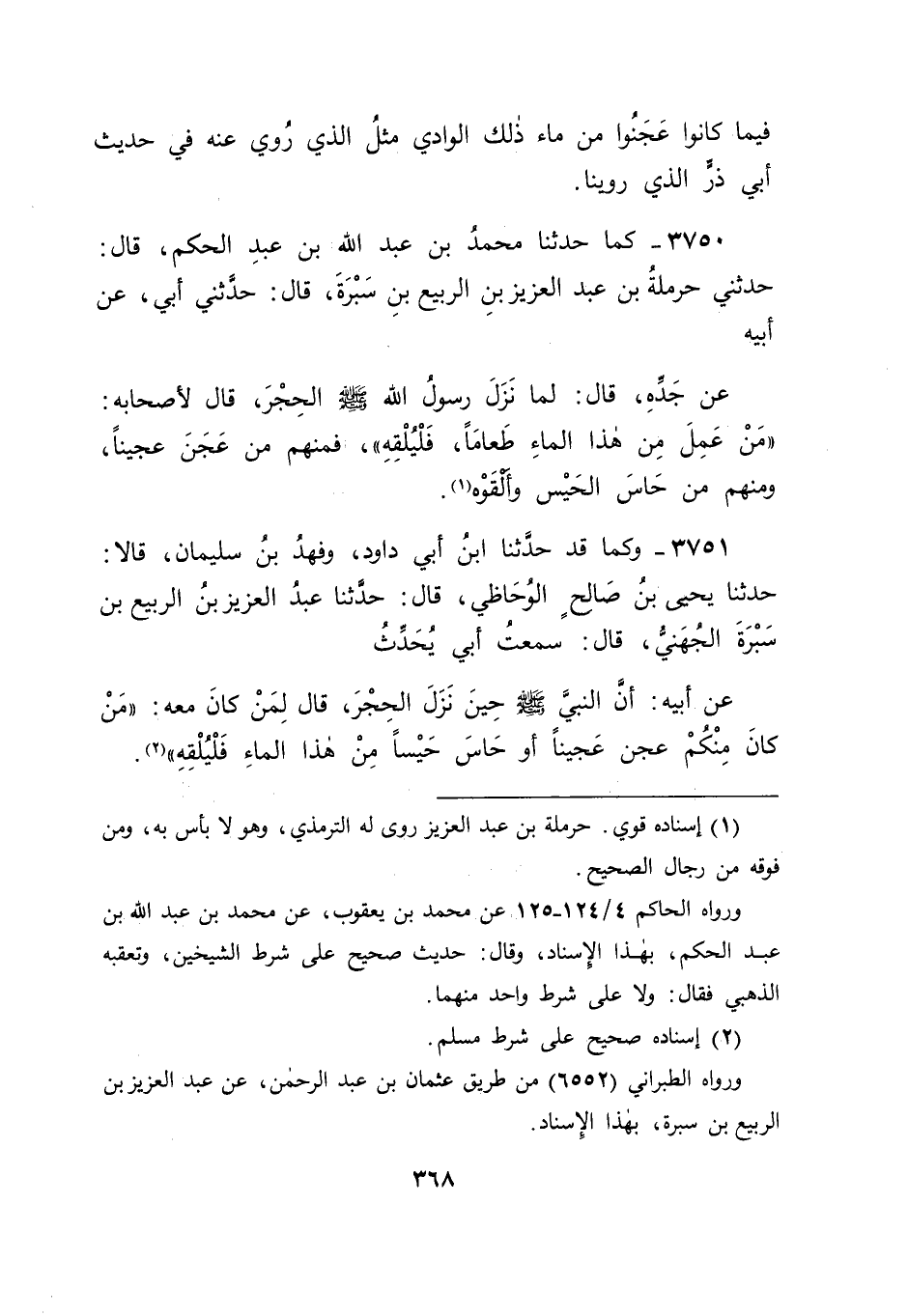 3750 - كَمَا حَدَّثَنَا مُحَمَّدُ بْنُ عَبْدِ اللهِ بْنِ عَبْدِ الْحَكَمِ قَالَ: حَدَّثَنِي حَرْمَلَةُ بْنُ عَبْدِ الْعَزِيزِ بْنِ الرَّبِيعِ بْنِ سَبْرَةَ قَالَ: حَدَّثَنِي أَبِي , عَنْ أَبِيهِ , عَنْ جَدِّهِ قَالَ: " لَمَّا نَزَلَ رَسُولُ اللهِ صَلَّى اللَّهُ عَلَيْهِ وَسَلَّمَ الْحِجْرَ قَالَ لِأَصْحَابِهِ: " مَنْ عَمِلَ مِنْ هَذَا الْمَاءِ طَعَامًا فَلْيُلْقِهِ " , فَمِنْهُمْ مَنْ عَجَنَ عَجِينًا , وَمِنْهُمْ مِنْ حَاسَ الْحَيْسَ وَأَلْقَوْهُ "