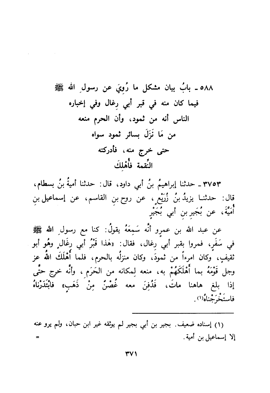 3753 - حَدَّثَنَا إِبْرَاهِيمُ بْنُ أَبِي دَاوُدَ قَالَ: حَدَّثَنَا أُمَيَّةُ بْنُ بِسْطَامٍ قَالَ: حَدَّثَنَا يَزِيدُ بْنُ زُرَيْعٍ , عَنْ رَوْحِ بْنِ الْقَاسِمِ , عَنْ إِسْمَاعِيلَ بْنِ أُمَيَّةَ , عَنْ بُجَيْرِ بْنِ أَبِي بُجَيْرٍ , عَنْ عَبْدِ اللهِ بْنِ عَمْرٍو , أَنَّهُ سَمِعَهُ يَقُولُ: " كُنَّا مَعَ رَسُولِ اللهِ صَلَّى اللَّهُ عَلَيْهِ وَسَلَّمَ فِي سَفَرٍ , فَمَرُّوا بِقَبْرِ أَبِي رِغَالٍ فَقَالَ: " هَذَا قَبْرُ أَبِي رِغَالٍ , وَهُوَ أَبُو ثَقِيفٍ , وَكَانَ امْرَأً مِنْ ثَمُودَ , وَكَانَ مَنْزِلُهُ بِالْحَرَمِ , فَلَمَّا أَهْلَكَ اللهُ عَزَّ وَجَلَّ قَوْمَهُ بِمَا أَهْلَكَهُمْ بِهِ , مَنَعَهُ لِمَكَانِهِ مِنَ الْحَرَمِ , وَإِنَّهَ خَرَجَ حَتَّى إِذَا بَلَغَ هَاهُنَا مَاتَ , فَدُفِنَ مَعَهُ غُصْنٌ مِنْ ذَهَبٍ " , فَابْتَدَرْنَاهُ , فَاسْتَخْرَجْنَاهُ " -[372]- قَالَ أَبُو جَعْفَرٍ: وَقَدْ كُنْتُ أَنَا بَعْدُ سَمَاعِي هَذَا الْحَدِيثَ مِنَ ابْنِ أَبِي دَاوُدَ نَظَرْتُ فِي كِتَابِي فَلَمْ أَجِدْ فِيهِ لِإِسْمَاعِيلَ بْنِ أُمَيَّةَ ذِكْرًا , فَدَخَلَ قَلْبِي مِنْهُ شَيْءٌ , فَذَكَرْتُهُ لِأَحْمَدَ بْنِ شُعَيْبٍ النَّسَائِيِّ , فَقَالَ لِي: هُوَ كَمَا حَفِظْتَ , فَقُلْتُ لَهُ: فَعَنْ مَنْ أَخَذْتَهُ أَنْتَ؟ فَقَالَ: عَنْ أَبِي حَفْصٍ - يَعْنِي عَمْرَو بْنَ عَلِيٍّ - , عَنِ الرِّيَاحِيِّ , قُلْتُ لَهُ: عَمْرُو بْنُ عَبْدِ الْوَهَّابِ , فَقَالَ: نَعَمْ , عَنْ يَزِيدَ.
