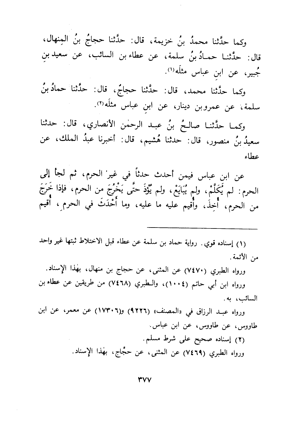 وَكَمَا حَدَّثَنَا صَالِحُ بْنُ عَبْدِ الرَّحْمَنِ الْأَنْصَارِيُّ قَالَ: حَدَّثَنَا سَعِيدُ بْنُ مَنْصُورٍ قَالَ: حَدَّثَنَا هُشَيْمٌ قَالَ: أَخْبَرَنَا عَبْدُ الْمَلِكِ , عَنْ عَطَاءٍ , عَنِ ابْنِ عَبَّاسٍ , فِيمَنْ أَحْدَثَ حَدَثًا فِي غَيْرِ الْحَرَمِ , ثُمَّ لَجَأَ إِلَى الْحَرَمِ: " لَمْ يُكَلَّمْ , وَلَمْ يُبَايَعْ , وَلَمْ يُؤْذَ , حَتَّى يَخْرُجَ مِنَ الْحَرَمِ , فَإِذَا خَرَجَ مِنَ الْحَرَمِ , أُخِذَ وَأُقِيمَ عَلَيْهِ مَا عَلَيْهِ , وَمَا أَحْدَثَ فِي الْحَرَمِ , أُقِيمَ -[378]- عَلَيْهِ مَا أَحْدَثَ فِيهِ مِنْ شَيْءٍ "