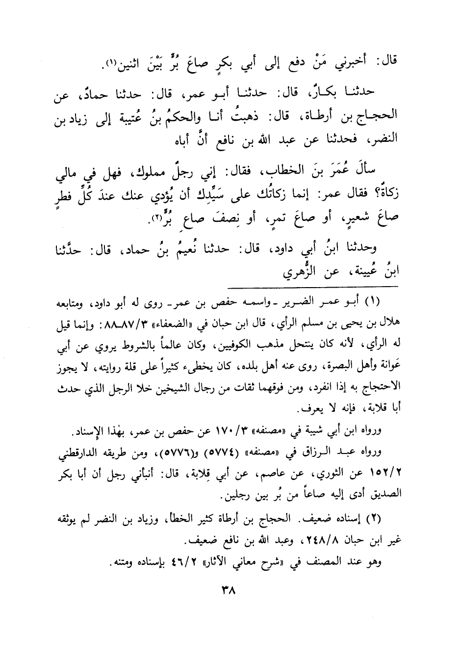 حَدَّثَنَا بَكَّارٌ قَالَ: حَدَّثَنَا أَبُو عُمَرَ قَالَ: حَدَّثَنَا حَمَّادٌ عَنِ الْحَجَّاجِ بْنِ أَرْطَاةَ قَالَ: ذَهَبْتُ أَنَا وَالْحَكَمُ بْنُ عُتَيْبَةَ إِلَى زِيَادِ بْنِ النَّضْرِ , فَحَدَّثَنَا عَنْ عَبْدِ اللهِ بْنِ نَافِعٍ أَنَّ أَبَاهُ سَأَلَ عُمَرَ بْنَ الْخَطَّابِ فَقَالَ: " إِنِّي رَجُلٌ مَمْلُوكٌ , فَهَلْ فِي مَالِي زَكَاةٌ؟ " فَقَالَ عُمَرُ: " إِنَّمَا زَكَاتُكَ عَلَى سَيِّدِكَ أَنْ يُؤَدِّيَ عَنْكَ عِنْدَ كُلِّ فِطْرٍ صَاعَ شَعِيرٍ , أَوْ صَاعَ تَمْرٍ , أَوْ نِصْفَ صَاعِ بُرٍّ