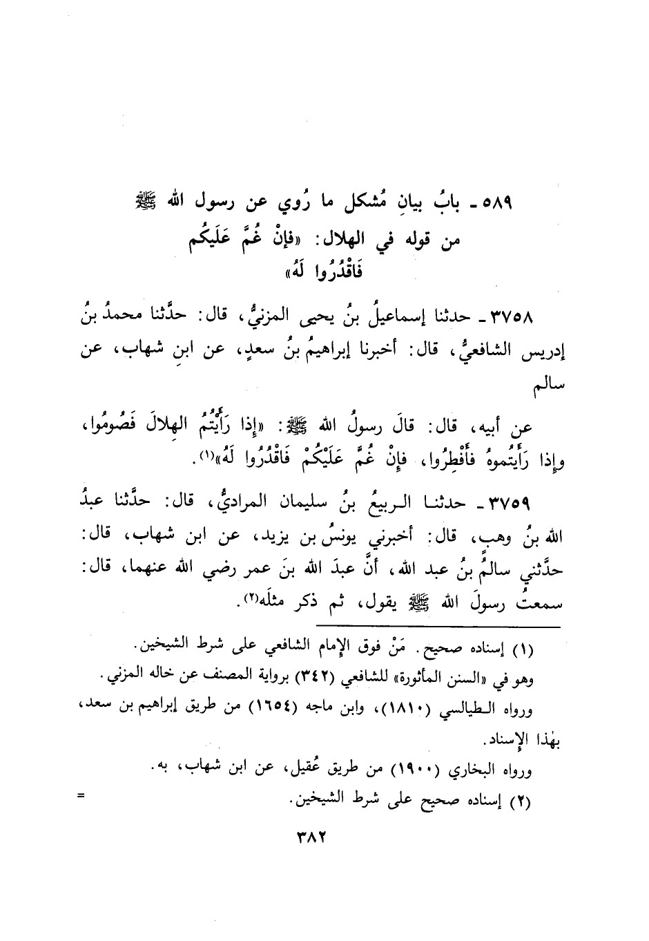 3758 - حَدَّثَنَا إِسْمَاعِيلُ بْنُ يَحْيَى الْمُزَنِيُّ قَالَ: حَدَّثَنَا مُحَمَّدُ بْنُ إِدْرِيسَ الشَّافِعِيُّ قَالَ: أَخْبَرَنَا إِبْرَاهِيمُ بْنُ سَعْدٍ , عَنِ ابْنِ شِهَابٍ , عَنْ سَالِمٍ , عَنْ أَبِيهِ قَالَ: قَالَ رَسُولُ اللهِ صَلَّى اللَّهُ عَلَيْهِ وَسَلَّمَ: " إِذَا رَأَيْتُمُ الْهِلَالَ فَصُومُوا , وَإِذَا رَأَيْتُمُوهُ فَأَفْطِرُوا , فَإِنْ غُمَّ عَلَيْكُمْ فَاقْدُرُوا لَهُ "