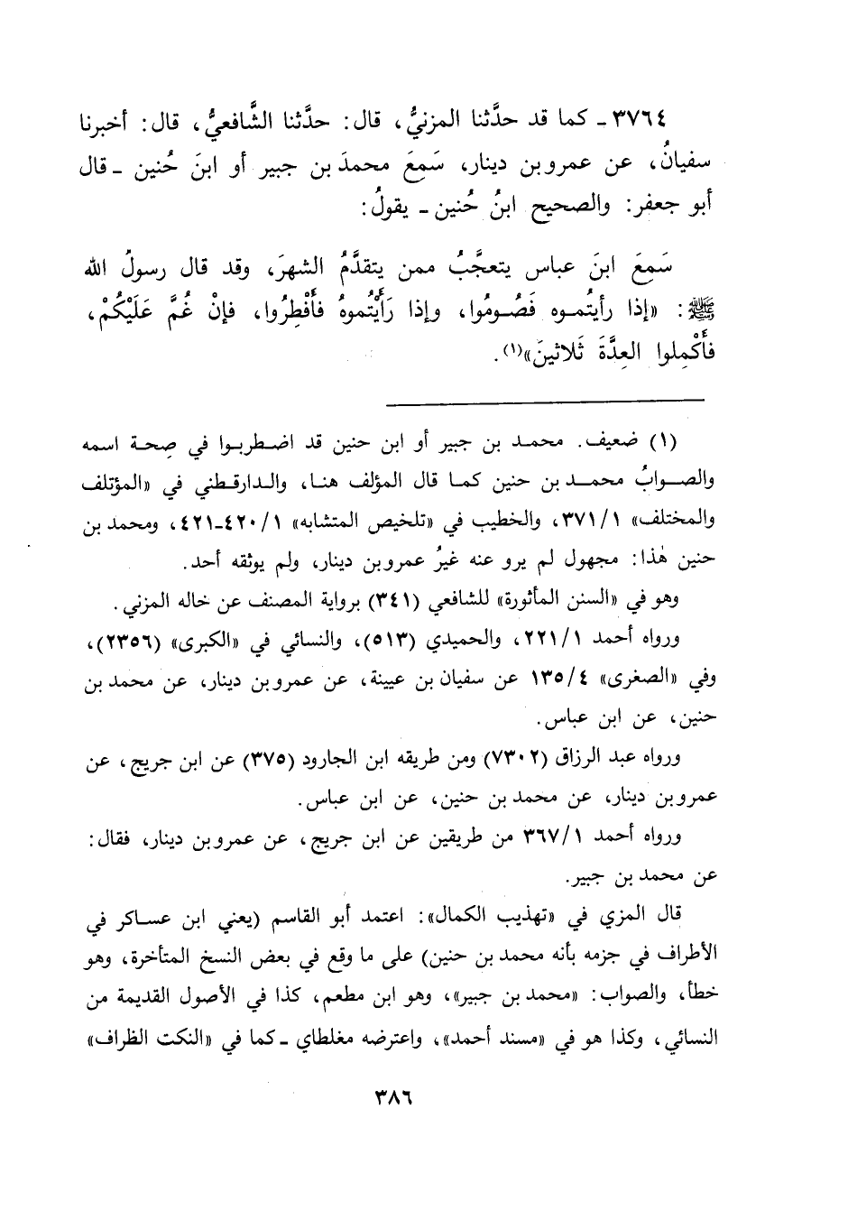 3764 - كَمَا قَدْ حَدَّثَنَا الْمُزَنِيُّ قَالَ: حَدَّثَنَا الشَّافِعِيُّ قَالَ: أَخْبَرَنَا سُفْيَانُ , عَنْ عَمْرِو بْنِ دِينَارٍ , سَمِعَ مُحَمَّدَ بْنَ جُبَيْرٍ أَوِ ابْنَ حُنَيْنٍ - قَالَ أَبُو جَعْفَرٍ: وَالصَّحِيحُ: ابْنُ حُنَيْنٍ - يَقُولُ: سَمِعَ ابْنَ عَبَّاسٍ يَتَعَجَّبُ مِمَّنْ يَتَقَدَّمُ الشَّهْرَ , وَقَدْ قَالَ رَسُولُ اللهِ صَلَّى اللَّهُ عَلَيْهِ وَسَلَّمَ: " إِذَا رَأَيْتُمُوهُ فَصُومُوا , وَإِذَا رَأَيْتُمُوهُ فَأَفْطِرُوا , فَإِنْ غُمَّ عَلَيْكُمْ فَأَكْمِلُوا الْعِدَّةَ ثَلَاثِينَ " -[387]-