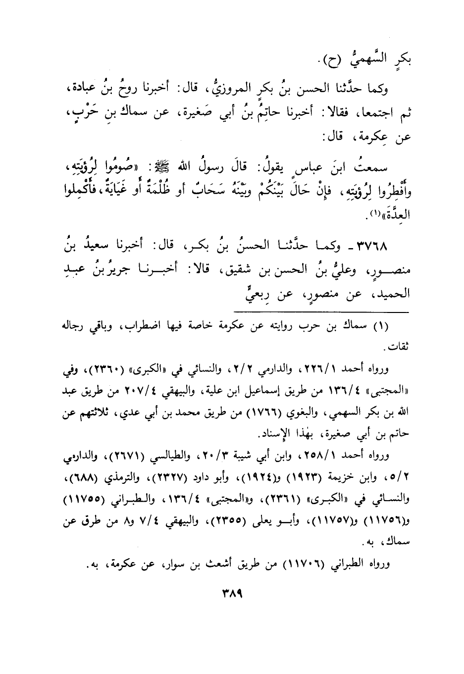 3768 - وَكَمَا حَدَّثَنَا الْحَسَنُ بْنُ بَكْرٍ قَالَ: أَخْبَرَنَا سَعِيدُ بْنُ مَنْصُورٍ , وَعَلِيُّ بْنُ الْحَسَنِ بْنِ شَقِيقٍ قَالَا: أَخْبَرَنَا جَرِيرُ بْنُ عَبْدِ الْحَمِيدِ , عَنْ مَنْصُورٍ , عَنْ رِبْعِيٍّ , -[390]- عَنْ حُذَيْفَةَ بْنِ الْيَمَانِ قَالَ: قَالَ رَسُولُ اللهِ صَلَّى اللَّهُ عَلَيْهِ وَسَلَّمَ: " لَا تَقَدَّمُوا الشَّهْرَ حَتَّى تَرَوَا الْهِلَالَ , أَوْ تُكْمِلُوا الْعِدَّةَ قَبْلَهُ , ثُمَّ صُومُوا حَتَّى تَرَوَا الْهِلَالَ , أَوْ تُكْمِلُوا الْعِدَّةَ "