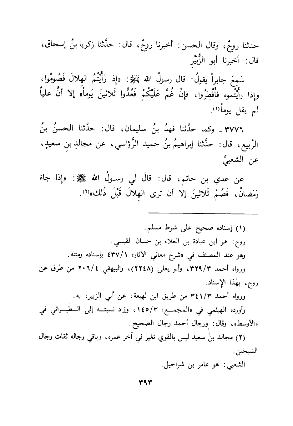 3776 - وَكَمَا حَدَّثَنَا فَهْدُ بْنُ سُلَيْمَانَ قَالَ: حَدَّثَنَا الْحَسَنُ بْنُ الرَّبِيعِ قَالَ: حَدَّثَنَا إِبْرَاهِيمُ بْنُ حُمَيْدٍ الرُّؤَاسِيُّ , عَنْ مُجَالِدِ بْنِ سَعِيدٍ , عَنِ الشَّعْبِيِّ , عَنْ عَدِيِّ بْنِ حَاتِمٍ قَالَ: قَالَ لِي رَسُولُ اللهِ صَلَّى اللَّهُ عَلَيْهِ وَسَلَّمَ: " إِذَا جَاءَ رَمَضَانُ فَصُمْ ثَلَاثِينَ , إِلَّا أَنْ تَرَى الْهِلَالَ قَبْلَ ذَلِكَ "