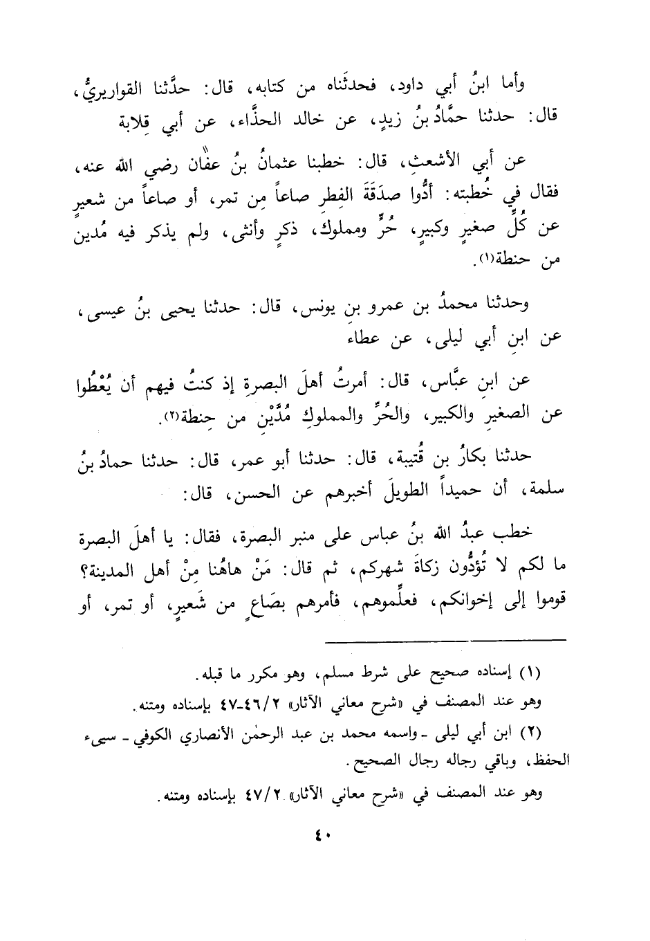 حَدَّثَنَا بَكَّارُ بْنُ قُتَيْبَةَ قَالَ: حَدَّثَنَا أَبُو عُمَرَ قَالَ: حَدَّثَنَا حَمَّادُ بْنُ سَلَمَةَ أَنَّ حُمَيْدًا الطَّوِيلَ أَخْبَرَهُمْ عَنِ الْحَسَنِ قَالَ: خَطَبَ عَبْدُ اللهِ بْنُ عَبَّاسٍ عَلَى مِنْبَرِ الْبَصْرَةِ فَقَالَ: " يَا أَهْلَ الْبَصْرَةِ , مَا لَكُمْ لَا تُؤَدُّونَ زَكَاةَ شَهْرِكُمْ؟ ثُمَّ قَالَ: مَنْ هَاهُنَا مِنْ أَهْلِ الْمَدِينَةِ؟ قُومُوا إِلَى إِخْوَانِكُمْ فَعَلِّمُوهُمْ " فَأَمَرَهُمْ بِصَاعٍ مِنْ شَعِيرٍ أَوْ تَمْرٍ أَوْ -[41]- نِصْفِ صَاعٍ مِنْ بُرٍّ , فَلَمَّا قَدِمَ عَلِيُّ بْنُ أَبِي طَالِبٍ رَضِيَ اللهُ عَنْهُ قَالَ: يَا أَهْلَ الْبَصْرَةِ , إِنَّ سِعْرَكُمْ رَخِيصٌ , لَوْ جَعَلْتُمُوهُ صَاعَ بُرٍّ فَفِيمَا قَدْ رُوِّينَاهُ فِي نِصْفِ صَاعِ بُرٍّ أَنَّهُ يَجْرِي فِي صَدَقَةِ الْفِطْرِ مَا قَدْ قَامَتْ بِهِ الْحُجَّةُ لِمَنْ ذَهَبَ إِلَى ذَلِكَ عَلَى مُخَالِفِيهِ فِيهِ , وَقَدْ رُوِيَ ذَلِكَ أَيْضًا عَنْ عُمَرَ بْنِ عَبْدِ الْعَزِيزِ , وَعَنْ مُجَاهِدٍ , وَإِبْرَاهِيمَ.