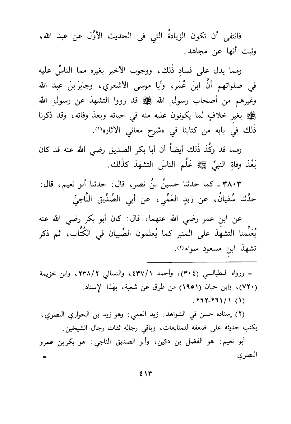 3803 - كَمَا حَدَّثَنَا حُسَيْنُ بْنُ نَصْرٍ قَالَ: حَدَّثَنَا أَبُو نُعَيْمٍ قَالَ: حَدَّثَنَا سُفْيَانُ , عَنْ زَيْدٍ الْعَمِّيِّ , عَنْ أَبِي الصِّدِّيقِ النَّاجِي , عَنِ ابْنِ عُمَرَ رَضِيَ اللهُ عَنْهُمَا قَالَ: " كَانَ أَبُو بَكْرٍ رَضِيَ اللهُ عَنْهُ يُعَلِّمُنَا التَّشَهُّدَ عَلَى الْمِنْبَرِ , كَمَا يُعَلِّمُونَ الصِّبْيَانَ فِي الْكُتَّابِ " , ثُمَّ ذَكَرَ تَشَهُّدَ ابْنِ مَسْعُودٍ سَوَاءً -[414]- وَأَنَّ عُمَرَ رَضِيَ اللهُ عَنْهُ قَدْ كَانَ عَلَّمَ التَّشَهُّدَ النَّاسَ وَهُوَ عَلَى الْمِنْبَرِ