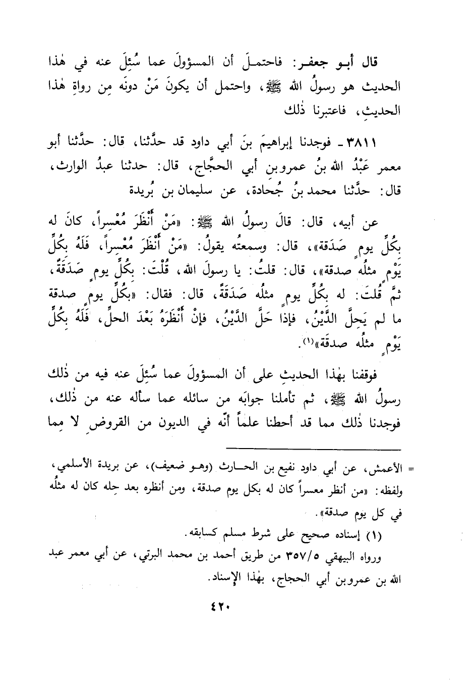 3811 - فَوَجَدْنَا إِبْرَاهِيمَ بْنَ أَبِي دَاوُدَ قَدْ حَدَّثَنَا قَالَ: حَدَّثَنَا أَبُو مَعْمَرٍ عَبْدُ اللهِ بْنُ عَمْرِو بْنِ أَبِي الْحَجَّاجِ قَالَ: حَدَّثَنَا عَبْدُ الْوَارِثِ قَالَ: حَدَّثَنَا مُحَمَّدُ بْنُ جُحَادَةَ , عَنْ سُلَيْمَانَ بْنِ بُرَيْدَةَ , عَنْ أَبِيهِ قَالَ: قَالَ رَسُولُ اللهِ صَلَّى اللَّهُ عَلَيْهِ وَسَلَّمَ: " مَنْ أَنْظَرَ مُعْسِرًا , كَانَ لَهُ بِكُلِّ يَوْمٍ صَدَقَةٌ ". قَالَ: وَسَمِعْتُهُ يَقُولُ: " مَنَ أَنْظَرَ مُعْسِرًا , فَلَهُ بِكُلِّ يَوْمٍ مِثْلُهُ صَدَقَةً ". قَالَ: قُلْتُ: يَا رَسُولَ اللهِ , قُلْتَ: " بِكُلِّ يَوْمٍ صَدَقَةٌ " , ثُمَّ قُلْتَ: " لَهُ بِكُلِّ يَوْمٍ مِثْلُهُ صَدَقَةً "؟ , قَالَ: فَقَالَ: " بِكُلِّ يَوْمٍ صَدَقَةٌ مَا لَمْ يَحِلَّ الدَّيْنُ , فَإِذَا حَلَّ الدَّيْنُ فَإِنْ أَنْظَرَهُ بَعْدَ الْحِلِّ , فَلَهُ بِكُلِّ يَوْمٍ مِثْلُهُ صَدَقَةً " فَوَقَفْنَا بِهَذَا الْحَدِيثِ عَلَى أَنَّ الْمَسْئُولَ عَمَّا سُئِلَ عَنْهُ فِيهِ مِنْ ذَلِكَ: رَسُولُ اللهِ صَلَّى اللَّهُ عَلَيْهِ وَسَلَّمَ , ثُمَّ تَأَمَّلْنَا جَوَابَهُ مِنْ سَائِلِهِ عَمَّا سَأَلَهُ عَنْهُ مِنْ ذَلِكَ , فَوَجَدْنَا ذَلِكَ مِمَّا قَدْ أَحَطْنَا عِلْمًا أَنَّهُ فِي الدُّيُونِ مِنَ الْقُرُوضِ , لَا مِمَّا -[421]- سِوَاهَا مِنْ أَثْمَانِ الْبَيَاعَاتِ وَغَيْرِهَا؛ لِأَنَّ الدُّيُونَ مِنْ أَثْمَانِ الْبَيَاعَاتِ وَغَيْرِهَا سَوَاءٌ , وَالْقُرُوضُ إِنَّمَا هِيَ أَبْدَالٌ مِنْ أَشْيَاءَ سِوَاهَا , لَا حَمْدَ فِيهَا لِأَهْلِهَا يُثَابُونَ عَلَيْهِ , وَالْأَمْوَالُ مِنَ الْقُرُوضِ هِيَ أَمْوَالٌ يَتَبَرَّعُ أَهْلُهَا فِيهَا بِإِقْرَاضِهِمْ إِيَّاهَا مَنْ يُقْرِضُونَهُ إِيَّاهَا لِيَتَصَرَّفَ بِهَا فِي مَنَافِعِ نَفْسِهِ , فَيَكُونُونَ فِي ذَلِكَ مَحْمُودِينَ , وَعَلَيْهِ مُثَابِينَ , وَاحْتُمِلَ أَنْ يَكُونَ ذَلِكَ الصَّبْرُ إِلَى الْمُدَّةِ الَّتِي كَانَ الْقَرْضُ إِلَيْهَا قَدْ لَزِمَ الْمُقْرِضَ , كَمَا يَقُولُ ذَلِكَ مَنْ يَقُولُهُ مِنْ أَهْلِ الْمَدِينَةِ , مِنْهُمْ مَالِكُ بْنُ أَنَسٍ , فَيَكُونُ ثَوَابُهُ فِي ذَلِكَ مَا يُثِيبُهُ اللهُ عَزَّ وَجَلَّ , فَإِذَا حَلَّ الدَّيْنُ لَهُ فَأَنْظَرَ بِهِ مَنْ هُوَ لَهُ عَلَيْهِ , كَانَ ثَوَابُهُ فِي ذَلِكَ فَوْقَ ثَوَابِهِ الْأَوَّلِ , فَإِنْ كَانَ هَذَا هُوَ حَقِيقَةُ هَذَا الْحَدِيثِ ثَبَتَ بِهِ مَا يَقُولُ هَؤُلَاءِ فِي الْقُرُوضِ: إِنَّ الْآجَالَ يَثْبُتُ فِيهَا كَثُبُوتِهَا فِيمَا سِوَاهَا. وَقَدْ يُحْتَمَلُ أَنْ يَكُونَ الثَّوَابُ عَلَى ذَلِكَ لَا لِأَجَلٍ وَاجِبٍ عَلَى الْمُقْرِضِ , وَلَكِنَّهُ لِأَجَلٍ قَدْ وَعَدَهُ الَّذِي أَقْرَضَهُ مَالَهُ , وَالْوَعْدُ وَإِنْ كَانَ الْحُكْمُ لَا يُوجِبُهُ , فَإِنَّ الشَّرِيعَةَ تُوجِبُ الْوَفَاءَ بِهِ , وَيَحْمَدُ عَلَيْهِ مَنْ وَفَى بِهِ , وَيَذُمُّهُ عَلَى الْخُلْفِ فِيهِ , فَيَكُونُ الْمُقْرِضُ لِمَا لَهُ إِلَى ذَلِكَ الْأَجَلِ مُوعِدًا وَعْدًا لَهُ الثَّوَابُ عَلَى الْوَفَاءِ بِهِ، وَالشَّرِيعَةُ تَمْنَعُهُ مِنْ خَلْفِ مَوْعِدِهِ فِي ذَلِكَ، فَإِذَا انْقَضَى ذَلِكَ الْأَجَلُ ذَهَبَ عَنْهُ ذَلِكَ الْوَعْدُ , وَأَطْلَقَتْ لَهُ الشَّرِيعَةُ الْمُطَالَبَةَ بِدَيْنِهِ , فَإِذَا أَنْظَرَ بِهِ بَعْدَ ذَلِكَ مَنْ هُوَ لَهُ عَلَيْهِ , كَانَ ثَوَابُهُ عَلَى ذَلِكَ أَعْظَمَ مِنْ ثَوَابِهِ عَلَيْهِ , فِيمَا كَانَ لَهُ فِيهِ مِنَ الثَّوَابِ قَبْلَ ذَلِكَ , وَهَذَا تَأْوِيلٌ حَسَنٌ , وَهُوَ الَّذِي يَجِيءُ عَلَى أُصُولِ أَبِي حَنِيفَةَ وَأَصْحَابِهِ , وَالشَّافِعِيِّ , وَاللهُ أَعْلَمُ بِحُكْمِ ذَلِكَ كَانَ عِنْدَ رَسُولِ اللهِ صَلَّى اللَّهُ عَلَيْهِ وَسَلَّمَ مِنْ هَذَيْنِ التَّأْوِيلَيْنِ , وَمِمَّا سِو