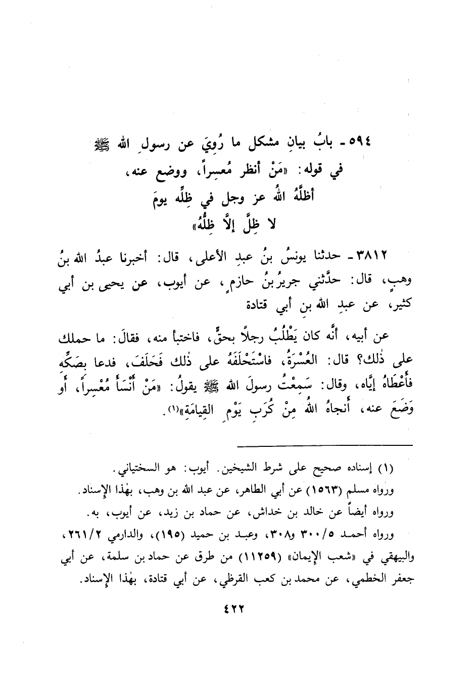 3812 - حَدَّثَنَا يُونُسُ بْنُ عَبْدِ الْأَعْلَى قَالَ: أَخْبَرَنَا عَبْدُ اللهِ بْنُ وَهْبٍ قَالَ: حَدَّثَنِي جَرِيرُ بْنُ حَازِمٍ , عَنْ أَيُّوبَ , عَنْ يَحْيَى بْنِ أَبِي كَثِيرٍ , عَنْ عَبْدِ اللهِ بْنِ أَبِي قَتَادَةَ , عَنْ أَبِيهِ , أَنَّهُ كَانَ يَطْلُبُ رَجُلًا بِحَقٍّ , فَاخْتَبَأَ مِنْهُ , فَقَالَ: " مَا حَمَلَكَ عَلَى ذَلِكَ؟ " قَالَ: الْعُسْرَةُ , فَاسْتَحْلَفَهُ عَلَى ذَلِكَ فَحَلَفَ , فَدَعَا بِصَكِّهِ فَأَعْطَاهُ إِيَّاهُ , وَقَالَ: سَمِعْتُ رَسُولَ اللهِ صَلَّى اللَّهُ عَلَيْهِ وَسَلَّمَ يَقُولُ: " مَنْ أَنْسَأَ مُعْسِرًا , أَوْ وَضَعَ عَنْهُ , أَنْجَاهُ اللهُ مِنْ كُرَبِ يَوْمِ الْقِيَامَةِ " -[423]-