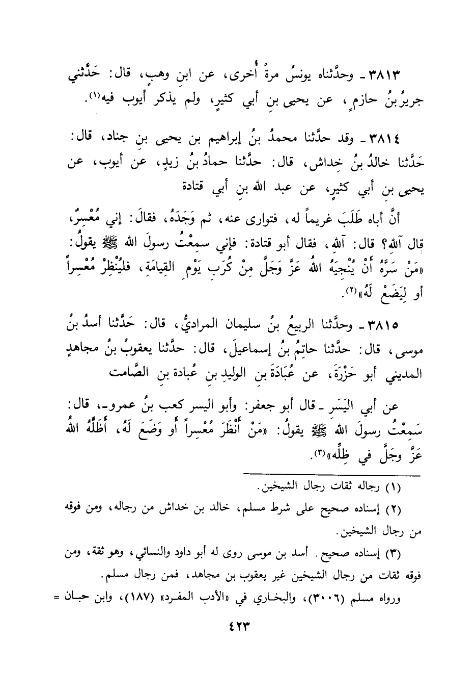 3815 - وَحَدَّثَنَا الرَّبِيعُ بْنُ سُلَيْمَانَ الْمُرَادِيُّ قَالَ: حَدَّثَنَا أَسَدُ بْنُ مُوسَى قَالَ: حَدَّثَنَا حَاتِمُ بْنُ إِسْمَاعِيلَ قَالَ: حَدَّثَنَا يَعْقُوبُ بْنُ مُجَاهِدٍ الْمَدِينِيُّ أَبُو حَزْرَةَ , عَنْ عُبَادَةَ بْنِ الْوَلِيدِ بْنِ عُبَادَةَ بْنِ الصَّامِتِ , عَنْ أَبِي الْيَسَرِ - قَالَ أَبُو جَعْفَرٍ: وَأَبُو الْيَسَرِ كَعْبُ بْنُ عَمْرٍو - , قَالَ: سَمِعْتُ رَسُولَ اللهِ صَلَّى اللَّهُ عَلَيْهِ وَسَلَّمَ يَقُولُ: " مَنْ أَنْظَرَ مُعْسِرًا , أَوْ وَضَعَ لَهُ , أَظَلَّهُ اللهُ عَزَّ وَجَلَّ فِي ظِلِّهِ " -[424]-
