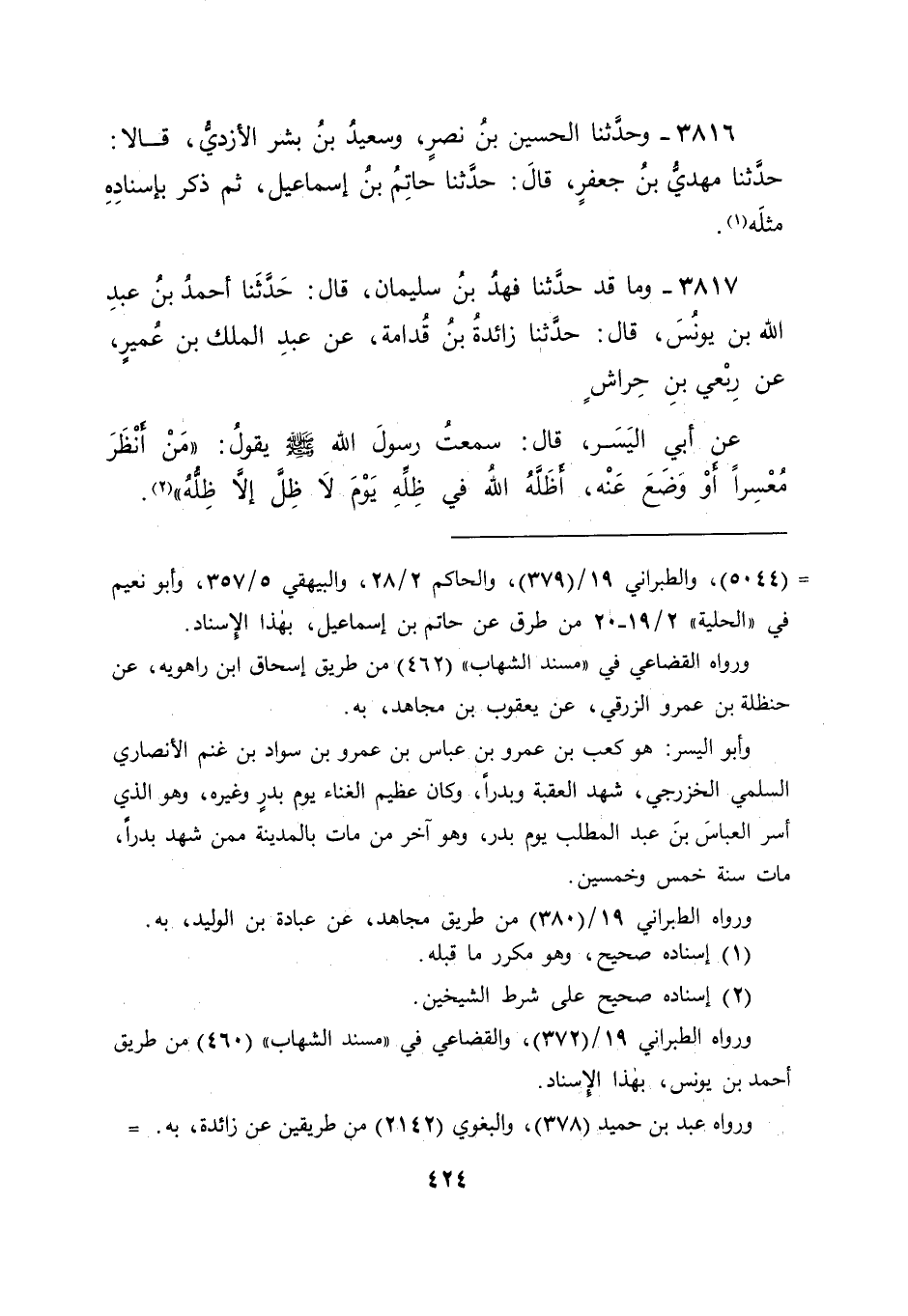 3817 - وَمَا قَدْ حَدَّثَنَا فَهْدُ بْنُ سُلَيْمَانَ قَالَ: حَدَّثَنَا أَحْمَدُ بْنُ عَبْدِ اللهِ بْنِ يُونُسَ قَالَ: حَدَّثَنَا زَائِدَةُ بْنُ قُدَامَةَ , عَنْ عَبْدِ الْمَلِكِ بْنِ عُمَيْرٍ , عَنْ رِبْعِيُّ بْنِ حِرَاشٍ , عَنْ أَبِي الْيَسَرِ قَالَ: سَمِعْتُ رَسُولَ اللهِ صَلَّى اللَّهُ عَلَيْهِ وَسَلَّمَ يَقُولُ: " مَنْ أَنْظَرَ مُعْسِرًا , أَوْ وَضَعَ عَنْهُ , أَظَلَّهُ اللهُ فِي ظِلِّهِ يَوْمَ لَا ظِلَّ إِلَّا ظِلُّهُ "