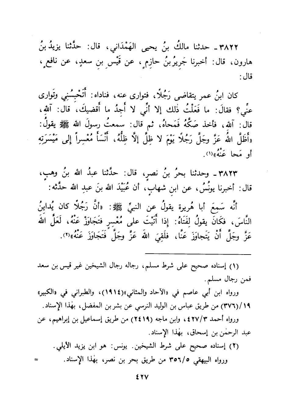 3822 - حَدَّثَنَا مَالِكُ بْنُ يَحْيَى الْهَمْدَانِيُّ قَالَ: حَدَّثَنَا يَزِيدُ بْنُ هَارُونَ قَالَ: أَخْبَرَنَا جَرِيرُ بْنُ حَازِمٍ , عَنْ قَيْسِ بْنِ سَعْدٍ , عَنْ نَافِعٍ قَالَ: " كَانَ ابْنُ عُمَرَ يَتَقَاضَى رَجُلًا فَتَوَارَى عَنْهُ , فَنَادَاهُ: أَتَحْبِسُنِي , وَتَوَارَى عَنِّي؟ " , فَقَالَ: مَا فَعَلْتُ ذَلِكَ إِلَّا أَنِّي لَا أَجِدُ مَا أَقْضِيكَ قَالَ: " آللَّهِ؟ " , قَالَ: آللَّهِ , فَأَخَذَ صَكَّهُ فَمَحَاهُ , ثُمَّ قَالَ: سَمِعْتُ رَسُولَ اللهِ صَلَّى اللَّهُ عَلَيْهِ وَسَلَّمَ يَقُولُ: " أَظَلَّ اللهُ عَزَّ وَجَلَّ رَجُلًا يَوْمَ لَا ظِلَّ إِلَّا ظِلُّهُ , أَنْسَأَ مُعْسِرًا إِلَى مَيْسَرَتِهِ , أَوْ مَحَا عَنْهُ "