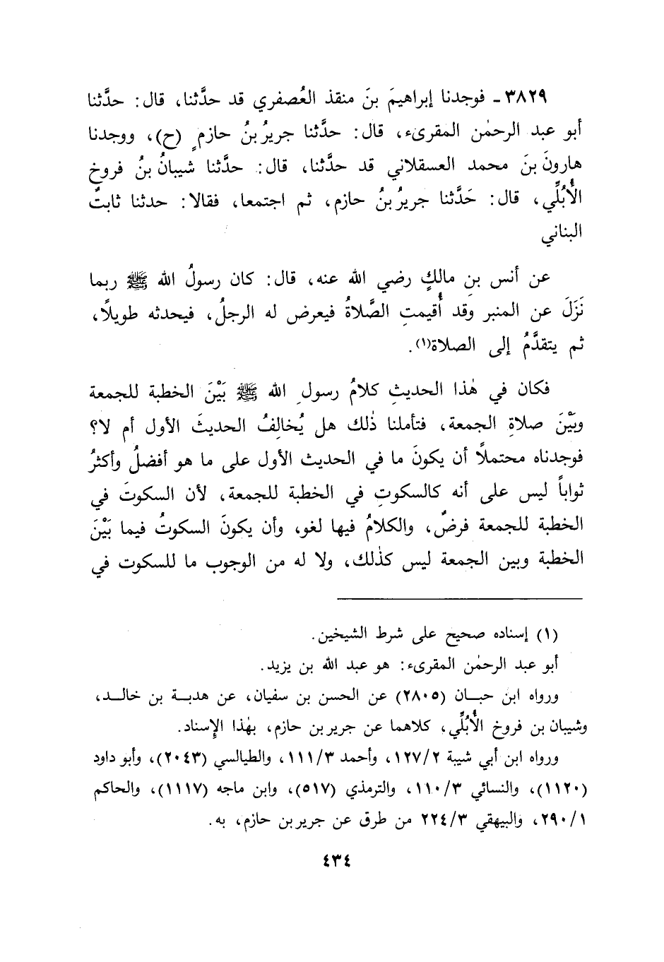 3829 - فَوَجَدْنَا إِبْرَاهِيمَ بْنَ مُنْقِذٍ الْعُصْفُرِيَّ قَدْ حَدَّثَنَا قَالَ: حَدَّثَنَا أَبُو عَبْدِ الرَّحْمَنِ الْمُقْرِئُ قَالَ: حَدَّثَنَا جَرِيرُ بْنُ حَازِمٍ , ح وَوَجَدْنَا هَارُونَ بْنَ مُحَمَّدٍ الْعَسْقَلَانِيَّ قَدْ حَدَّثَنَا قَالَ: حَدَّثَنَا شَيْبَانُ بْنُ فَرُّوخَ الْأُبُلِّيُّ قَالَ: حَدَّثَنَا جَرِيرُ بْنُ حَازِمٍ , ثُمَّ اجْتَمَعَا , فَقَالَا: حَدَّثَنَا ثَابِتٌ الْبُنَانِيُّ , عَنْ أَنَسِ بْنِ مَالِكٍ رَضِيَ اللهُ عَنْهُ قَالَ: " كَانَ رَسُولُ اللهِ صَلَّى اللَّهُ عَلَيْهِ وَسَلَّمَ رُبَّمَا نَزَلَ عَنِ الْمِنْبَرِ , وَقَدْ أُقِيمَتِ الصَّلَاةُ , فَيَعْرَضُ لَهُ الرَّجُلُ فَيُحَدِّثُهُ طَوِيلًا , ثُمَّ يَتَقَدَّمُ إِلَى الصَّلَاةِ " فَكَانَ فِي هَذَا الْحَدِيثِ كَلَامُ رَسُولِ اللهِ صَلَّى اللَّهُ عَلَيْهِ وَسَلَّمَ بَيْنَ الْخُطْبَةِ لِلْجُمُعَةِ وَبَيْنَ صَلَاةِ الْجُمُعَةِ , فَتَأَمَّلْنَا ذَلِكَ , هَلْ يُخَالِفُ الْحَدِيثَ الْأَوَّلَ , أَمْ لَا؟ , فَوَجَدْنَاهُ مُحْتَمِلًا أَنْ يَكُونَ مَا فِي الْحَدِيثِ الْأَوَّلِ عَلَى مَا هُوَ أَفْضَلُ وَأَكْثَرُ ثَوَابًا , لَيْسَ عَلَى أَنَّهُ كَالسُّكُوتِ فِي الْخُطْبَةِ لِلْجُمُعَةِ؛ لِأَنَّ السُّكُوتَ فِي الْخُطْبَةِ لِلْجُمُعَةِ فَرْضٌ , وَالْكَلَامُ فِيهَا لَغْوٌ , وَأَنْ يَكُونَ السُّكُوتُ فِيمَا بَيْنَ الْخُطْبَةِ وَبَيْنَ الْجُمُعَةِ لَيْسَ كَذَلِكَ , وَلَا لَهُ مِنَ الْوُجُوبِ مَا لِلسُّكُوتِ فِي -[435]- الْخُطْبَةِ , وَلَكِنَّهُ مَحْضُوضٌ عَلَيْهِ , وَمُبَاحٌ تَرْكُهُ , وَيَكُونُ كَلَامُ رَسُولِ اللهِ صَلَّى اللَّهُ عَلَيْهِ وَسَلَّمَ فِيهِ تَسْهِيلًا عَلَى النَّاسِ , وَإِنْ كَانَ غَيْرُهُ أَفْضَلَ مِنْهُ , كَمَا تَوَضَّأَ مَرَّةً , وَالْوُضُوءُ مَرَّتَيْنِ أَفْضَلُ مِنْهُ , وَالْوُضُوءُ ثَلَاثًا أَفْضَلُ مِنْهُمَا , فَتَرَكَ الْأَفْضَلَ وَاسْتَعْمَلَ مَا هُوَ دُونَهُ إِعْلَامًا مِنْهُ صَلَّى اللَّهُ عَلَيْهِ وَسَلَّمَ لِأُمَّتِهِ أَنَّ ذَلِكَ مُبَاحٌ لَهُمْ , غَيْرُ مَحْظُورٍ عَلَيْهِمْ , فَثَبَتَ بِتَصْحِيحِ هَذَيْنِ الْحَدِيثَيْنِ مَا قَدْ ذَكَرْنَاهُ فِيمَا صَحَّحْنَاهُمَا. فَقَالَ قَائِلٌ: فَقَدْ رُوِيَ فِيمَا كَانَ النَّاسُ عَلَيْهِ فِي هَذَا الْمَعْنَى فِي زَمَنِ عُمَرَ رَضِيَ اللهُ عَنْهُ.