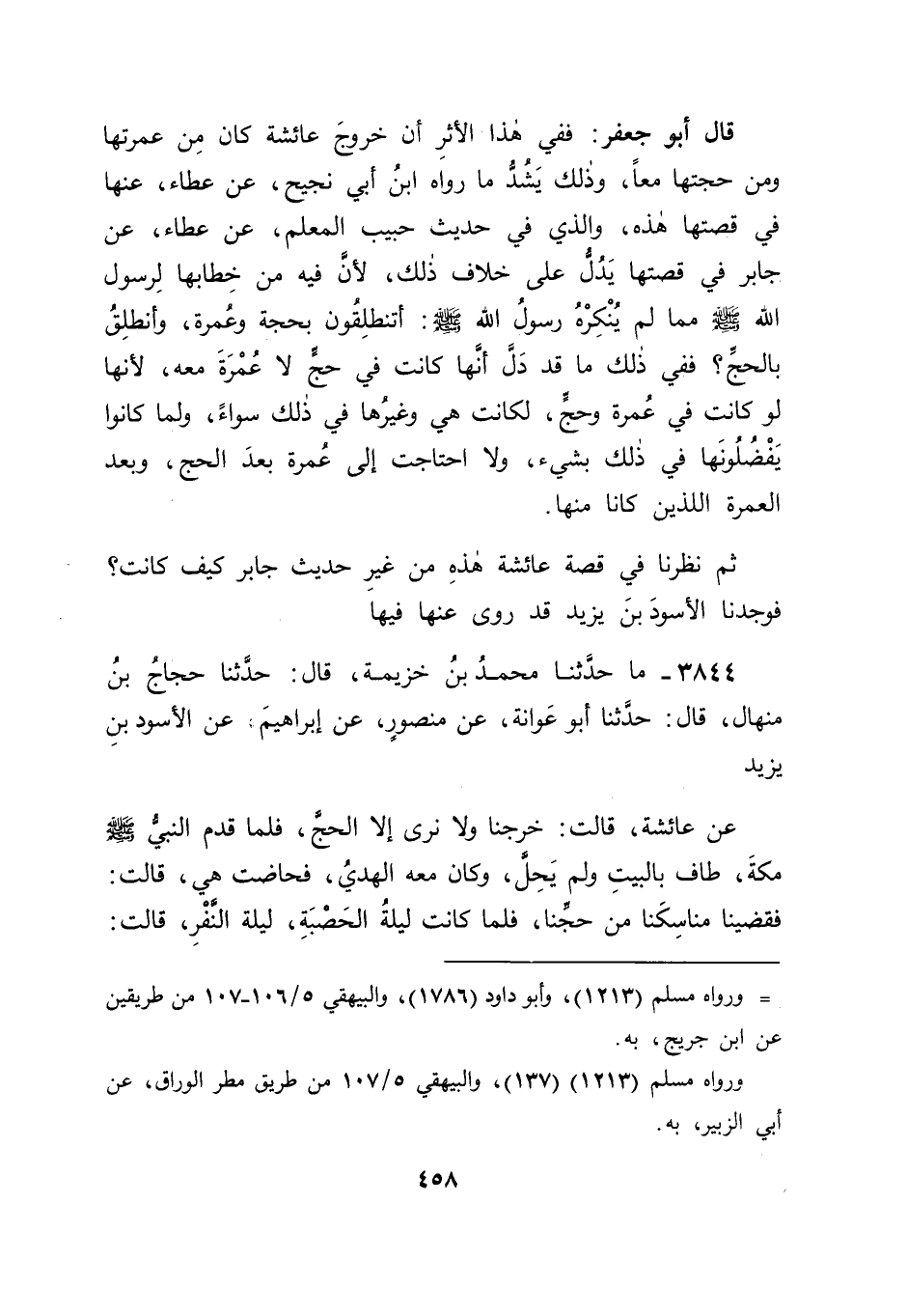 3847 - وَمَا قَدْ حَدَّثَنَا جَعْفَرٌ قَالَ: حَدَّثَنَا عُثْمَانُ بْنُ أَبِي شَيْبَةَ -[460]- قَالَ: حَدَّثَنَا جَرِيرٌ , عَنْ مَنْصُورٍ , عَنْ إِبْرَاهِيمَ , عَنِ الْأَسْوَدِ , عَنْ عَائِشَةَ , ثُمَّ ذَكَرَ نَحْوَهُ قَالَ أَبُو جَعْفَرٍ: فَفِي هَذَا الْأَثَرِ: قَوْلُ رَسُولِ اللهِ صَلَّى اللَّهُ عَلَيْهِ وَسَلَّمَ لِعَائِشَةَ: " أَمَا كُنْتِ تَطَوَّفْتِ لَيَالِيَ قَدِمْنَا؟ " , وَإِخْبَارُهَا إِيَّاهُ أَنَّهَا لَمْ تَكُنْ طَافَتْ , فَوَجْهُ ذَلِكَ عِنْدَنَا - وَاللهُ أَعْلَمُ - أَنَّهَا لَوْ كَانَتْ طَافَتْ لَيَالِيَ قَدِمُوا لَكَانَتِ الْعُمْرَةُ قَدْ تَمَّتْ لَهَا , وَأَنَّهَا لَمَّا لَمْ تَكُنْ طَافَتْ حِينَئِذٍ كَانَتْ بِخِلَافِ ذَلِكَ فِي أَمْرِهَا بِالِاعْتِمَارِ مِنَ التَّنْعِيمِ , لِيَكُونَ لَهَا عُمْرَةٌ مَعَ الْحِجَّةِ الَّتِي صَارَتْ لَهَا , وَفِي أَمْرِهِ إِيَّاهَا أَنْ تَعْتَمِرَ مَا قَدْ دَلَّ عَلَى أَنَّهَا قَدْ كَانَتْ خَرَجَتْ مَعَ الْعُمْرَةِ الْأُولَى قَبْلَ ذَلِكَ؛ لِأَنَّهُ لَا يَجُوزُ عِنْدَ أَهْلِ الْعِلْمِ جَمِيعًا أَنْ تَدْخُلَ عُمْرَةٌ عَلَى عُمْرَةٍ , وَإِنَّ فَاعِلًا لَوْ فَعَلَ ذَلِكَ لَكَانَ مُسِيئًا , ثُمَّ يَخْتَلِفُونَ فِيمَا يَجِبُ عَلَيْهِ , فَطَائِفَةٌ مِنْهُمْ تَقُولُ: لَا يَلْزَمُهُ وَهُوَ فِي حُكْمِ مَنْ لَمْ يُحْرِمْ بِهَا , وَهُوَ قَوْلُ مُحَمَّدِ بْنِ الْحَسَنِ , وَالشَّافِعِيِّ , وَقَدْ رُوِيَ ذَلِكَ -[461]- عَنْ عَطَاءِ بْنِ أَبِي رَبَاحٍ. حَدَّثَنَا مُحَمَّدُ بْنُ خُزَيْمَةَ قَالَ: حَدَّثَنَا حَجَّاجٌ قَالَ: حَدَّثَنَا حَمَّادٌ , عَنِ ابْنِ جُرَيْجٍ , عَنْ عَطَاءٍ. وَطَائِفَةٌ مِنْهُمْ تَقُولُ: قَدْ لَزِمَتْهُ , فَإِذَا عَمِلَ فِي الْأُولَى , صَارَ رَافِضًا لِهَذِهِ الَّتِي أَحْرَمَ بِهَا , وَكَانَ عَلَيْهِ لِرَفْضِهَا دَمٌ وَعُمْرَةٌ مَكَانَهَا , وَمِمَّنْ قَالَ ذَلِكَ أَبُو حَنِيفَةَ , حَدَّثَنَاهُ مُحَمَّدُ بْنُ الْعَبَّاسِ , عَنْ عَلِيِّ بْنِ مَعْبَدٍ , عَنْ مُحَمَّدِ بْنِ الْحَسَنِ , عَنْ أَبِي يُوسُفَ , عَنْ أَبِي حَنِيفَةَ. وَطَائِفَةٌ مِنْهُمْ تَقُولُ: لَمَّا أَحْرَمَ بِهَا لَزِمَتْهُ , وَكَانَ حِينَئِذٍ رَافِضًا لَهَا , وَعَلَيْهِ دَمٌ لِرَفْضِهَا , وَعُمْرَةٌ مَكَانَهَا , وَمِمَّنْ قَالَ بِذَلِكَ: أَبُو يُوسُفَ , حَدَّثَنَا بِهِ مُحَمَّدُ بْنُ الْعَبَّاسِ , عَنْ عَلِيٍّ , عَنْ مُحَمَّدٍ , عَنْ أَبِي يُوسُفَ , وَقَدْ ذَكَرَ لَنَا مُحَمَّدٌ فِي رِوَايَتِهِ هَذِهِ عَنْ عَلِيٍّ , عَنْ مُحَمَّدٍ , أَنَّهُ قَوْلُ مُحَمَّدٍ أَيْضًا. وَأَمَّا قَوْلُ مُحَمَّدٍ الْأَخِيرُ الَّذِي ذَكَرْنَاهُ قَبْلَ هَذَا , فَإِنَّ سُلَيْمَانَ بْنَ شُعَيْبٍ الْكَيْسَانِيَّ حَدَّثَنَاهُ , عَنْ أَبِيهِ , عَنْ مُحَمَّدٍ. وَلَمَّا كَانَ إِدْخَالُ الْعُمْرَةِ عَلَى الْعُمْرَةِ غَيْرَ مَحْمُودٍ عِنْدَ جَمِيعِهِمْ , اسْتَحَالَ أَنْ يَكُونَ رَسُولُ اللهِ صَلَّى اللَّهُ عَلَيْهِ وَسَلَّمَ يَأْمُرُ عَائِشَةَ بِمَا لَا حَمْدَ فِيهِ , فَدَلَّ ذَلِكَ أَنَّهَا قَدْ كَانَتْ خَرَجَتْ مِنْ عُمْرَتِهَا بِتَرْكِهَا الطَّوَافَ لَهَا لَيَالِيَ قَدِمُوا , إِمَّا بِتَوْجِيهِهَا إِلَى عَرَفَةَ مُرِيدَةً لِلْحَجِّ , كَمَا تَقُولُ طَائِفَةٌ مِنْ أَهْلِ الْعِلْمِ , مِنْهُمْ أَبُو حَنِيفَةَ فِي أَحَدِ قَوْلَيْهِ: " إِنَّ مَنْ أَحْرَمَ بِعُمْرَةٍ وَهُوَ فِي حِجَّةٍ , أَوْ كَانَ -[462]- فِي عُمْرَةٍ وَحِجَّةٍ , فَتَوَجَّهَ إِلَى عَرَفَةَ , وَلَمْ يَطُفْ لِعُمْرَتِهِ , أَنَّهُ بِذَلِكَ رَافِضٌ لِعُمْرَتِهِ , وَعَلَيْهِ لِرَفْضِهَا دَمٌ وَعُمْرَةٌ مَكَانَهَا ". حَدَّثَنَا بِذَلِكُ مِنْ قَوْلِهِ سُلَيْمَانُ بْنُ شُعَيْبٍ , عَنْ أَبِيهِ , عَنْ مُحَمَّدٍ , عَنْ أَبِي يُوسُفَ , عَنْ أَبِي حَنِيفَةَ. وَطَائِفَةٌ تَقُولُ: لَا يَ