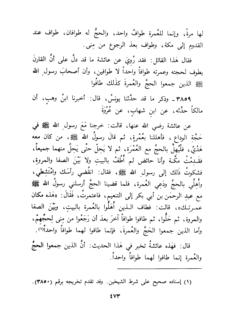 3860 - كَمَا حَدَّثَنَا ابْنُ أَبِي دَاوُدَ قَالَ: حَدَّثَنَا عَبْدُ اللهِ بْنُ صَالِحٍ قَالَ: حَدَّثَنِي اللَّيْثُ قَالَ: حَدَّثَنِي عُقَيْلٌ , عَنِ ابْنِ شِهَابٍ قَالَ: أَخْبَرَنِي عُرْوَةُ أَنَّ عَائِشَةَ رَضِيَ اللهُ عَنْهَا أَخْبَرَتْهُ عَنْ رَسُولَ اللهِ صَلَّى اللَّهُ عَلَيْهِ وَسَلَّمَ فِي تَمَتُّعِهِ بِالْعُمْرَةِ إِلَى الْحَجِّ , وَتَمَتُّعِ النَّاسِ بِهِ بِمِثْلِ الَّذِي أَخْبَرَنِي بِهِ سَالِمُ بْنُ عَبْدِ اللهِ , عَنْ رَسُولِ اللهِ صَلَّى اللَّهُ عَلَيْهِ وَسَلَّمَ , يَعْنِي حَدِيثَهُ الَّذِي ذَكَرْنَاهُ فِي ذَلِكَ فِيمَا تَقَدَّمَ مِنَّا فِي هَذَا الْبَابِ. وَإِذَا كَانَ فِيهَا مُتَمَتِّعًا كَانَ طَوَافُهُ لِعُمْرَتِهِ إِنَّمَا يَكُونُ عِنْدَ قُدُومِهِ , وَطَوَافُهُ الَّذِي يَكُونُ مِنْهُ بَعْدَ أَنْ يَرْجِعَ مِنْ مِنًى إِنَّمَا يَكُونُ لِحِجَّتِهِ دُونَ عُمْرَتِهِ , فَاحْتُمِلَ بِذَلِكَ أَنْ يَكُونَ قَوْلُ عَائِشَةَ: " فَإِنَّمَا طَافُوا لَهُمَا طَوَافًا وَاحِدًا " , أَيْ: طَوَافًا وَاحِدًا لِلْإِحْرَامِ الَّذِي كَانُوا فِيهِ , كَانَ ذَلِكَ الطَّوَافُ لِلْحِجَّةِ لَا لِلْعُمْرَةِ , وَمِمَّا قَدْ حَقَّقَ أَنَّ الطَّوَافَ لِلْقَارِنِ طَوَافَانِ , أَنَّ عَلِيَّ بْنَ أَبِي طَالِبٍ رَضِيَ اللهُ عَنْهُ قَدْ كَانَ مَعَ رَسُولِ اللهِ صَلَّى اللَّهُ عَلَيْهِ وَسَلَّمَ فِي حِجَّتِهِ تِلْكَ , وَمَذْهَبُهُ فِي طَوَافِ الْقَارِنِ أَنَّهُ طَوَافَانِ.