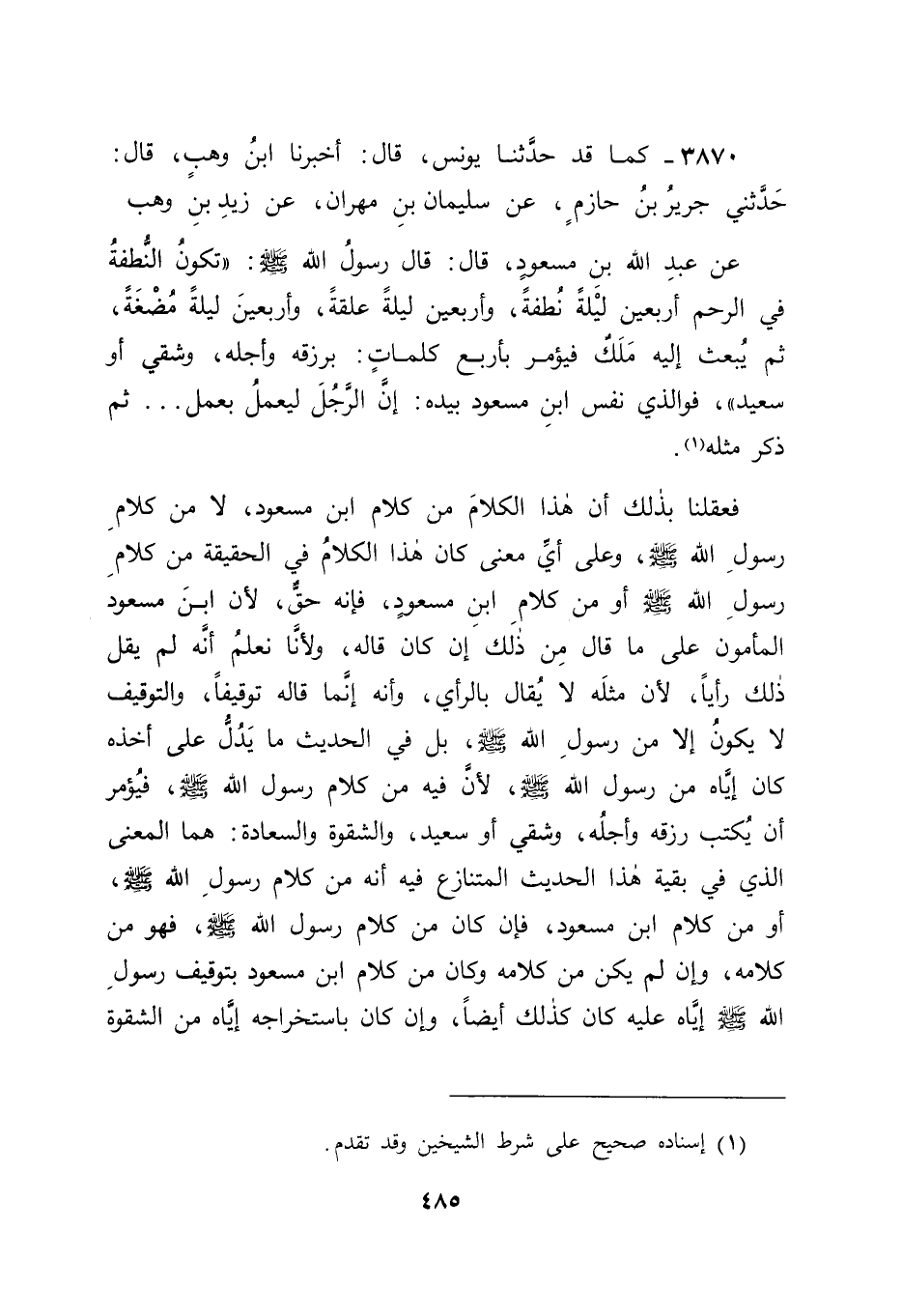3870 - كَمَا قَدْ حَدَّثَنَا يُونُسُ قَالَ: أَخْبَرَنَا ابْنُ وَهْبٍ قَالَ: حَدَّثَنِي جَرِيرُ بْنُ حَازِمٍ , عَنْ سُلَيْمَانَ بْنِ مِهْرَانَ , عَنْ زَيْدِ بْنِ وَهْبٍ , عَنْ عَبْدِ اللهِ بْنِ مَسْعُودٍ قَالَ: قَالَ رَسُولُ اللهِ صَلَّى اللَّهُ عَلَيْهِ وَسَلَّمَ: " تَكُونُ النُّطْفَةُ فِي الرَّحِمِ أَرْبَعِينَ لَيْلَةً نُطْفَةً , وَأَرْبَعِينَ لَيْلَةً عَلَقَةً , وَأَرْبَعِينَ لَيْلَةً مُضْغَةً , ثُمَّ يُبْعَثُ إِلَيْهِ مَلَكٌ , فَيُؤْمَرُ بِأَرْبَعِ كَلِمَاتٍ: بِرِزْقِهِ , وَأَجَلِهِ , وَشَقِيٍّ أَوْ سَعِيدٍ " , فَوَالَّذِي نَفْسُ ابْنِ مَسْعُودٍ بِيَدِهِ: إِنَّ الرَّجُلَ لَيَعْمَلُ بِعَمَلِ. . . , ثُمَّ ذَكَرَ مِثْلَهُ فَعَقَلْنَا بِذَلِكَ أَنَّ هَذَا الْكَلَامَ مِنْ كَلَامِ ابْنِ مَسْعُودٍ , لَا مِنْ كَلَامِ رَسُولِ اللهِ صَلَّى اللَّهُ عَلَيْهِ وَسَلَّمَ , وَعَلَى أَيِّ مَعْنًى كَانَ هَذَا الْكَلَامُ فِي الْحَقِيقَةِ مِنْ كَلَامِ رَسُولِ اللهِ صَلَّى اللَّهُ عَلَيْهِ وَسَلَّمَ , أَوْ مِنْ كَلَامِ ابْنِ مَسْعُودٍ , فَإِنَّهُ حَقٌّ؛ لِأَنَّ ابْنَ مَسْعُودٍ الْمَأْمُونُ عَلَى مَا قَالَ مِنْ ذَلِكَ إِنْ كَانَ قَالَهُ؛ وَلَأَنَّا نَعْلَمُ أَنَّهُ لَمْ يَقُلْ ذَلِكَ رَأْيًا , لِأَنَّ مِثْلَهُ لَا يُقَالُ بِالرَّأْيِ , وَأَنَّهُ إِنَّمَا قَالَهُ تَوْقِيفًا , وَالتَّوْقِيفُ لَا يَكُونُ إِلَّا مِنْ رَسُولِ اللهِ صَلَّى اللَّهُ عَلَيْهِ وَسَلَّمَ , بَلْ فِي الْحَدِيثِ مَا يَدُلُّ عَلَى أَخْذِهِ كَانَ إِيَّاهُ مِنْ رَسُولِ اللهِ صَلَّى اللَّهُ عَلَيْهِ وَسَلَّمَ؛ لِأَنَّ فِيهِ مِنْ كَلَامِ رَسُولِ اللهِ صَلَّى اللَّهُ عَلَيْهِ وَسَلَّمَ: " فَيُؤْمَرُ أَنْ يَكْتُبَ رِزْقَهُ وَأَجَلَهُ , وَشَقِيٌّ أَوْ سَعِيدٌ " , وَالشِّقْوَةُ وَالسَّعَادَةُ هُمَا الْمَعْنَى الَّذِي فِي بَقِيَّةِ هَذَا الْحَدِيثِ الْمُتَنَازَعِ فِيهِ أَنَّهُ مِنْ كَلَامِ رَسُولِ اللهِ صَلَّى اللَّهُ عَلَيْهِ وَسَلَّمَ أَوْ مِنْ كَلَامِ ابْنِ مَسْعُودٍ , فَإِنْ كَانَ مِنْ كَلَامِ رَسُولِ اللهِ صَلَّى اللَّهُ عَلَيْهِ وَسَلَّمَ , فَهُوَ مِنْ كَلَامِهِ , وَإِنْ لَمْ يَكُنْ مِنْ كَلَامِهِ , وَكَانَ مِنْ كَلَامِ ابْنِ مَسْعُودٍ بِتَوْقِيفِ رَسُولِ اللهِ صَلَّى اللَّهُ عَلَيْهِ وَسَلَّمَ إِيَّاهُ عَلَيْهِ كَانَ كَذَلِكَ أَيْضًا , وَإِنْ كَانَ بِاسْتِخْرَاجِهِ إِيَّاهُ مِنَ الشِّقْوَةِ -[486]- وَالسَّعَادَةِ الْمَذْكُورَيْنِ فِيهِ , فَهُوَ كَمَا أَخَذَهُ عَنْ رَسُولِ اللهِ صَلَّى اللَّهُ عَلَيْهِ وَسَلَّمَ أَيْضًا تَوْقِيفًا. قَالَ أَبُو جَعْفَرٍ: وَفِي هَذَا الْحَدِيثِ مَعْنًى لَمْ نَجِدْهُ إِلَّا فِي رِوَايَتَيْ زُهَيْرٍ وَحَفْصٍ , عَنِ الْأَعْمَشِ , وَفِي رِوَايَةِ بَكَّارٍ , عَنْ أَبِي أَحْمَدَ , عَنْ فِطْرٍ , عَنْ سَلَمَةَ بْنِ كُهَيْلٍ , وَهُوَ: " ثُمَّ يُنْفَخُ فِيهِ الرُّوحُ " , وَذَلِكَ مِمَّا قَدْ رُوِيَ فِيهِ عَنْ أَبِي الْعَالِيَةِ.
