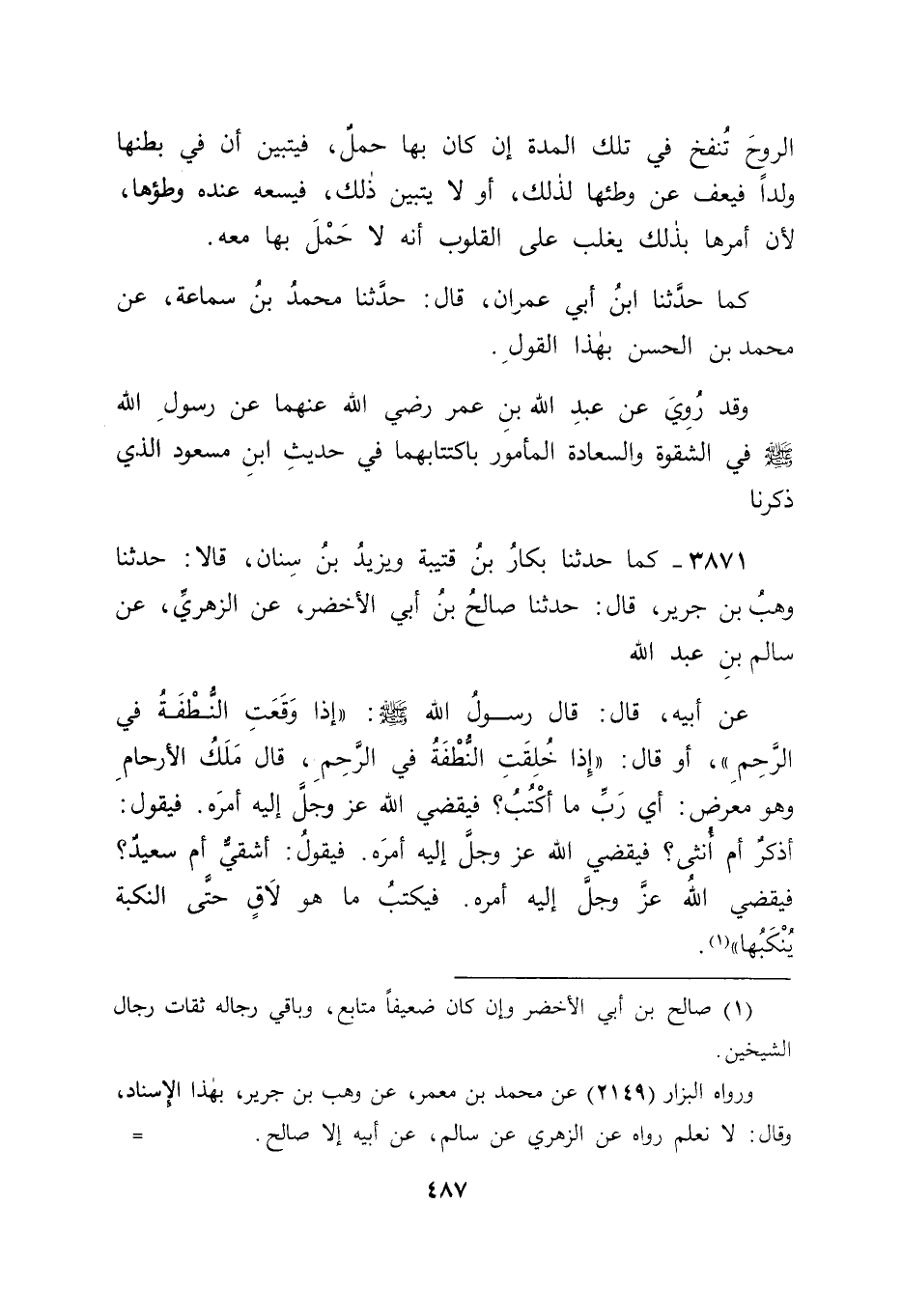 3871 - كَمَا حَدَّثَنَا بَكَّارُ بْنُ قُتَيْبَةَ , وَيَزِيدُ بْنُ سِنَانٍ قَالَا: حَدَّثَنَا وَهْبُ بْنُ جَرِيرٍ قَالَ: حَدَّثَنَا صَالِحُ بْنُ أَبِي الْأَخْضَرِ , عَنِ الزُّهْرِيِّ , عَنْ سَالِمِ بْنِ عَبْدِ اللهِ , عَنْ أَبِيهِ قَالَ: قَالَ رَسُولُ اللهِ صَلَّى اللَّهُ عَلَيْهِ وَسَلَّمَ: " إِذَا وَقَعَتِ النُّطْفَةُ فِي الرَّحِمِ " , أَوْ قَالَ: " إِذَا خُلِقَتِ النُّطْفَةُ فِي الرَّحِمِ قَالَ مَلَكُ الْأَرْحَامِ وَهُوَ مُعْرِضٌ: أَيْ رَبِّ , مَا أَكْتُبُ؟ فَيَقْضِي اللهُ عَزَّ وَجَلَّ إِلَيْهِ أَمْرَهُ , فَيَقُولُ: أَذَكَرٌ أَمْ أُنْثَى؟ فَيَقْضِي اللهُ عَزَّ وَجَلَّ إِلَيْهِ أَمْرَهُ , فَيَقُولُ: أَشَقِيٌّ أَمْ سَعِيدٌ , فَيَقْضِي اللهُ عَزَّ وَجَلَّ إِلَيْهِ أَمْرَهُ , فَيَكْتُبُ مَا هُوَ لَاقٍ حَتَّى النَّكْبَةَ يُنْكَبُهَا " -[488]-