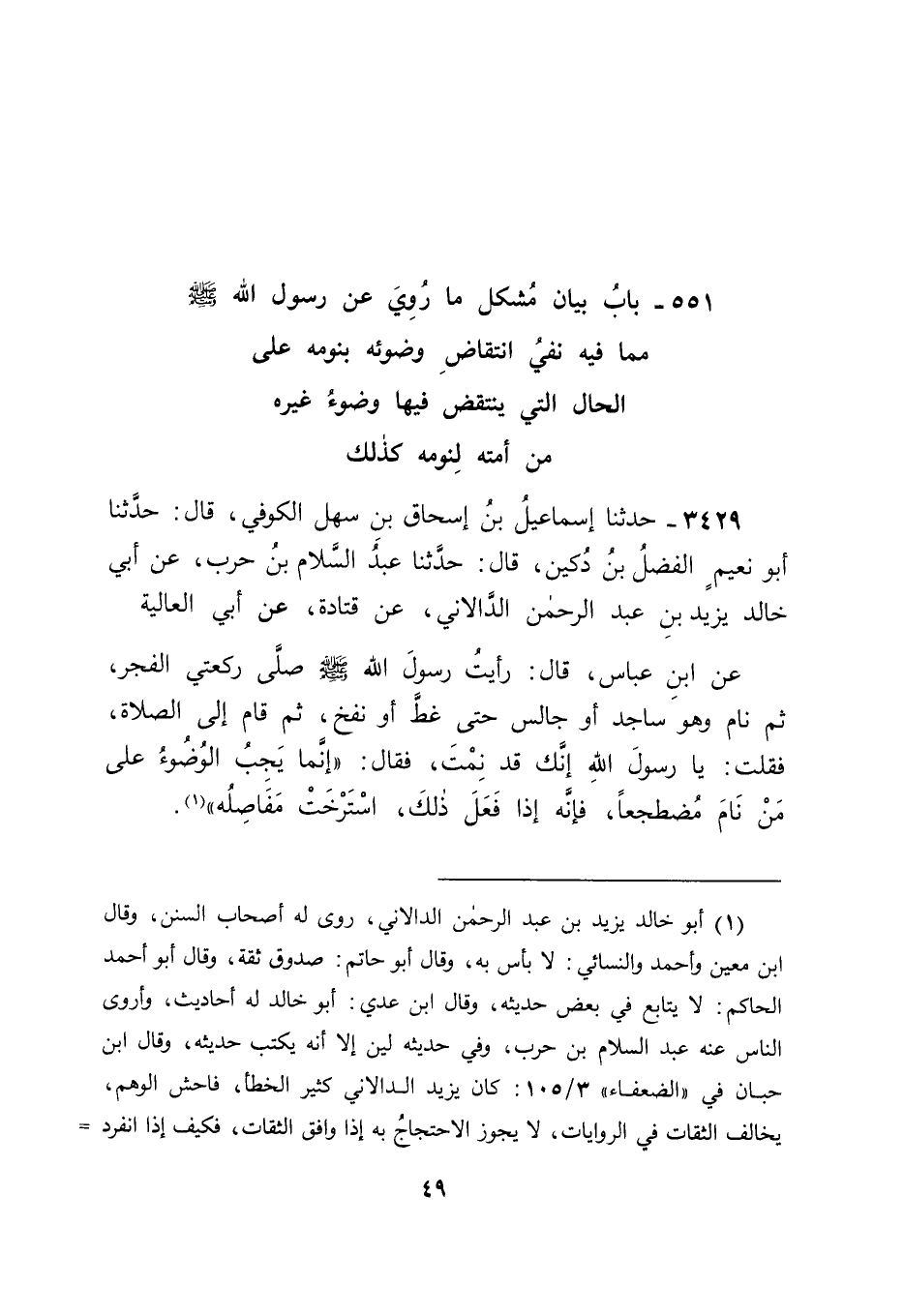 3429 - حَدَّثَنَا إِسْمَاعِيلُ بْنُ إِسْحَاقَ بْنِ سَهْلٍ الْكُوفِيُّ قَالَ: حَدَّثَنَا أَبُو نُعَيْمٍ الْفَضْلُ بْنُ دُكَيْنٍ قَالَ: حَدَّثَنَا عَبْدُ السَّلَامِ بْنُ حَرْبٍ , عَنْ أَبِي خَالِدٍ يَزِيدَ بْنِ عَبْدِ الرَّحْمَنِ الدَّالِانِيِّ , عَنْ قَتَادَةَ , عَنْ أَبِي الْعَالِيَةِ , عَنِ ابْنِ عَبَّاسٍ , قَالَ: رَأَيْتُ رَسُولَ اللهِ صَلَّى اللَّهُ عَلَيْهِ وَسَلَّمَ صَلَّى رَكْعَتَيِ الْفَجْرِ ثُمَّ نَامَ وَهُوَ سَاجِدٌ أَوْ جَالِسٌ حَتَّى غَطَّ أَوْ نَفَخَ ثُمَّ قَامَ إِلَى الصَّلَاةِ , فَقُلْتُ: " يَا رَسُولَ اللهِ , إِنَّكَ قَدْ نِمْتَ , فَقَالَ: " إِنَّمَا يَجِبُ الْوُضُوءُ عَلَى مَنْ نَامَ مُضْطَجِعًا فَإِنَّهُ إِذَا فَعَلَ ذَلِكَ اسْتَرْخَتْ مَفَاصِلُهُ " -[50]- قَالَ أَبُو جَعْفَرٍ: فَتَأَمَّلْنَا هَذَا الْحَدِيثَ فَوَجَدْنَا فِيهِ قَوْلَ ابْنِ عَبَّاسٍ لِرَسُولِ اللهِ صَلَّى اللَّهُ عَلَيْهِ وَسَلَّمَ مَا ذَكَرَ مِنْ قَوْلِهِ لَهُ فِيهِ وَكَانَ ذَلِكَ عِنْدَنَا وَاللهُ أَعْلَمُ عَلَى أَنَّ ابْنَ عَبَّاسٍ كَانَ عِنْدَهُ حِينَئِذٍ أَنَّ نَوْمَ رَسُولِ اللهِ صَلَّى اللَّهُ عَلَيْهِ وَسَلَّمَ الَّذِي وَقَفَ عَلَيْهِ مِنْهُ قَدْ نَقَضَ وُضُوءَهُ حَتَّى قَالَ لَهُ مِنْ أَجْلِ ذَلِكَ: " يَا رَسُولَ اللهِ , -[51]- إِنَّكَ قَدْ نِمْتَ " , وَإِذَا كَانَ وُضُوءُ رَسُولِ اللهِ صَلَّى اللَّهُ عَلَيْهِ وَسَلَّمَ كَانَ عِنْدَهُ يُنْتَقَضُ لِذَلِكَ كَانَ نَوْمُ غَيْرِهِ بِمِثْلِهِ أَحْرَى أَنْ يَكُونَ مُنْتَقِضًا , فَقَالَ لَهُ رَسُولُ اللهِ صَلَّى اللَّهُ عَلَيْهِ وَسَلَّمَ عِنْدَ ذَلِكَ جَوَابًا لَهُ إِيَّاهُ وَتَعْلِيمًا مِنْهُ لَهُ: " إِنَّمَا يَجِبُ الْوُضُوءُ عَلَى مَنْ نَامَ مُضْطَجِعًا " , وَأَخْبَرَهُ بِالْعِلَّةِ الَّتِي مِنْ أَجْلِهَا يَجِبُ عَلَيْهِ الْوُضُوءُ لِذَلِكَ , وَهِيَ اسْتِرْخَاءُ مَفَاصِلِهِ , وَكَانَ ذَلِكَ مِنْهُ وَاللهُ أَعْلَمُ تَعْلِيمًا مِنْهُ إِيَّاهُ , وَحُكْمُ سَائِرِ النَّاسِ فِي ذَلِكَ سَوَاءٌ ; لِأَنَّهُ الَّذِي يَحْتَاجُ إِلَيْهِ حَتَّى يَسْتَعْمِلَهُ فِي نَفْسِهِ وَحَتَّى يُعَلِّمَهُ النَّاسَ سِوَاهُ , فَأَمَّا حُكْمُ رَسُولِ اللهِ صَلَّى اللَّهُ عَلَيْهِ وَسَلَّمَ فِي ذَلِكَ فِي نَفْسِهِ فَمُخَالِفٌ لِذَلِكَ , وَقَدْ رُوِيَ ذَلِكَ عَنْهُ عَنِ ابْنِ عَبَّاسٍ فِي حَدِيثٍ غَيْرِ هَذَا الْحَدِيثِ.