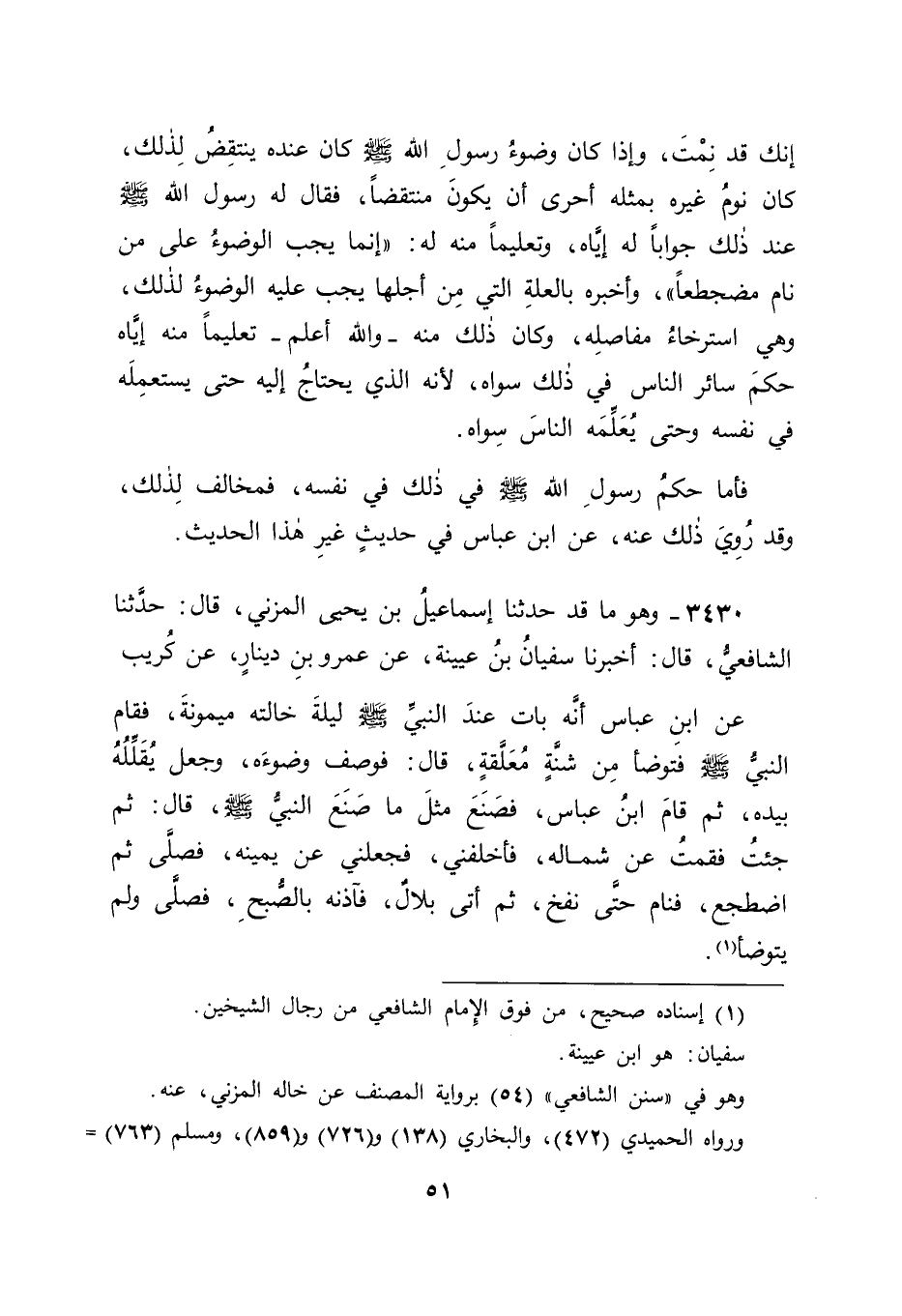 3430 - وَهُوَ مَا قَدْ حَدَّثَنَا إِسْمَاعِيلُ بْنُ يَحْيَى الْمُزَنِيُّ قَالَ: حَدَّثَنَا الشَّافِعِيُّ قَالَ: أَخْبَرَنَا سُفْيَانُ بْنُ عُيَيْنَةَ , عَنْ عَمْرِو بْنِ دِينَارٍ , عَنْ كُرَيْبٍ , عَنِ ابْنِ عَبَّاسٍ " أَنَّهُ بَاتَ عِنْدَ النَّبِيِّ صَلَّى اللَّهُ عَلَيْهِ وَسَلَّمَ لَيْلَةَ خَالَتِهِ مَيْمُونَةَ , فَقَامَ النَّبِيُّ صَلَّى اللَّهُ عَلَيْهِ وَسَلَّمَ فَتَوَضَّأَ مِنْ شَنَّةٍ مُعَلَّقَةٍ قَالَ: فَوَصَفَ وُضُوءَهُ وَجَعَلَ يُقَلِّلُهُ بِيَدِهِ , ثُمَّ قَامَ ابْنُ عَبَّاسٍ فَصَنَعَ مِثْلَ مَا صَنَعَ النَّبِيُّ صَلَّى اللَّهُ عَلَيْهِ وَسَلَّمَ , قَالَ: ثُمَّ جِئْتُ فَقُمْتُ عَنْ شِمَالِهِ , فَأَخْلَفَنِي فَجَعَلَنِي عَنْ يَمِينِهِ , فَصَلَّى ثُمَّ اضْطَجَعَ فَنَامَ حَتَّى نَفَخَ , ثُمَّ أَتَى بِلَالٌ فَآذَنَهُ بِالصُّبْحِ فَصَلَّى وَلَمْ يَتَوَضَّأْ -[52]- فَقَالَ قَائِلٌ: فَابْنُ عَبَّاسٍ إِنَّمَا خَاطَبَ النَّبِيَّ صَلَّى اللَّهُ عَلَيْهِ وَسَلَّمَ بِقَوْلِهِ لَهُ: " إِنَّكَ قَدْ نِمْتَ " فَكَيْفَ يَجُوزُ أَنْ يَكُونَ جَوَابُهُ إِيَّاهُ عَنْ غَيْرِ ذَلِكَ مِمَّا قَدْ ذُكِرَ فِي الْحَدِيثِ الَّذِي قَدْ ذُكِرَ فِيهِ ذَلِكَ؟ , فَكَانَ جَوَابُنَا لَهُ فِي ذَلِكَ بِتَوْفِيقِ اللهِ عَزَّ وَجَلَّ وَعَوْنِهِ: أَنَّ ذَلِكَ كَانَ وَاللهُ أَعْلَمُ لِيُعَلِّمَهُ رَسُولُ اللهِ صَلَّى اللَّهُ عَلَيْهِ وَسَلَّمَ أَنَّ ذَلِكَ حُكْمُ النَّوْمِ الَّذِي يَحْتَاجُ إِلَى عِلْمِهِ فِي نَفْسِهِ وَفِي سَائِرِ النَّاسِ سِوَى رَسُولِ اللهِ صَلَّى اللَّهُ عَلَيْهِ وَسَلَّمَ وَسِوَاهُ وَأَنَّ بِهِ مِنَ الْحَاجَةِ إِلَى ذَلِكَ مَا لَيْسَ بِهِ مِنَ الْحَاجَةِ إِلَى عِلْمِ حُكْمِ نَوْمِ رَسُولِ اللهِ صَلَّى اللَّهُ عَلَيْهِ وَسَلَّمَ فِي ذَلِكَ فَعَلَّمَهُ مَا بِهِ الْحَاجَةُ إِلَى عِلْمِهِ , وَأَرْجَأَ مَا سِوَى ذَلِكَ مِمَّا لَيْسَ بِهِ إِلَيْهِ مِنَ الْحَاجَةِ لِيُعَلِّمَهُ إِيَّاهُ فِيمَا بَعْدَ ذَلِكَ إِمَّا بِقَوْلٍ يَكُونُ مِنْهُ لَهُ فِيهِ , وَإِمَّا بِفِعْلٍ يَفْعَلُهُ بِمَحْضَرِهِ مِنْ ذَلِكَ الْجِنْسِ ثُمَّ يُصَلِّي , وَلَا يَتَوَضَّأُ فَنَعْلَمُ بِذَلِكَ مِنْهُ أَنَّ حُكْمَهُ فِي ذَلِكَ خِلَافُ حُكْمِ غَيْرِهِ مِنْ أُمَّتِهِ , وَفِي ذَلِكَ مَا قَدْ يَحْتَمِلُ مَعَهُ أَنْ يَكُونَ نَوْمُهُ عَلَى الْحَالِ الَّتِي نَامَ عَلَيْهَا بِمُشَاهَدَةِ ذَلِكَ مِنْهُ فِي حَدِيثِ كُرَيْبٍ عَنِ ابْنِ عَبَّاسٍ مِمَّا ذُكِرَ فِيهِ صَلَاتُهُ بَعْدَ ذَلِكَ النَّوْمِ عَلَى حَالِ الِاضْطِجَاعِ بِغَيْرِ وُضُوءٍ أَحْدَثَهُ , فَيَكُونُ صَلَّى اللَّهُ عَلَيْهِ وَسَلَّمَ قَدْ جَمَعَ بِقَوْلِهِ لَهُ فِي حَدِيثِ أَبِي الْعَالِيَةِ وَبِفِعْلِهِ بِمُشَاهَدَتِهِ مِنْهُ الْمَذْكُورَ ذَلِكَ فِي حَدِيثِ كُرَيْبٍ جَوَابَ مَا سَأَلَهُ عَنْهُ , وَعَسَى أَنْ يَكُونَ ذَلِكَ كُلُّهُ كَانَ فِي لَيْلَةٍ وَاحِدَةٍ حَتَّى وَقَفَ ابْنُ عَبَّاسٍ عَلَى تَبَايُنِ رَسُولِ اللهِ صَلَّى اللَّهُ عَلَيْهِ وَسَلَّمَ وَسَائِرِ أُمَّتِهِ فِي ذَلِكَ النَّوْمِ عَلَى تِلْكَ -[53]- الْحَالِ أَنَّهُ يَنْقُضُ وُضُوءَ غَيْرِهِ مِنْ أُمَّتِهِ , وَأَنَّهُ لَا يَنْقَضُ وُضُوءَهُ صَلَّى اللَّهُ عَلَيْهِ وَسَلَّمَ , ثُمَّ الْتَمَسْنَا الْمَعْنَى الَّذِي أَبَانَهُ اللهُ عَزَّ وَجَلَّ بِهِ فِي ذَلِكَ عَنْ سَائِرِ أُمَّتِهِ حَتَّى اخْتَلَفَ حُكْمُهُ , وَأَحْكَامُهُمْ فِي ذَلِكَ مَا هُوَ؟