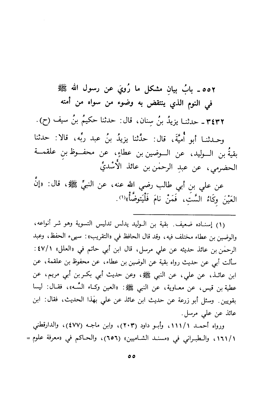 3432 - حَدَّثَنَا: يَزِيدُ بْنُ سِنَانٍ قَالَ: حَدَّثَنَا حَكِيمُ بْنُ سَيْفٍ ح وَحَدَّثنا أَبُو أُمَيَّةَ قَالَ: حَدَّثَنَا يَزِيدُ بْنُ عَبْدِ رَبِّهِ قَالَا: حَدَّثَنَا بَقِيَّةُ بْنُ الْوَلِيدِ , عَنِ الْوَضِينِ بْنِ عَطَاءٍ , عَنْ مَحْفُوظِ بْنِ عَلْقَمَةَ الْحَضْرَمِيِّ , عَنْ عَبْدِ الرَّحْمَنِ بْنِ عَائِذٍ الْأَسَدِيِّ , عَنْ عَلِيِّ بْنِ أَبِي طَالِبٍ رَضِيَ اللهُ عَنْهُ عَنِ النَّبِيِّ صَلَّى اللَّهُ عَلَيْهِ وَسَلَّمَ قَالَ: " إِنَّ الْعَيْنَ وِكَاءُ السَّتِ , فَمَنْ نَامَ فَلْيَتَوَضَّأْ " -[56]- قَالَ أَبُو جَعْفَرٍ: هَكَذَا يُحَدِّثُ بِهَذَا الْحَدِيثِ كُلُّ مَنْ لَقِينَاهُ مِنْ أَهْلِ الْحَدِيثِ يَقُولُونَ: هُوَ وِكَاءُ السَّتِّ , وَأَمَّا أَهْلُ الْعَرَبِيَّةِ فَيُخَالِفُونَهُمْ فِي ذَلِكَ وَيَقُولُونَ: وِكَاءُ السَّهِ. وَكَذَلِكَ ذُكِرَ لَنَا عَنْ عَلِيِّ بْنِ عَبْدِ الْعَزِيزِ عَنْ أَبِي عُبَيْدٍ الْقَاسِمِ بْنِ سَلَّامٍ قَالَ أَبُو عُبَيْدٍ: قَوْلُهُ السَّهِ: حَلْقَةُ الدُّبُرِ , وَالْوِكَاءُ: أَصْلُهُ هُوَ الْخَيْطُ أَوِ السَّيْرُ الَّذِي يُشَدُّ بِهِ رَأْسُ الْقِرْبَةِ ". فَجَعَلَ رَسُولُ اللهِ صَلَّى اللَّهُ عَلَيْهِ وَسَلَّمَ فِي الْحَدِيثِ الْمَرْوِيِّ عَنْهُ فِي ذَلِكَ يَعْنِي: حَدِيثَ عَلِيٍّ رَضِيَ اللهُ عَنْهُ الَّذِي ذَكَرْنَاهُ الْيَقَظَةُ لِلْعَيْنِ مِثْلُ الْوِكَاءِ لِلْقِرْبَةِ , يَقُولُ: فَإِذَا نَامَتِ اسْتَرْخَى ذَلِكَ الْوِكَاءُ فَكَانَ مِنْهُ الْحَدَثُ. قَالَ: وَقَالَ الشَّاعِرُ فِي السَّهِ: