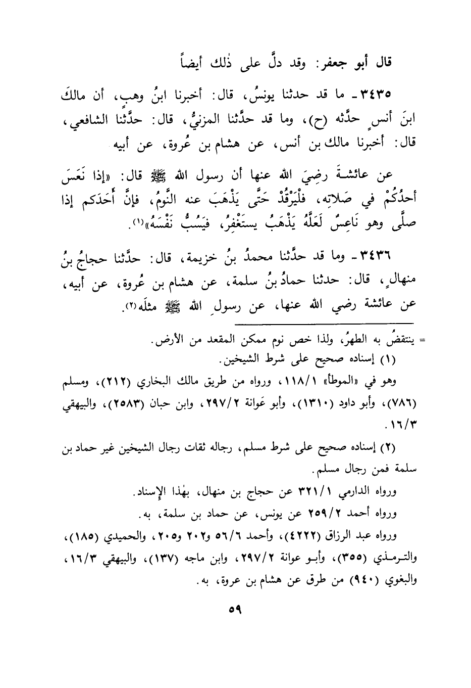 3435 - قَالَ أَبُو جَعْفَرٍ: وَقَدْ دَلَّ عَلَى ذَلِكَ أَيْضًا: مَا قَدْ حَدَّثَنَا يُونُسُ قَالَ: أَخْبَرَنَا ابْنُ وَهْبٍ أَنَّ مَالِكَ بْنَ أَنَسٍ حَدَّثَهُ ح وَمَا قَدْ حَدَّثَنَا الْمُزَنِيُّ قَالَ: حَدَّثَنَا الشَّافِعِيُّ قَالَ: حَدَّثَنَا مَالِكُ بْنُ أَنَسٍ عَنْ هِشَامِ بْنِ عُرْوَةَ عَنْ أَبِيهِ , عَنْ عَائِشَةَ رَضِيَ اللهُ عَنْهَا أَنَّ رَسُولَ اللهِ صَلَّى اللَّهُ عَلَيْهِ وَسَلَّمَ قَالَ: " إِذَا نَعَسَ أَحَدُكُمْ فِي صَلَاتِهِ فَلْيَرْقُدْ حَتَّى يَذْهَبَ عَنْهُ النَّوْمُ , فَإِنَّ أَحَدَكُمْ إِذَا صَلَّى وَهُوَ نَاعِسٌ لَعَلَّهُ يَذْهَبُ يَسْتَغْفِرُ فَيَسُبُّ نَفْسَهُ "
