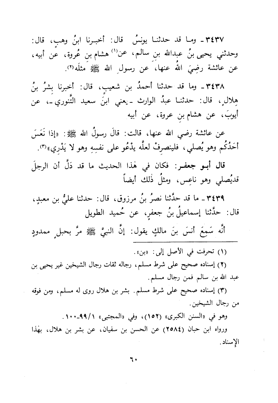 3438 - وَمَا قَدْ حَدَّثنا أَحْمَدُ بْنُ شُعَيْبٍ قَالَ: أَخْبَرَنَا بِشْرُ بْنُ هِلَالٍ قَالَ: حَدَّثَنَا عَبْدُ الْوَارِثِ - يَعْنِي: ابْنَ سَعِيدٍ التَّنُّورِيَّ عَنْ أَيُّوبَ , عَنْ هِشَامِ بْنِ عُرْوَةَ , عَنْ أَبِيهِ , عَنْ عَائِشَةَ رَضِيَ اللهُ عَنْهَا قَالَتْ: قَالَ: رَسُولُ اللهِ صَلَّى اللَّهُ عَلَيْهِ وَسَلَّمَ: " إِذَا نَعَسَ أَحَدُكُمْ وَهُوَ يُصَلِّي فَلْيَنْصَرِفْ لَعَلَّهُ يَدْعُو عَلَى نَفْسِهِ , وَهُوَ لَا يَدْرِي " قَالَ أَبُو جَعْفَرٍ: فَكَانَ فِي هَذَا الْحَدِيثِ مَا قَدْ دَلَّ أَنَّ الرَّجُلَ قَدْ يُصَلِّي وَهُوَ نَاعِسٌ وَمِثْلُ ذَلِكَ أَيْضًا: