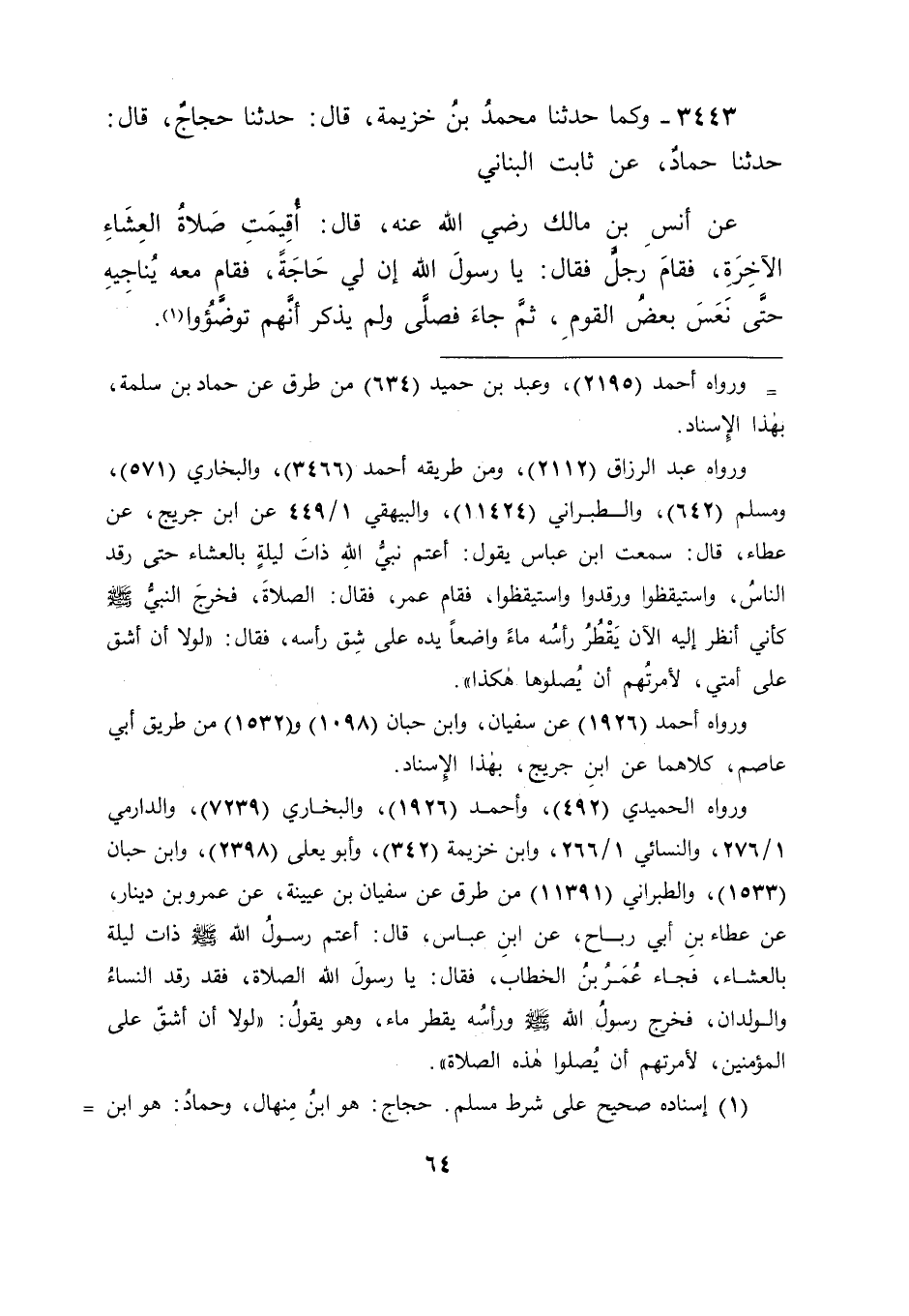 3443 - وَكَمَا حَدَّثنا مُحَمَّدُ بْنُ خُزَيْمَةَ قَالَ حَدَّثنا حَجَّاجٌ قَالَ: حَدَّثَنَا حَمَّادٌ , عَنْ ثَابِتٍ الْبُنَانِيِّ , عَنْ أَنَسِ بْنِ مَالِكٍ رَضِيَ اللهُ عَنْهُ قَالَ: " أُقِيمَتْ صَلَاةُ الْعِشَاءِ الْآخِرَةِ , فَقَامَ رَجُلٌ , فَقَالَ يَا رَسُولَ اللهِ , إِنَّ لِي حَاجَةً , فَقَامَ مَعَهُ يُنَاجِيهِ حَتَّى نَعَسَ بَعْضُ الْقَوْمِ , ثُمَّ جَاءَ فَصَلَّى " وَلَمْ يَذْكُرْ أَنَّهُمْ تَوَضَّئُوا