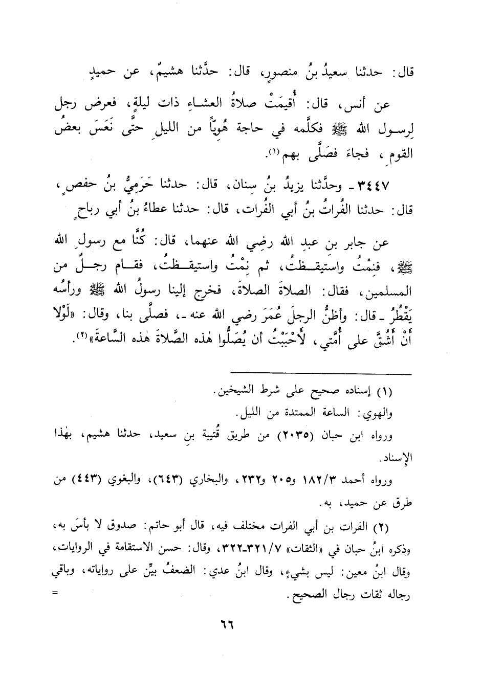 3447 - وَحَدَّثَنَا يَزِيدُ بْنُ سِنَانٍ قَالَ: حَدَّثَنَا حَرَمِيُّ بْنُ حَفْصٍ قَالَ: حَدَّثَنَا الْفُرَاتُ بْنُ أَبِي الْفُرَاتِ قَالَ: حَدَّثَنَا عَطَاءُ بْنُ أَبِي رَبَاحٍ , عَنْ جَابِرِ بْنِ عَبْدِ اللهِ رَضِيَ اللهُ عَنْهُمَا قَالَ: كُنَّا مَعَ رَسُولِ اللهِ صَلَّى اللَّهُ عَلَيْهِ وَسَلَّمَ , فَنِمْتُ وَاسْتَيْقَظْتُ , ثُمَّ نِمْتُ وَاسْتَيْقَظْتُ , فَقَامَ رَجُلٌ مِنَ الْمُسْلِمِينَ فَقَالَ: " الصَّلَاةَ الصَّلَاةَ " , فَخَرَجَ إِلَيْنَا رَسُولُ اللهِ صَلَّى اللَّهُ عَلَيْهِ وَسَلَّمَ وَرَأْسُهُ يَقْطُرُ , قَالَ: وَأَظُنُّ الرَّجُلَ عُمَرَ رَضِيَ اللهُ عَنْهُ , فَصَلَّى بِنَا وَقَالَ: " لَوْلَا أَنْ أَشُقَّ عَلَى أُمَّتِي لَأَحْبَبْتُ أَنْ يُصَلُّوا هَذِهِ الصَّلَاةَ هَذِهِ السَّاعَةَ "