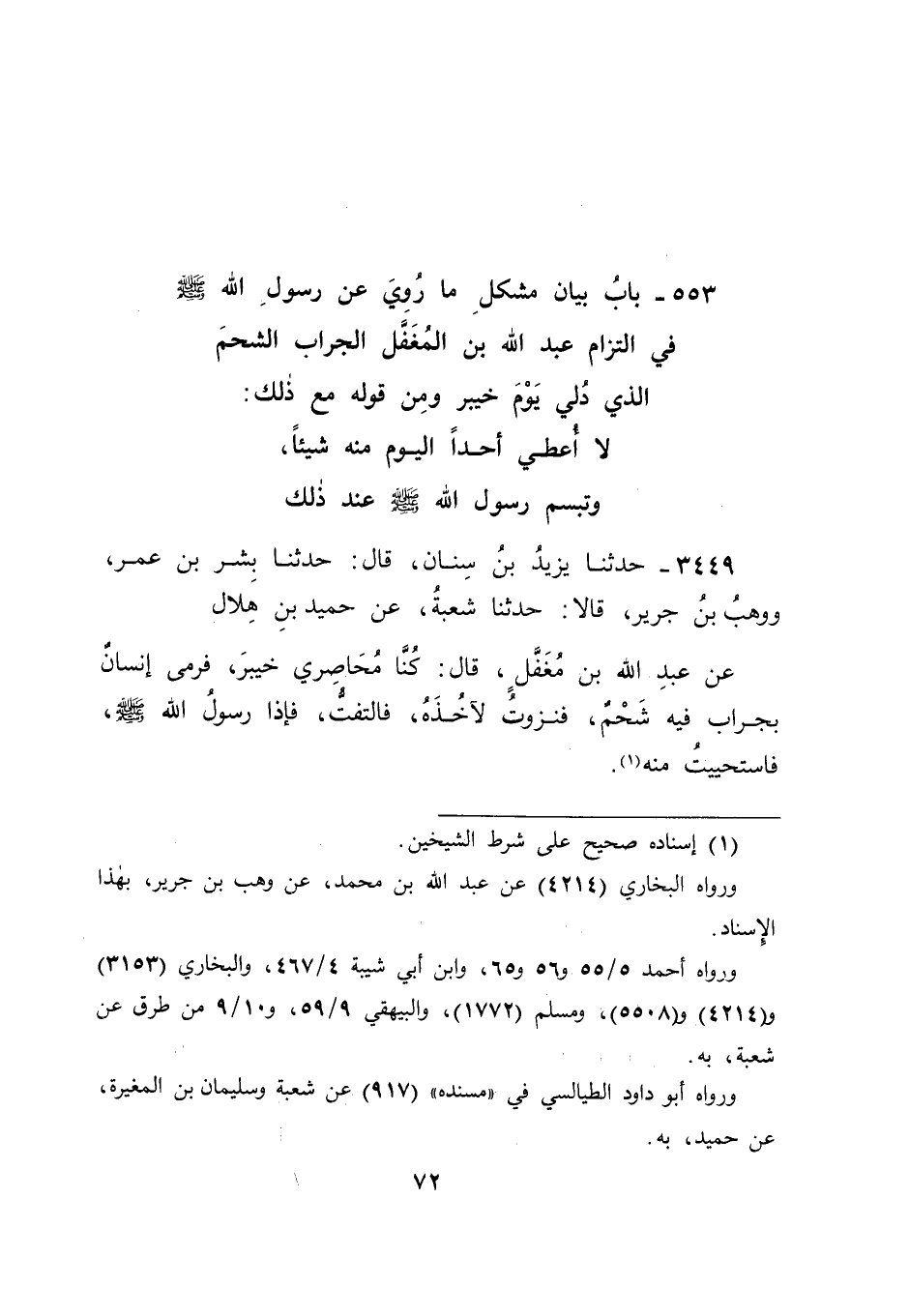 3449 - حَدَّثَنَا يَزِيدُ بْنُ سِنَانٍ قَالَ: حَدَّثَنَا بِشْرُ بْنُ عُمَرَ , وَوَهْبُ بْنُ جَرِيرٍ قَالَا حَدَّثَنَا شُعْبَةُ , عَنْ حُمَيْدِ بْنِ هِلَالٍ , عَنْ عَبْدِ اللهِ بْنِ مُغَفَّلٍ قَالَ: " كُنَّا مُحَاصِرِي خَيْبَرَ فَرَمَى إِنْسَانٌ بِجِرَابٍ فِيهِ شَحْمٌ , فَنَزَوْتُ لِآخُذَهُ , فَالْتَفَتُّ فَإِذَا رَسُولُ اللهِ صَلَّى اللَّهُ عَلَيْهِ وَسَلَّمَ , فَاسْتَحْيَيْتُ مِنْهُ " -[73]- قَالَ أَبُو جَعْفَرٍ: وَأَتَيْنَا بِهَذَا الْحَدِيثِ , وَإِنْ كَانَ لَيْسَ فِيهِ الْمَعْنَى الَّذِي تَرْجَمْنَا هَذَا الْبَابَ بِهِ ; لَأَنْ لَا يَظُنَّ أَحَدٌ أَنَّهُ سَقَطَ عَنَّا مِنْ حَدِيثِ شُعْبَةَ.