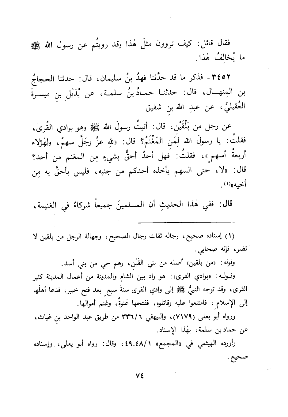 3452 - فَذَكَرَ مَا قَدْ حَدَّثَنَا فَهْدُ بْنُ سُلَيْمَانَ قَالَ: حَدَّثَنَا الْحَجَّاجُ بْنُ الْمِنْهَالِ قَالَ: حَدَّثَنَا حَمَّادُ بْنُ سَلَمَةَ , عَنْ بُدَيْلِ بْنِ مَيْسَرَةَ الْعُقَيْلِيِّ , عَنْ عَبْدِ اللهِ بْنِ شَقِيقٍ , عَنْ رَجُلٍ مِنْ بُلْقِينَ قَالَ: " أَتَيْتُ رَسُولَ اللهِ صَلَّى اللَّهُ عَلَيْهِ وَسَلَّمَ وَهُوَ بِوَادِي الْقُرَى فَقُلْتُ: يَا رَسُولَ اللهِ , لِمَنِ الْمَغْنَمُ؟ , قَالَ: " لِلَّهِ عَزَّ وَجَلَّ سَهْمٌ , وَلِهَؤُلَاءِ أَرْبَعَةُ أَسْهُمٍ: " فَقُلْتُ: فَهَلْ أَحَدٌ أَحَقُّ بِشَيْءٍ مِنَ الْمَغْنَمِ مِنْ أَحَدٍ؟ قَالَ: " لَا , حَتَّى السَّهْمَ يَأْخُذُ أَحَدُكُمْ مِنْ جَنْبِهِ , فَلَيْسَ بِأَحَقَّ بِهِ مِنْ أَخِيهِ " قَالَ: فَفِي هَذَا الْحَدِيثِ: أَنَّ الْمُسْلِمِينَ جَمِيعًا شُرَكَاءُ فِي الْغَنِيمَةِ , -[75]- وَأَنَّ بَعْضَهُمْ لَيْسَ بِأَوْلَى بِشَيْءٍ مِنْهَا مِنْ بَقِيَّتِهِمْ , وَحَدِيثُ ابْنِ الْمُغَفَّلِ الَّذِي رُوِّيتُمُوهُ مُخَالِفٌ لِهَذَا. فَكَانَ جَوَابُنَا لَهُ فِي ذَلِكَ بِتَوْفِيقِ اللهِ عَزَّ وَجَلَّ وَعَوْنِهِ أَنَّ احْتِجَاجَهُ عَلَيْنَا بِهَذَا الْحَدِيثِ قَدْ بَانَ جَهْلُهُ بِصَحِيحِ الْحَدِيثِ مِنْ فَاسِدِهِ , وَأَنَّهُ مِمَّنْ لَا تَمْيِيزَ مَعَهُ بَيْنَهُمَا ; لِأَنَّ هَذَا الْحَدِيثَ , وَإِنْ كَانَ حَمَّادُ بْنُ سَلَمَةَ قَدْ رَوَاهُ عَنْ بُدَيْلِ بْنِ مَيْسَرَةَ , عَنْ عَبْدِ اللهِ بْنِ شَقِيقٍ , عَنْ رَجُلٍ مِنْ بُلْقِينَ عَنِ النَّبِيِّ صَلَّى اللَّهُ عَلَيْهِ وَسَلَّمَ فَاحْتَمَلَ ذَلِكَ , وَإِنْ كَانَ رَاوِيهِ غَيْرَ مُسَمًّى لِقَاءَهُ رَسُولَ اللهِ صَلَّى اللَّهُ عَلَيْهِ وَسَلَّمَ وَأَخْذَهُ عَنْهُ فَإِنَّ ابْنَ الْمُبَارَكِ رَوَاهُ عَنْ خَالِدٍ الْحَذَّاءِ , عَنْ عَبْدِ اللهِ بْنِ شَقِيقٍ , عَنْ رَجُلٍ عَنْ رَجُلٍ مِنْ بُلْقِينَ , عَنْ رَسُولِ اللهِ صَلَّى اللَّهُ عَلَيْهِ وَسَلَّمَ.