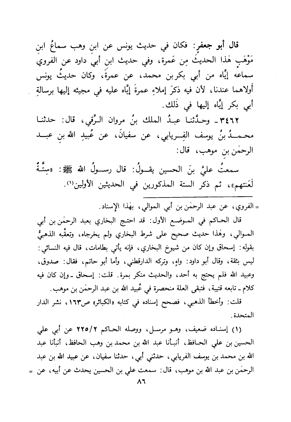 3462 - وَحَدَّثَنَا عَبْدُ الْمَلِكِ بْنُ مَرْوَانَ الرَّقِّيُّ قَالَ: حَدَّثَنَا مُحَمَّدُ بْنُ يُوسُفَ الْفِرْيَابِيُّ , عَنْ سُفْيَانَ , عَنْ عُبَيْدِ اللهِ بْنِ عَبْدِ الرَّحْمَنِ بْنِ مَوْهَبٍ قَالَ: سَمِعْتُ عَلِيَّ بْنَ الْحُسَيْنِ يَقُولُ: قَالَ رَسُولُ اللهِ صَلَّى اللَّهُ عَلَيْهِ وَسَلَّمَ: " سِتَّةٌ لَعَنْتُهُمْ " ثُمَّ ذَكَرَ السِّتَّةَ الْمَذْكُورِينَ فِي الْحَدِيثَيْنِ الْأَوَّلَيْنِ -[87]- قَالَ أَبُو جَعْفَرٍ: فَكَانَ فِي هَذَا الْحَدِيثِ أَخْذُ ابْنِ مَوْهَبٍ إِيَّاهُ عَنْ عَلِيِّ بْنِ الْحُسَيْنِ , لَا عَنْ عَمْرَةَ , وَلَا عَنْ غَيْرِهَا , وَكَانَ الثَّوْرِيُّ هُوَ الْحُجَّةُ فِي ذَلِكَ , وَالْأَوْلَى أَنْ تُقْبَلَ رِوَايَتُهُ فِيهِ عَنِ ابْنِ مَوْهَبٍ لِسِنِّهِ وَضَبْطِهِ وَحِفْظِهِ , غَيْرَ أَنَّ ابْنَ أَبِي الْمَوَالِ ذَكَرَ الْقِصَّةَ الَّتِي ذَكَرَهَا فِيهِ مِنْ بَعْثِهِ أَبِي بَكْرِ بْنِ حَزْمٍ إِيَّاهُ إِلَى عَمْرَةَ فِي ذَلِكَ , وَإِمْلَاءِ عَمْرَةَ إِيَّاهُ عَلَيْهِ عَنْ عَائِشَةَ , فَقَوِيَ فِي الْقُلُوبِ لِذَلِكَ , وَاحْتَمَلَ أَنْ يَكُونَ ابْنُ مَوْهَبٍ أَخَذَهُ عَنْ عَمْرَةَ عَلَى مَا حَدَّثَ بِهِ عَنْهَا , وَأَخَذَهُ مَعَ ذَلِكَ عَنْ عَلِيِّ بْنِ الْحُسَيْنِ عَلَى مَا حَدَّثَ بِهِ عَنْهُ مِمَّا قَدْ ذَكَرَهُ عَنْهُ الثَّوْرِيُّ , وَاللهُ عَزَّ وَجَلَّ أَعْلَمُ بِحَقِيقَةِ الْأَمْرِ فِي ذَلِكَ. ثُمَّ تَأَمَّلْنَا مَتْنَ هَذَا الْحَدِيثِ , فَكَانَ الَّذِي فِيهِ مِنْ ذِكْرِ الْجَبَرُوتِ اشْتِقَاقَ ذَلِكَ مِنَ الْجَبْرِيَّةِ كَمَا اشْتَقُّوا الْمَلَكُوتَ مِنَ الْمُلْكِ , وَكَانَ الَّذِي فِيهِ مِنَ اسْتِحْلَالِ حُرَمِ اللهِ عَزَّ وَجَلَّ هُوَ أَنْ يُجْعَلَ كَمَا سِوَاهُ مِمَّا لَمْ يُحَرِّمْهُ مِنْ بِلَادِهِ , إِذْ كَانَ قَدْ أَبَانَهُ بِتَحْرِيمِهِ إِيَّاهُ مِنْ سَائِرِ بِلَادِهِ سِوَاهُ , مِنْ مَنْعِ عِبَادِهِ مِنْ دُخُولِهِ إِلَّا مُحْرِمِينَ إِمَّا بِالْحَجِّ , وَإِمَّا بِالْعُمْرَةِ , وَمِنْ تَحْرِيمِ صَيْدِهِ , وَمِنْ أَمَانِهِ مَنْ دَخَلَهُ , بِقَوْلِ اللهِ عَزَّ وَجَلَّ: {وَمَنْ دَخَلَهُ كَانَ آمِنًا} [آل عمران: 97] , وَبِتَحْرِيمِهِ عِضَاهَهُ الْحُرْمَةَ الَّتِي لَمْ يَجْعَلْهَا كَعِضَاهِ غَيْرِهِ , وَمِنْ مَنْعِهِ الْقِتَالَ فِيهِ مَنْ لَا يَجِبُ قِتَالُهُ ; لِأَنَّهُ قَدْ أَعْلَمَنَا عَزَّ وَجَلَّ عَلَى لِسَانِ رَسُولِهِ أَنَّ مَكَّةَ لَا تُغْزَى بَعْدَ الْعَامِ الَّذِي غَزَاهُ , -[88]- وَأَنَّهُ لَا يُقْتَلُ قُرَشِيُّ بَعْدَ عَامِهِ ذَلِكَ صَبْرًا , أَيْ لَا يَكْفُرُ أَهْلُهَا بَعْدَ ذَلِكَ الْعَامِ فَيُغْزَوْنَ كَمَا غُزُوا فِي ذَلِكَ الْعَامِ , وَلَا يَكْفُرُ قُرَشِيُّ بَعْدَ ذَلِكَ الْعَامِ الْكُفْرَ الَّذِي أَبَاحَ دِمَاءَ أَهْلِهَا الْقُرَشِيِّينَ فِي ذَلِكَ الْعَامِ , فَمَنْ أَنْزَلَ الْحَرَمَ بِخِلَافِ تِلْكَ الْمَنْزِلَةِ كَانَ بِهِ مَلْعُونًا , وَكَانَ قَوْلُهُ: " وَالْمُسْتَحِلُّ مِنْ عِتْرَتِي مَا حَرَّمَ اللهُ عَزَّ وَجَلَّ " , وَعِتْرَتُهُ هُمْ أَهْلُ بَيْتِهِ الَّذِينَ عَلَى دِينِهِ , وَعَلَى التَّمَسُّكِ بِأَمْرِهِ , كَمِثْلِ مَا قَدْ ذَكَرْنَاهُ فِيمَا تَقَدَّمَ مِنَّا فِي كِتَابِنَا هَذَا مِمَّا كَانَ مِنْهُ صَلَّى اللَّهُ عَلَيْهِ وَسَلَّمَ بِغَدِيرِ خُمٍّ مِنْ قَوْلِهِ لِلنَّاسِ: " إِنِّي تَارِكٌ فِيكُمُ الثَّقَلَيْنِ: كِتَابَ اللهِ عَزَّ وَجَلَّ وَعِتْرَتِي " , وَمِمَّا رُوِيَ عَنْهُ فِي ذَلِكَ مِمَّا لَمْ يَكُنْ ذَكَرْنَاهُ هُنَاكَ.