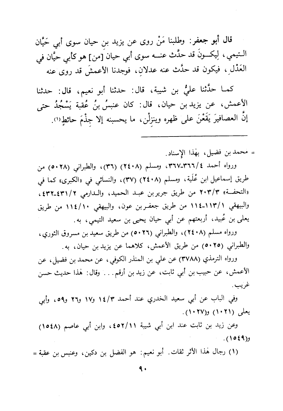 كَمَا حَدَّثَنَا عَلِيُّ بْنُ شَيْبَةَ قَالَ: حَدَّثَنَا أَبُو نُعَيْمٍ قَالَ: حَدَّثَنَا الْأَعْمَشُ , عَنْ يَزِيدَ بْنِ حَيَّانَ قَالَ: كَانَ عَنْبَسُ بْنُ عُقْبَةَ يَسْجُدُ حَتَّى إِنَّ الْعَصَافِيرَ يَقَعْنَ عَلَى ظَهْرِهِ وَيَنْزِلْنَ , مَا يَحْسِبْنَهُ إِلَّا جِذْمَ حَائِطٍ " -[91]- وَمَا قَدْ حَدَّثَنَا فَهْدٌ قَالَ: حَدَّثَنَا أَبُو نُعَيْمٍ فَذَكَرَ بِإِسْنَادِهِ مِثْلَهُ قَالَ أَبُو جَعْفَرٍ: فَاجْتَمَعَ فِي الرِّوَايَةِ عَنْهُ الْأَعْمَشُ وَأَبُو حَيَّانَ , فَمَنْ أَخْرَجَ عِتْرَةَ رَسُولِ اللهِ صَلَّى اللَّهُ عَلَيْهِ وَسَلَّمَ وَعَلَيْهِمْ مِنَ الْمَكَانِ الَّذِي جَعَلَهُمُ اللهُ بِهِ عَلَى لِسَانِ نَبِيِّهِ صَلَّى اللَّهُ عَلَيْهِ وَسَلَّمَ مِمَّا قَدْ ذَكَرْنَاهُ فِي هَذِهِ الْآثَارِ فَجَعَلَهُمْ كَسِوَاهُمْ مِمَّنْ لَيْسَ مِنْ أَهْلِ عِتْرَتِهِ كَانَ مَلْعُونًا؛ إِذْ كَانَ قَدْ خَالَفَ رَسُولَ اللهِ صَلَّى اللَّهُ عَلَيْهِ وَسَلَّمَ فِيمَا فَعَلَ مِنْ ذَلِكَ , وَسَائِرُ مَا فِي هَذَا الْحَدِيثِ سِوَى ذَلِكَ مَكْشُوفُ الْمَعَانِي , يَعْلَمُ سَامِعُوهُ مَا أُرِيدَ بِهِ عِلْمًا يُغْنِينَا عَنِ التَّفْسِيرِ لَهُ , وَاللهَ عَزَّ وَجَلَّ نَسْأَلُهُ التَّوْفِيقَ.