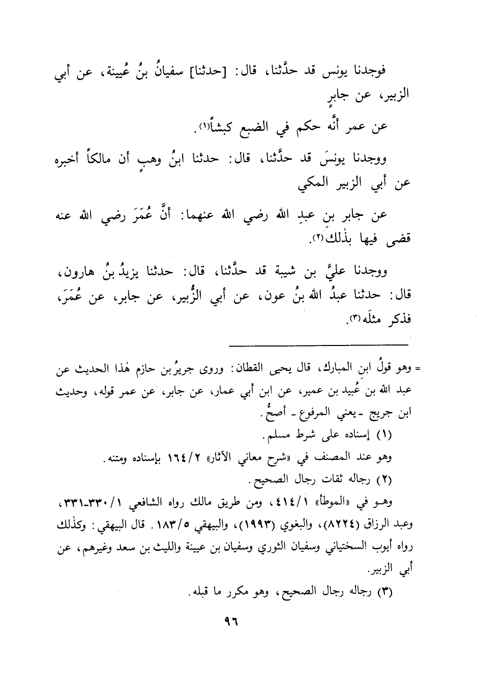 فَوَجَدْنَا يُونُسَ قَدْ حَدَّثَنَا قَالَ: حَدَّثَنَا سُفْيَانُ بْنُ عُيَيْنَةَ , عَنْ أَبِي الزُّبَيْرِ , عَنْ جَابِرٍ , عَنْ عُمَرَ " أَنَّهُ حَكَمَ فِي الضَّبُعِ كَبْشًا " وَوَجَدْنَا يُونُسَ قَدْ حَدَّثَنَا قَالَ: حَدَّثَنَا ابْنُ وَهْبٍ أَنَّ مَالِكًا أَخْبَرَهُ , عَنْ أَبِي الزُّبَيْرِ الْمَكِّيِّ , عَنْ جَابِرِ بْنِ عَبْدِ اللهِ رَضِيَ اللهُ عَنْهُمَا " أَنَّ عُمَرَ رَضِيَ اللهُ عَنْهُ قَضَى فِيهَا بِذَلِكَ " وَوَجَدْنَا عَلِيَّ بْنَ شَيْبَةَ قَدْ حَدَّثَنَا قَالَ: حَدَّثَنَا يَزِيدُ بْنُ هَارُونَ قَالَ حَدَّثَنَا عَبْدُ اللهِ بْنُ عَوْنٍ , عَنْ أَبِي الزُّبَيْرِ , عَنْ جَابِرٍ , عَنْ عُمَرَ , فَذَكَرَ مِثْلَهُ -[97]- قَالَ أَبُو جَعْفَرٍ: فَقَوَّى مَا رَوَاهُ عَلَيْهِ أَبُو الزُّبَيْرِ هَذَا الْحَدِيثَ مَا قَالَهُ يَحْيَى بْنُ سَعِيدٍ فِيهِ. فَقَالَ قَائِلٌ: فَقَدْ وَجَدْنَاهُ عَنْ عَطَاءِ بْنِ أَبِي رَبَاحٍ , عَنْ جَابِرٍ عَنِ النَّبِيِّ صَلَّى اللَّهُ عَلَيْهِ وَسَلَّمَ , لَا عَنْ عُمَرَ , فَكَانَ: فِي ذَلِكَ تَسْدِيدٌ لِمَا رَوَاهُ ابْنُ أَبِي عَمَّارٍ عَلَيْهِ