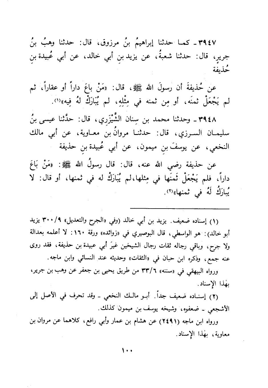3948 - وَحَدَّثَنَا مُحَمَّدُ بْنُ سِنَانٍ الشَّيْزَرِيُّ، قَالَ: حَدَّثَنَا عِيسَى بْنُ سُلَيْمَانَ السَّرَزِيُّ، قَالَ: حَدَّثَنَا مَرْوَانُ بْنُ مُعَاوِيَةَ، عَنْ أَبِي مَالِكٍ النَّخَعِيِّ، عَنْ يُوسُفَ بْنِ مَيْمُونٍ، عَنْ أَبِي عُبَيْدَةَ بْنِ حُذَيْفَةَ، عَنْ حُذَيْفَةَ رَضِيَ اللهُ عَنْهُ، قَالَ: قَالَ رَسُولُ اللهِ صَلَّى اللَّهُ عَلَيْهِ وَسَلَّمَ: " مَنْ بَاعَ دَارًا، فَلَمْ يَجْعَلْ ثَمَنَهَا فِي مِثْلِهَا، لَمْ يُبَارَكْ لَهُ فِي ثَمَنِهَا، أَوْ قَالَ: لَا يُبَارَكُ لَهُ فِي ثَمَنِهَا "