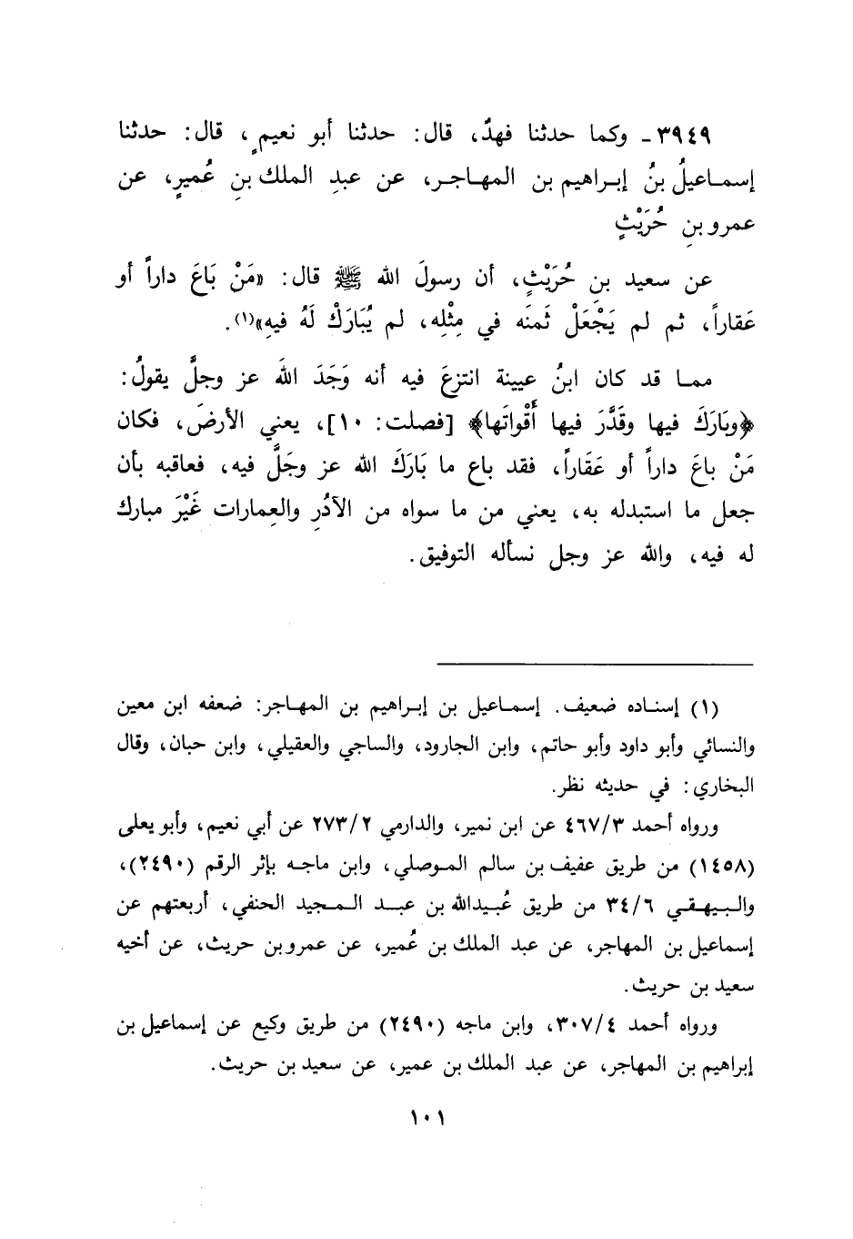 3949 - وَكَمَا حَدَّثَنَا فَهْدٌ، قَالَ: حَدَّثَنَا أَبُو نُعَيْمٍ، قَالَ: حَدَّثَنَا إِسْمَاعِيلُ بْنُ إِبْرَاهِيمَ بْنِ الْمُهَاجِرِ، عَنْ عَبْدِ الْمَلِكِ بْنِ عُمَيْرٍ، عَنْ عَمْرِو بْنِ حُرَيْثٍ، عَنْ سَعِيدِ بْنِ حُرَيْثٍ أَنَّ رَسُولَ اللهِ صَلَّى اللَّهُ عَلَيْهِ وَسَلَّمَ قَالَ: " مَنْ بَاعَ دَارًا أَوْ عَقَارًا، ثُمَّ لَمْ يَجْعَلْ ثَمَنَهُ فِي مِثْلِهِ، لَمْ يُبَارَكْ لَهُ فِيهِ " مِمَّا قَدْ كَانَ ابْنُ عُيَيْنَةَ انْتَزَعَ فِيهِ أَنَّهُ وَجَدَ اللهَ عَزَّ وَجَلَّ يَقُولُ: {وَبَارَكَ فِيهَا وَقَدَّرَ فِيهَا أَقْوَاتَهَا} [فصلت: 10] يَعْنِي الْأَرْضَ، فَكَانَ مَنْ بَاعَ دَارًا أَوْ عَقَارًا، فَقَدْ بَاعَ مَا بَارَكَ اللهُ عَزَّ وَجَلَّ فِيهِ، فَعَاقَبَهُ بِأَنْ جَعَلَ مَا اسْتَبْدَلَهُ بِهِ، يَعْنِي مِنْ مَا سِوَاهُ مِنَ الْآدُرِ وَالْعِمَارَاتِ غَيْرَ مُبَارَكٍ لَهُ فِيهِ، وَاللهَ عَزَّ وَجَلَّ نَسْأَلُهُ التَّوْفِيقَ