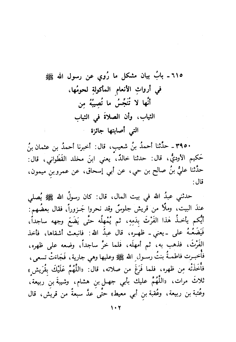 3950 - حَدَّثَنَا أَحْمَدُ بْنُ شُعَيْبٍ، قَالَ: أَخْبَرَنَا أَحْمَدُ بْنُ عُثْمَانَ بْنِ حَكِيمٍ الْأَوْدِيُّ، قَالَ: حَدَّثَنَا خَالِدٌ يَعْنِي ابْنَ مَخْلَدٍ الْقَطَوَانِيَّ، قَالَ: حَدَّثَنَا عَلِيُّ بْنُ صَالِحِ بْنِ حَيٍّ، عَنْ أَبِي إِسْحَاقَ، عَنْ عَمْرِو بْنِ مَيْمُونٍ، قَالَ: حَدَّثَنِي عَبْدُ اللهِ فِي بَيْتِ الْمَالِ قَالَ: كَانَ رَسُولُ اللهِ صَلَّى اللَّهُ عَلَيْهِ وَسَلَّمَ يُصَلِّي عِنْدَ الْبَيْتِ، وَمَلَأٌ مِنْ قُرَيْشٍ جُلُوسٌ وَقَدْ نَحَرُوا جَزُورًا، فَقَالَ بَعْضُهُمْ: أَيُّكُمْ يَأْخُذُ هَذَا الْفَرْثَ بِدَمِهِ، ثُمَّ يُمْهِلُهُ حَتَّى يَضَعَ وَجْهَهُ سَاجِدًا، فَيَضَعَهُ عَلَى يَعْنِي ظَهْرَهُ، قَالَ عَبْدُ اللهِ: فَانْبَعَثَ أَشْقَاهَا، فَأَخَذَ الْفَرْثَ، فَذَهَبَ بِهِ، ثُمَّ أَمْهَلَهُ، فَلَمَّا خَرَّ سَاجِدًا، وَضَعَهُ عَلَى ظَهْرِهِ، فَأُخْبِرَتْ فَاطِمَةُ بِنْتُ رَسُولِ اللهِ صَلَّى اللَّهُ عَلَيْهِ وَسَلَّمَ وَعَلَيْهَا، وَهِيَ جَارِيَةٌ، فَجَاءَتْ تَسْعَى، فَأَخَذَتْهُ مِنْ ظَهْرِهِ، فَلَمَّا فَرَغَ مِنْ صَلَاتِهِ، قَالَ: " اللهُمَّ عَلَيْكَ بِقُرَيْشٍ " ثَلَاثَ مَرَّاتٍ " اللهُمَّ عَلَيْكَ بِأَبِي جَهْلِ بْنِ هِشَامٍ، وَشَيْبَةَ بْنِ رَبِيعَةَ، وَعُتْبَةَ بْنِ رَبِيعَةَ، وَعُقْبَةَ بْنِ أَبِي مُعَيْطٍ " حَتَّى عَدَّ سَبْعَةً مِنْ قُرَيْشٍ، قَالَ -[103]- عَبْدُ اللهِ: فَوَالَّذِي أَنْزَلَ الْكِتَابَ، لَقَدْ رَأَيْتُهُمْ جَمِيعًا يَوْمَ بَدْرٍ فِي قَلِيبٍ وَاحِدٍ " قَالَ أَبُو جَعْفَرٍ: فَفِي هَذَا الْحَدِيثِ وَضَعَ الشَّقِيُّ الْمَذْكُورُ فِيهِ عَلَى ظَهْرِ رَسُولِ اللهِ صَلَّى اللَّهُ عَلَيْهِ وَسَلَّمَ وَهُوَ سَاجِدٌ الْفَرْثَ وَالدَّمَ اللَّذَيْنِ وَضَعَهُمَا عَلَيْهِ، وَتَمَادَى رَسُولُ اللهِ صَلَّى اللَّهُ عَلَيْهِ وَسَلَّمَ بَعْدَ ذَلِكَ عَلَى صَلَاتِهِ حَتَّى أَتَمَّهَا فَقَالَ قَائِلُونَ: فَفِي هَذَا دَلِيلٌ أَنَّ أَرْوَاثَ مَا يُؤْكَلُ لَحْمُهُ لَا يُفْسِدُ الصَّلَاةَ بِالثَّوْبِ الَّذِي أَصَابَتْهُ، وَلَا بِإِصَابَتِهِ الْأَبْدَانَ، وَأَنَّهُ بِخِلَافِ النَّجَاسَاتِ مِنَ الدِّمَاءِ الْمَسْفُوحَاتِ مِنَ الْأَنْعَامِ وَمِنْ مَا سِوَاهَا، وَبِخِلَافِ أَرْوَاثِ مَا لَا يُؤْكَلُ لَحْمُهُ مِنَ الْحَمِيرِ وَالْبِغَالِ، وَبِخِلَافِ غَائِطِ بَنِي آدَمَ وَأَبْوَالِهِمْ، وَتَعَلَّقُوا فِي ذَلِكَ بِمَا رُوِيَ عَنْ عَبْدِ اللهِ بْنِ مَسْعُودٍ مِنِ امْتِثَالِهِ ذَلِكَ مِنْ نَفْسِهِ بَعْدَ رَسُولِ اللهِ صَلَّى اللَّهُ عَلَيْهِ وَسَلَّمَ