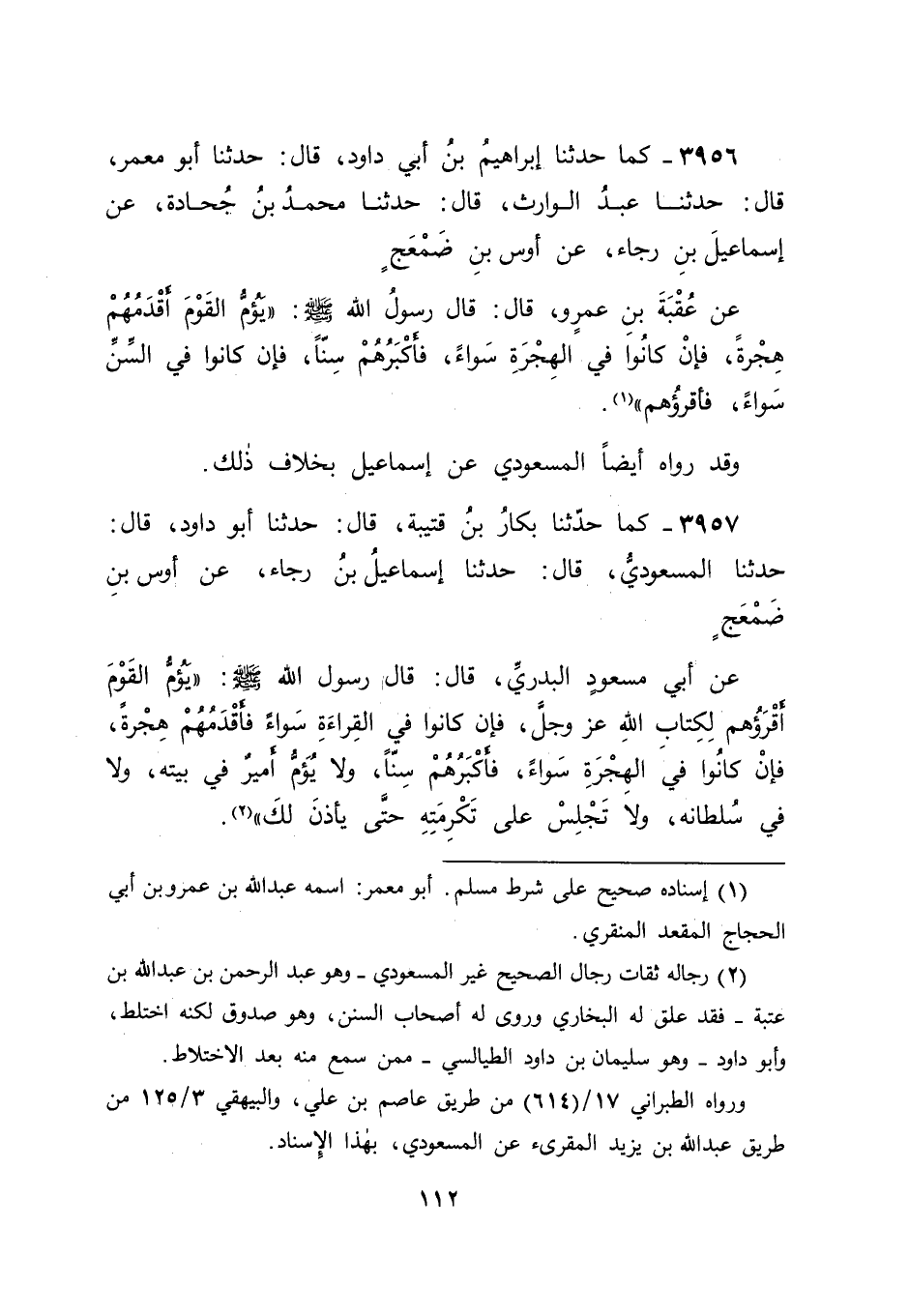 3957 - كَمَا حَدَّثَنَا بَكَّارُ بْنُ قُتَيْبَةَ، قَالَ: حَدَّثَنَا أَبُو دَاوُدَ، قَالَ: حَدَّثَنَا الْمَسْعُودِيُّ، قَالَ: حَدَّثَنَا إِسْمَاعِيلُ بْنُ رَجَاءٍ، عَنْ أَوْسِ بْنِ ضَمْعَجٍ، عَنْ أَبِي مَسْعُودٍ الْبَدْرِيِّ، قَالَ: قَالَ رَسُولُ اللهِ صَلَّى اللَّهُ عَلَيْهِ وَسَلَّمَ: " يَؤُمُّ الْقَوْمَ أَقْرَؤُهُمْ لِكِتَابِ اللهِ عَزَّ وَجَلَّ، فَإِنْ كَانُوا فِي الْقِرَاءَةِ سَوَاءً فَأَقْدَمُهُمْ هِجْرَةً، فَإِنْ كَانُوا فِي الْهِجْرَةِ سَوَاءً فَأَكْبَرُهُمْ سِنًّا، وَلَا يُؤَمُّ أَمِيرٌ فِي بَيْتِهِ، وَلَا فِي سُلْطَانِهِ، وَلَا تَجْلِسْ عَلَى تَكْرِمَتِهِ حَتَّى يَأْذَنَ لَكَ " -[113]- وَقَدْ رَوَاهُ أَيْضًا شُعْبَةُ عَنْ إِسْمَاعِيلَ بِخِلَافِ ذَلِكَ