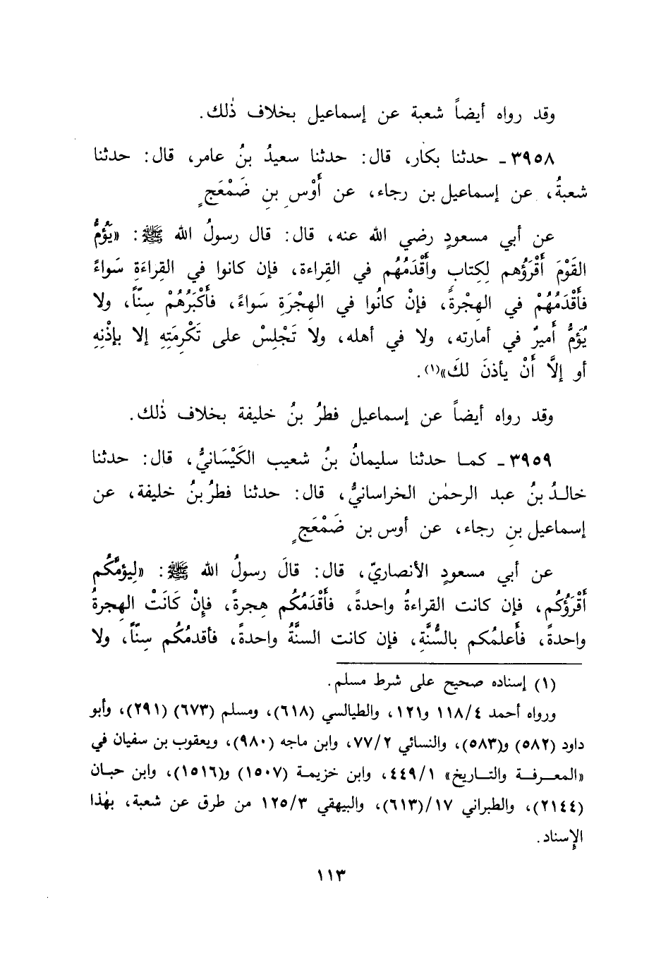 3958 - حَدَّثَنَا بَكَّارٌ، قَالَ: حَدَّثَنَا سَعِيدُ بْنُ عَامِرٍ، قَالَ: حَدَّثَنَا شُعْبَةُ، عَنْ إِسْمَاعِيلَ بْنِ رَجَاءٍ، عَنْ أَوْسِ بْنِ ضَمْعَجٍ، عَنْ أَبِي مَسْعُودٍ رَضِيَ اللهُ عَنْهُ، قَالَ: قَالَ رَسُولُ اللهِ صَلَّى اللَّهُ عَلَيْهِ وَسَلَّمَ: " يَؤُمُّ الْقَوْمَ أَقْرَؤُهُمْ لِكِتَابِ اللهِ وَأَقْدَمُهُمْ فِي الْقِرَاءَةِ، فَإِنْ كَانُوا فِي الْقِرَاءَةِ سَوَاءً فَأَقْدَمُهُمْ فِي الْهِجْرَةِ، فَإِنْ كَانُوا فِي الْهِجْرَةِ سَوَاءً فَأَكْبَرُهُمْ سِنًّا، وَلَا يُؤَمُّ أَمِيرٌ فِي إِمَارَتِهِ، وَلَا فِي أَهْلِهِ، وَلَا تَجْلِسْ عَلَى تَكْرِمَتِهِ إِلَّا بِإِذْنِهِ أَوْ إِلَّا أَنْ يَأْذَنَ لَكَ " وَقَدْ رَوَاهُ أَيْضًا عَنْ إِسْمَاعِيلَ فِطْرُ بْنُ خَلِيفَةَ بِخِلَافِ ذَلِكَ