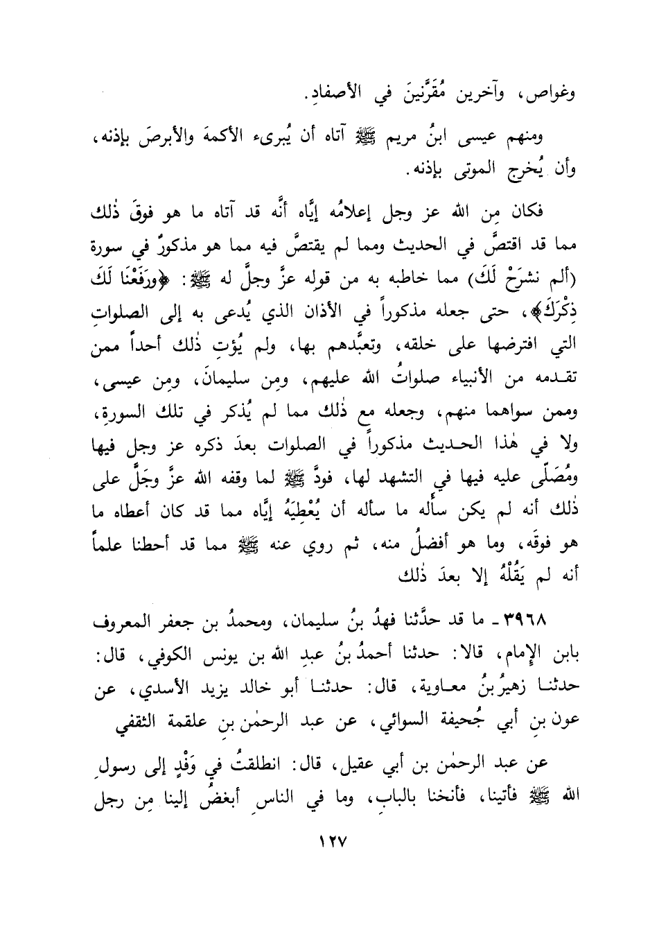 3968 - مَا قَدْ حَدَّثَنَا فَهْدُ بْنُ سُلَيْمَانَ، وَمُحَمَّدُ بْنُ جَعْفَرٍ الْمَعْرُوفُ بِابْنِ الْإِمَامِ، قَالَا: حَدَّثَنَا أَحْمَدُ بْنُ عَبْدِ اللهِ بْنِ يُونُسَ الْكُوفِيُّ، قَالَ: حَدَّثَنَا زُهَيْرُ بْنُ مُعَاوِيَةَ، قَالَ: حَدَّثَنَا أَبُو خَالِدٍ يَزِيدُ الْأَسَدِيُّ، عَنْ عَوْنِ بْنِ أَبِي جُحَيْفَةَ السُّوَائِيِّ، عَنْ عَبْدِ الرَّحْمَنِ بْنِ عَلْقَمَةَ الثَّقَفِيِّ، عَنْ عَبْدِ الرَّحْمَنِ بْنِ أَبِي عَقِيلٍ، قَالَ: انْطَلَقْتُ فِي وَفْدٍ إِلَى رَسُولِ اللهِ صَلَّى اللَّهُ عَلَيْهِ وَسَلَّمَ فَأَتَيْنَا، فَأَنَخْنَا بِالْبَابِ، وَمَا فِي النَّاسِ أَبْغَضُ إِلَيْنَا مِنْ رَجُلٍ -[128]- نَلِجُ عَلَيْهِ، فَمَا خَرَجْنَا حَتَّى مَا فِي النَّاسِ أَحَبُّ إِلَيْنَا مِنْ رَجُلٍ دَخَلْنَا عَلَيْهِ، فَقَالَ قَائِلٌ مِنَّا: يَا رَسُولَ اللهِ، أَلَا سَأَلْتَ رَبَّكَ مُلْكًا كَمُلْكِ سُلَيْمَانَ؟ قَالَ: فَضَحِكَ، ثُمَّ قَالَ: " فَلَعَلَّ لِصَاحِبِكُمْ عِنْدَ اللهِ عَزَّ وَجَلَّ أَفْضَلَ مِنْ مُلْكِ سُلَيْمَانَ، إِنَّ اللهَ لَمْ يَبْعَثْ نَبِيًّا إِلَّا أَعْطَاهُ دَعْوَةً، فَمِنْهُمْ مَنِ اتَّخَذَهَا دُنْيَا فَأُعْطِيَهَا، وَمِنْهُمْ مَنْ دَعَا بِهَا عَلَى قَوْمِهِ إِذَا عَصَوْا، فَأُهْلِكُوا بِهَا، وَإِنَّ اللهَ عَزَّ وَجَلَّ أَعْطَانِي دَعْوَةً، فَاخْتَبَأْتُهَا عِنْدَ رَبِّي عَزَّ وَجَلَّ شَفَاعَةً لِأُمَّتِي يَوْمَ الْقِيَامَةِ " فَعَقَلْنَا بِذَلِكَ أَنَّ مَنْزِلَتَهُ صَلَّى اللَّهُ عَلَيْهِ وَسَلَّمَ مِنْ رَبِّهِ عَزَّ وَجَلَّ فَوْقَ مَنْزِلَةِ سُلَيْمَانَ صَلَّى اللَّهُ عَلَيْهِ وَسَلَّمَ، ثُمَّ زَادَهُ اللهُ عَزَّ وَجَلَّ بَعْثَتَهُ إِيَّاهُ إِلَى النَّاسِ جَمِيعًا وَإِنْزَالَهُ عَلَيْهِ: {قُلْ يَا أَيُّهَا النَّاسُ إِنِّي رَسُولُ اللهِ إِلَيْكُمْ جَمِيعًا} [الأعراف: 158] وَلَمْ يَكُنْ غَيْرُهُ مِنَ الْأَنْبِيَاءِ يُبْعَثُ إِلَّا إِلَى قَوْمِهِ، أَوْ إِلَى خَاصٍّ مِنَ النَّاسِ دُونَ بَقِيَّتِهِمْ وَخَصَّهُ عَزَّ وَجَلَّ بِمَا أَتَى لَنَا بِهِ عَلَى لِسَانِهِ صَلَّى اللَّهُ عَلَيْهِ وَسَلَّمَ مِنْ قَوْلِهِ