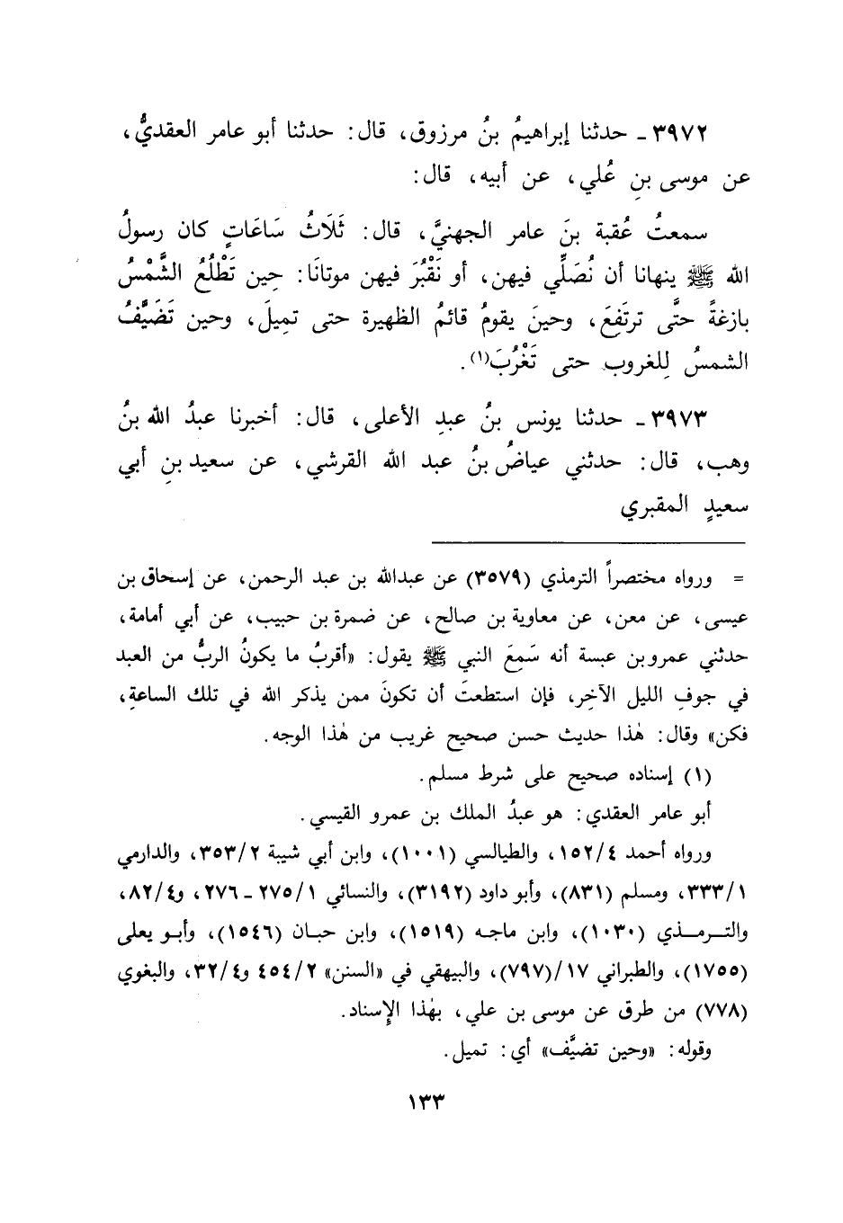 3972 - حَدَّثَنَا إِبْرَاهِيمُ بْنُ مَرْزُوقٍ، قَالَ: حَدَّثَنَا أَبُو عَامِرٍ الْعَقَدِيُّ، عَنْ مُوسَى بْنِ عَلِيٍّ، عَنْ أَبِيهِ، قَالَ: سَمِعْتُ عُقْبَةَ بْنَ عَامِرٍ الْجُهَنِيَّ، قَالَ: " ثَلَاثُ سَاعَاتٍ كَانَ رَسُولُ اللهِ صَلَّى اللَّهُ عَلَيْهِ وَسَلَّمَ يَنْهَانَا أَنْ نُصَلِّيَ فِيهِنَّ، أَوْ نَقْبُرَ فِيهِنَّ مَوْتَانَا: حِينَ تَطْلُعُ الشَّمْسُ بَازِغَةً حَتَّى تَرْتَفِعَ، وَحِينَ يَقُومُ قَائِمُ الظَّهِيرَةِ حَتَّى تَمِيلَ، وَحِينَ تَضَيَّفُ الشَّمْسُ لِلْغُرُوبِ حَتَّى تَغْرُبَ "