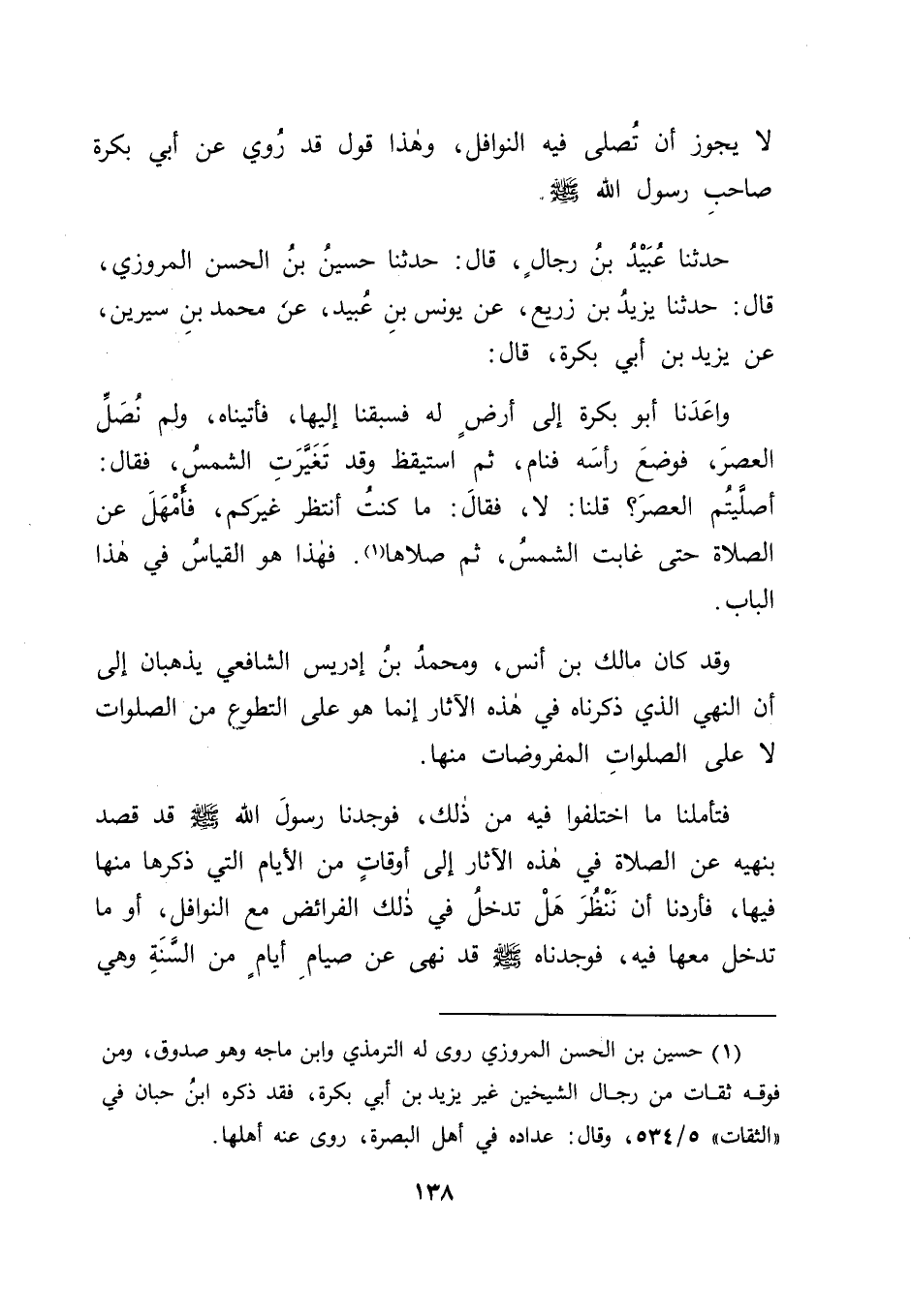 حَدَّثَنَا عُبَيْدُ بْنُ رِجَالٍ، قَالَ: حَدَّثَنَا حُسَيْنُ بْنُ الْحَسَنِ الْمَرْوَزِيُّ، قَالَ: حَدَّثَنَا يَزِيدُ بْنُ زُرَيْعٍ، عَنْ يُونُسَ بْنِ عُبَيْدٍ، عَنْ مُحَمَّدِ بْنِ سِيرِينَ، عَنْ يَزِيدَ بْنِ أَبِي بَكْرَةَ، قَالَ: " وَاعَدَنَا أَبُو بَكْرَةَ إِلَى أَرْضٍ لَهُ، فَسَبَقَنَا إِلَيْهَا، فَأَتَيْنَاهُ، وَلَمْ نُصَلِّ الْعَصْرَ، فَوَضَعَ رَأْسَهُ، فَنَامَ، ثُمَّ اسْتَيْقَظَ وَقَدْ تَغَيَّرَتِ الشَّمْسُ، فَقَالَ: أَصَلَّيْتُمُ الْعَصْرَ؟ قُلْنَا: لَا، فَقَالَ: مَا كُنْتُ أَنْتَظِرُ غَيْرَكُمْ، فَأَمْهَلَ عَنِ الصَّلَاةِ حَتَّى غَابَتِ الشَّمْسُ، ثُمَّ صَلَّاهَا " فَهَذَا هُوَ الْقِيَاسُ فِي هَذَا الْبَابِ وَقَدْ كَانَ مَالِكُ بْنُ أَنَسٍ، وَمُحَمَّدُ بْنُ إِدْرِيسَ الشَّافِعِيُّ يَذْهَبَانِ إِلَى أَنَّ النَّهْيَ الَّذِي ذَكَرْنَاهُ فِي هَذِهِ الْآثَارِ إِنَّمَا هُوَ عَلَى التَّطَوُّعِ مِنَ الصَّلَوَاتِ لَا عَلَى الصَّلَوَاتِ الْمَفْرُوضَاتِ مِنْهَا فَتَأَمَّلْنَا مَا اخْتَلَفُوا فِيهِ مِنْ ذَلِكَ، فَوَجَدْنَا رَسُولَ اللهِ صَلَّى اللَّهُ عَلَيْهِ وَسَلَّمَ قَدْ قَصَدَ بِنَهْيِهِ عَنِ الصَّلَاةِ فِي هَذِهِ الْآثَارِ إِلَى أَوْقَاتٍ مِنَ الْأَيَّامِ الَّتِي ذَكَرَهَا مِنْهَا فِيهَا، فَأَرَدْنَا أَنْ نَنْظُرَ هَلْ تَدْخُلُ فِي ذَلِكَ الْفَرَائِضُ مَعَ النَّوَافِلِ، أَوْ مَا تَدْخُلُ مَعَهَا فِيهِ، فَوَجَدْنَاهُ صَلَّى اللَّهُ عَلَيْهِ وَسَلَّمَ قَدْ نَهَى عَنْ صِيَامِ أَيَّامٍ مِنَ السَّنَةِ وَهِيَ -[139]- يَوْمُ الْفِطْرِ وَيَوْمُ النَّحْرِ، وَأَيَّامُ التَّشْرِيقِ، فَوَجَدْنَاهُمْ جَمِيعًا قَدْ جَعَلُوا ذَلِكَ عَلَى الصِّيَامِ الْمَفْرُوضِ مِنْ قَضَاءِ رَمَضَانَ وَمِنَ الْكَفَّارَاتِ، وَعَلَى التَّطَوُّعِ مِنَ الصِّيَامِ، فَلَمْ يَجْعَلُوا لِأَحَدٍ أَنْ يَصُومَهَا عَنْ شَيْءٍ مِنْ ذَلِكَ، وَلَمْ يَجْعَلُوا صَوْمَهُ إِيَّاهَا إِنْ صَامَهَا جَوازِيَ عَنْهُ عَمَّا صَامَهَا عَنْهُ، وَلَمْ يُرِدْ بِذَلِكَ صِيَامَ الْمُتَمَتِّعِ أَيَّامَ التَّشْرِيقِ إِذَا لَمْ يَجِدِ الْهَدْيَ؛ لِأَنَّ ذَلِكَ مِمَّا قَدِ اخْتَلَفَ فِيهِ أَصْحَابُ رَسُولِ اللهِ صَلَّى اللَّهُ عَلَيْهِ وَسَلَّمَ فَأَطْلَقَهُ بَعْضُهُمْ، وَحَظَّرَهُ بَعْضُهُمْ، وَلَكِنَّا أَرَدْنَا مَا سِوَاهُ مِنْ قَضَاءِ رَمَضَانَ، وَمِنَ الصَّوْمِ عَنِ الْكَفَّارَاتِ وَعَنِ الظِّهَارَاتِ، وَلَمَّا كَانَ النَّهْيُ قَدْ دَخَلَ ذَلِكَ كُلُّهُ فِيهِ، كَانَ مِثْلُ ذَلِكَ النَّهْيَ عَنِ الصَّلَوَاتِ فِي الْأَوْقَاتِ الْمَذْكُورِ النَّهْيُ عَنِ الصَّلَوَاتِ فِيهَا فِي هَذِهِ الْآثَارِ الَّتِي قَدْ رَوَيْنَاهَا تَدْخُلُ فِيهِ فَرَائِضُهَا وَسُنَنُهَا فَقَالَ قَائِلٌ: قَدْ كَانَ يَنْبَغِي لَكَ أَنْ تَرُدَّ النَّهْيَ عَنِ الصَّلَوَاتِ فِي هَذِهِ الْأَوْقَاتِ إِلَى النَّهْيِ عَنِ الصَّلَوَاتِ بَعْدَ صَلَاةِ الصُّبْحِ حَتَّى تَطْلُعَ الشَّمْسُ، وَبَعْدَ الْعَصْرِ حَتَّى تَغْرُبَ، وَأَهْلُ الْعِلْمِ جَمِيعًا يُبِيحُونَ قَضَاءَ الصَّلَوَاتِ الْفَائِتَاتِ فِيهِمَا، وَأَحْكَامُ الصَّلَوَاتِ بِأَحْكَامِ الصَّلَوَاتِ أَشْبَهُ مِنْ أَحْكَامِ الصَّلَوَاتِ بِأَحْكَامِ الصِّيَامِ فَكَانَ جَوَابَنَا لَهُ فِي ذَلِكَ بِتَوْفِيقِ اللهِ عَزَّ وَجَلَّ وَعَوْنِهِ: أَنَّ النَّاهِيَ عَنِ الصَّلَاةِ بَعْدَ صَلَاةِ الصُّبْحِ حَتَّى تَطْلُعَ الشَّمْسُ، وَبَعْدَ صَلَاةِ الْعَصْرِ حَتَّى تَغِيبَ الشَّمْسُ هُوَ الصَّلَاةُ لَا نَفْسُ الْوَقْتِ، أَلَا تَرَى أَنَّ رَجُلَيْنِ إِذَا حَضَرَا وَقَدْ صَلَّى النَّاسُ صَلَاةَ الصُّبْحِ، وَلَمْ تَطْلُعِ الشَّمْسُ، وَأَحَدُهُمَا لَمْ يُصَلِّ الصُّبْحَ وَالْآخَرُ قَدْ صَلَّاهَا أَنَ