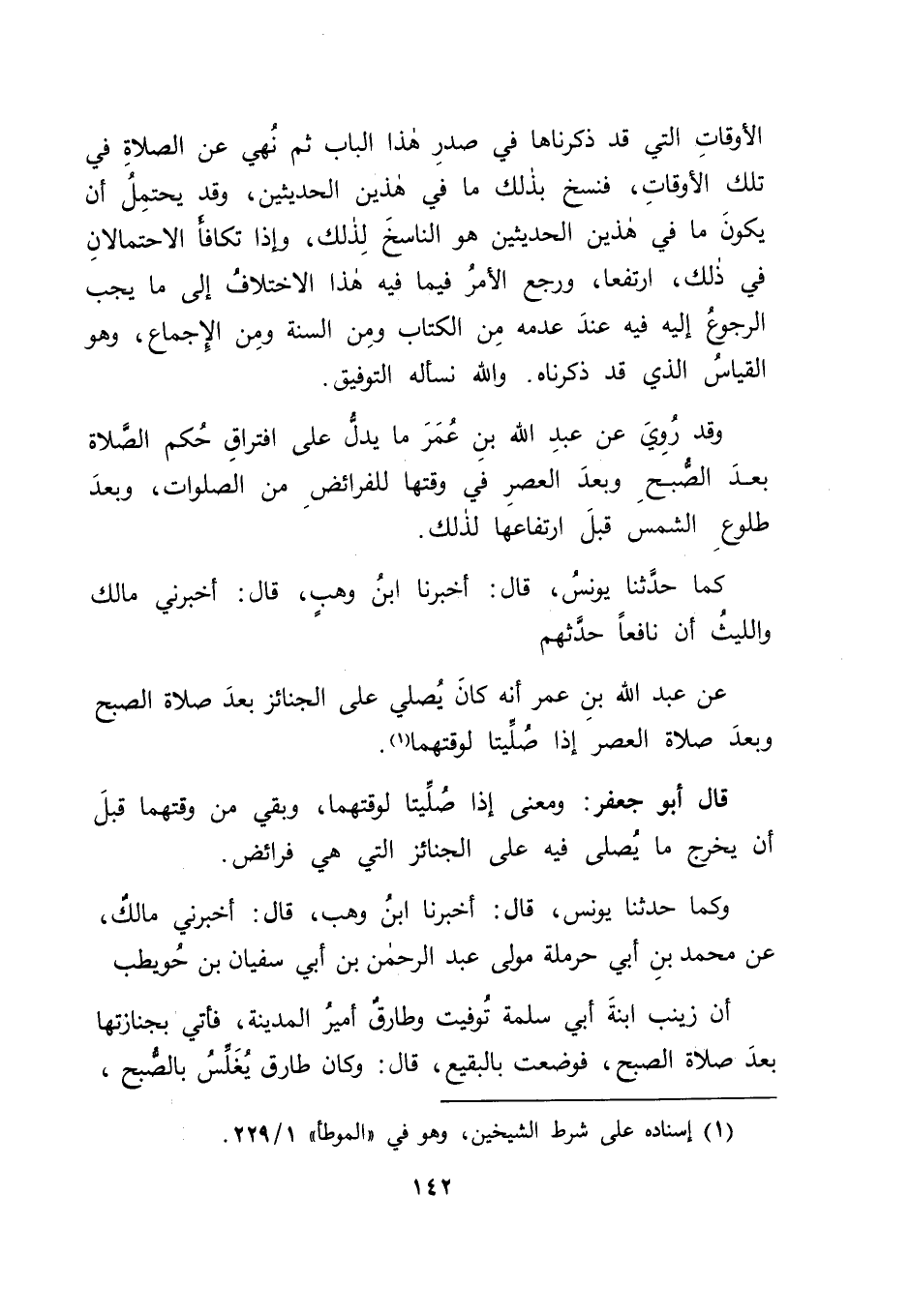 وَكَمَا حَدَّثَنَا يُونُسُ، قَالَ: أَخْبَرَنَا ابْنُ وَهْبٍ، قَالَ: أَخْبَرَنِي مَالِكٌ، عَنْ مُحَمَّدِ بْنِ أَبِي حَرْمَلَةَ مَوْلَى عَبْدِ الرَّحْمَنِ بْنِ أَبِي سُفْيَانَ بْنِ حُوَيْطِبٍ: " أَنَّ زَيْنَبَ ابْنَةَ أَبِي سَلَمَةَ تُوُفِّيَتْ وَطَارِقٌ أَمِيرُ الْمَدِينَةِ، فَأُتِيَ بِجَنَازَتِهَا بَعْدَ صَلَاةِ الصُّبْحِ، فَوُضِعَتْ بِالْبَقِيعِ، قَالَ: وَكَانَ طَارِقٌ يُغَلِّسُ بِالصُّبْحِ، -[143]- قَالَ ابْنُ أَبِي حَرْمَلَةَ: فَسَمِعْتُ عَبْدَ اللهِ بْنَ عُمَرَ يَقُولُ لِأَهْلِهَا: " إِمَّا أَنْ تُصَلُّوا عَلَى جَنَازَتِكُمُ الْآنَ، وَإِمَّا أَنْ تَتْرُكُوهَا حَتَّى تَرْتَفِعَ الشَّمْسُ "