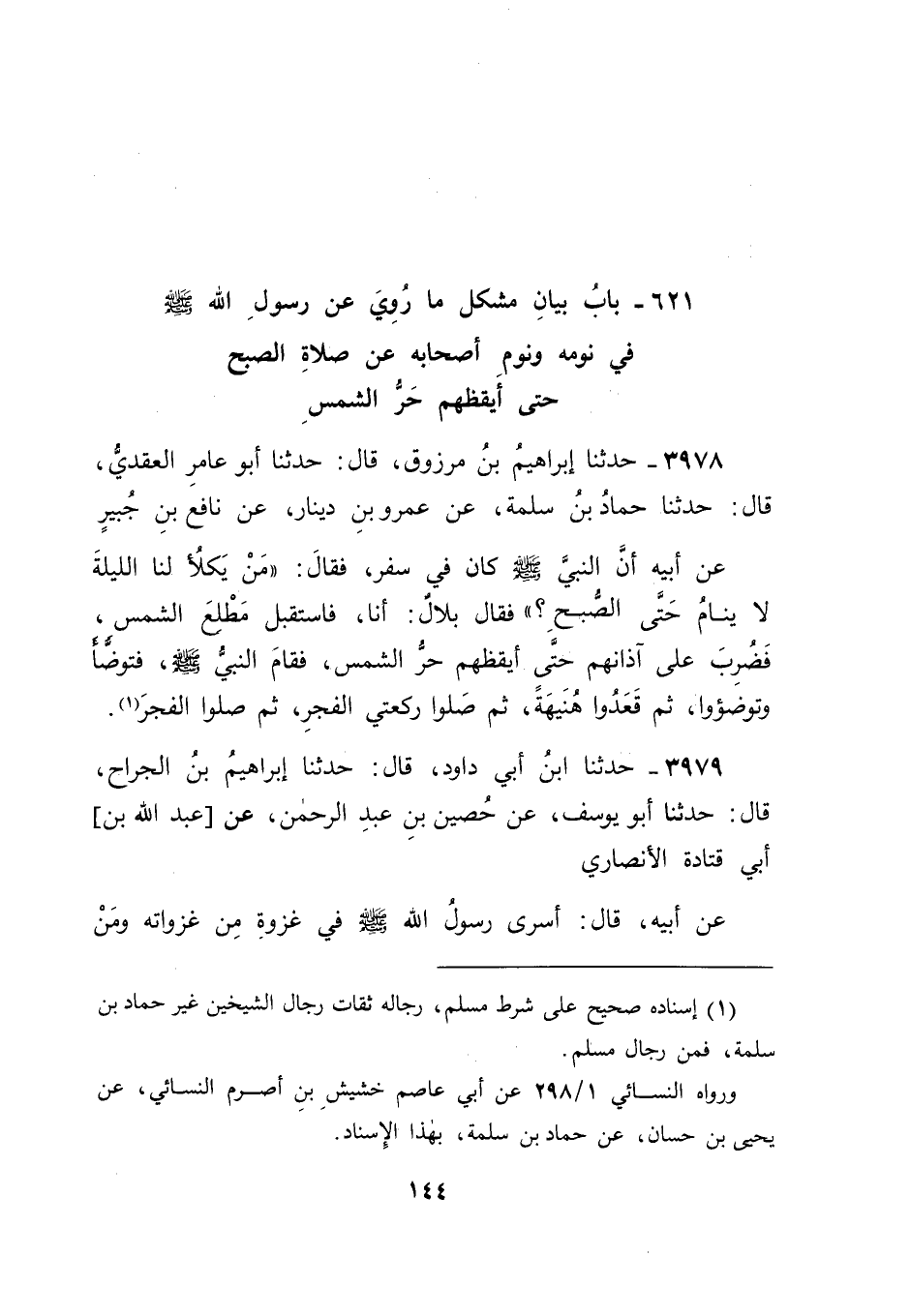3979 - حَدَّثَنَا ابْنُ أَبِي دَاوُدَ، قَالَ: حَدَّثَنَا إِبْرَاهِيمُ بْنُ الْجَرَّاحِ، قَالَ: حَدَّثَنَا أَبُو يُوسُفَ، عَنْ حُصَيْنِ بْنِ عَبْدِ الرَّحْمَنِ، عَنْ عَبْدِ اللهِ بْنِ أَبِي قَتَادَةَ الْأَنْصَارِيِّ، عَنْ أَبِيهِ، قَالَ: " أَسْرَى رَسُولُ اللهِ صَلَّى اللَّهُ عَلَيْهِ وَسَلَّمَ فِي غَزْوَةٍ مِنْ غَزَوَاتِهِ وَمَنْ -[145]- مَعَهُ، فَقَالَ بَعْضُ الْقَوْمِ: لَوْ عَرَّسْتَ، فَقَالَ: " إِنِّي أَخَافُ أَنْ تَنَامُوا عَنِ الصَّلَاةِ " فَقَالَ بِلَالٌ: أَنَا أُوقِظُكُمْ، فَنَزَلَ الْقَوْمُ، فَاضْطَجَعُوا، وَأَسْنَدَ بِلَالٌ ظَهْرَهُ إِلَى رَاحِلَتِهِ، وَأُلْقِيَ عَلَيْهِمُ النَّوْمُ، فَاسْتَيْقَظَ الْقَوْمُ وَقَدْ طَلَعَ حَاجِبُ الشَّمْسِ، فَقَالَ: " أَيْنَ مَا قُلْتَ يَا بِلَالُ؟ " فَقَالَ: يَا رَسُولَ اللهِ، إِنَّ اللهَ قَبَضَ أَرْوَاحَكُمْ حِينَ شَاءَ، وَرَدَّهَا إِلَيْكُمْ حِينَ شَاءَ، قَالَ: " فَآذِنِ النَّاسَ بِالصَّلَاةِ " فَآذَنَهُمْ، فَتَوَضَّئُوا، فَلَمَّا ارْتَفَعَتِ الشَّمْسُ صَلَّى رَسُولُ اللهِ صَلَّى اللَّهُ عَلَيْهِ وَسَلَّمَ رَكْعَتَيِ الْفَجْرِ، ثُمَّ صَلَّى الْفَجْرَ "