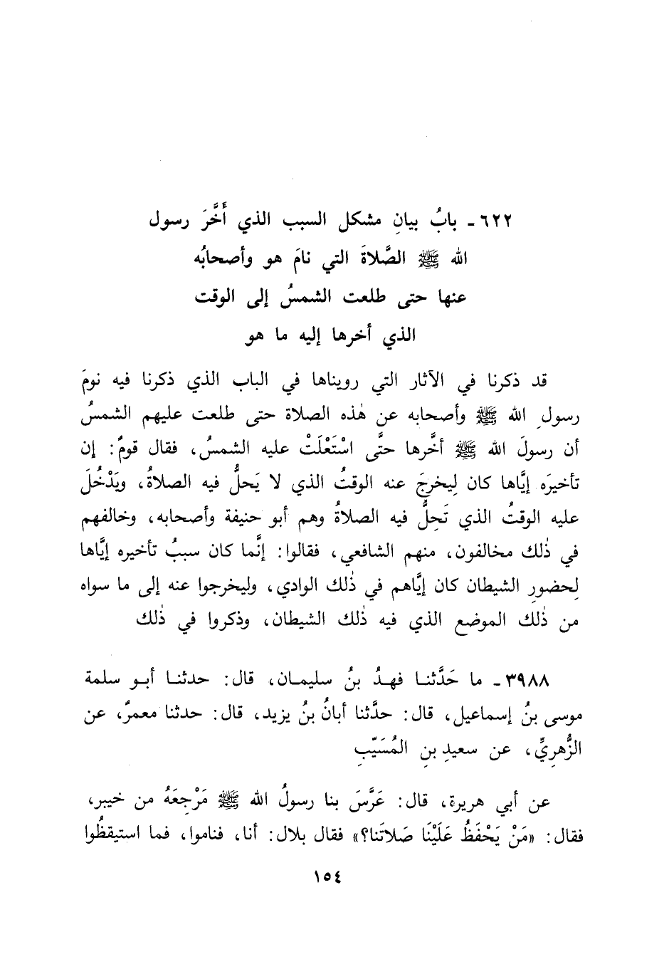 بَابُ بَيَانِ مُشْكِلِ السَّبَبِ الَّذِي أَخَّرَ رَسُولُ اللهِ صَلَّى اللَّهُ عَلَيْهِ وَسَلَّمَ الصَّلَاةَ الَّتِي نَامَ هُوَ وَأَصْحَابُهُ عَنْهَا حَتَّى طَلَعَتِ الشَّمْسُ إِلَى الْوَقْتِ الَّذِي أَخَّرَهَا إِلَيْهِ مَا هُوَ قَدْ ذَكَرْنَا فِي الْآثَارِ الَّتِي رَوَيْنَاهَا فِي الْبَابِ الَّذِي ذَكَرْنَا فِيهِ نَوْمَ رَسُولِ اللهِ صَلَّى اللَّهُ عَلَيْهِ وَسَلَّمَ وَأَصْحَابِهِ عَنْ هَذِهِ الصَّلَاةِ حَتَّى طَلَعَتْ عَلَيْهِمُ الشَّمْسُ أَنَّ رَسُولَ اللهِ صَلَّى اللَّهُ عَلَيْهِ وَسَلَّمَ أَخَّرَهَا حَتَّى اسْتَعْلَتْ عَلَيْهِ الشَّمْسُ، فَقَالَ قَوْمٌ: إِنَّ تَأْخِيرَهُ إِيَّاهَا كَانَ لِيَخْرُجَ عَنْهُ الْوَقْتُ الَّذِي لَا يَحِلُّ فِيهِ الصَّلَاةُ، وَيَدْخُلَ عَلَيْهِ الْوَقْتُ الَّذِي تَحِلُّ فِيهِ الصَّلَاةُ وَهُمْ: أَبُو حَنِيفَةَ وَأَصْحَابُهُ، وَخَالَفَهُمْ فِي ذَلِكَ مُخَالِفُونَ، مِنْهُمُ الشَّافِعِيُّ، فَقَالُوا: إِنَّمَا كَانَ سَبَبُ تَأْخِيرِهِ إِيَّاهَا لِحُضُورِ الشَّيْطَانِ كَانَ إِيَّاهُمْ فِي ذَلِكَ الْوَادِي، لِيَخْرُجُوا عَنْهُ إِلَى مَا سِوَاهُ مِنْ ذَلِكَ الْمَوْضِعِ الَّذِي فِيهِ ذَلِكَ الشَّيْطَانُ، وَذَكَرُوا فِي ذَلِكَ