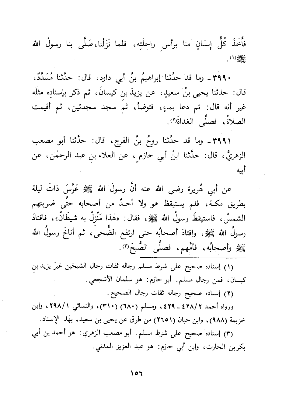 3991 - وَمَا قَدْ حَدَّثَنَا رَوْحُ بْنُ الْفَرَجِ، قَالَ: حَدَّثَنَا أَبُو مُصْعَبٍ الزُّهْرِيُّ، قَالَ: حَدَّثَنَا ابْنُ أَبِي حَازِمٍ، عَنِ الْعَلَاءِ بْنِ عَبْدِ الرَّحْمَنِ، عَنْ أَبِيهِ، عَنْ أَبِي هُرَيْرَةَ رَضِيَ اللهُ عَنْهُ: " أَنَّ رَسُولَ اللهِ صَلَّى اللَّهُ عَلَيْهِ وَسَلَّمَ عَرَّسَ ذَاتَ لَيْلَةٍ بِطَرِيقِ مَكَّةَ، فَلَمْ يَسْتَيْقِظْ هُوَ وَلَا أَحَدٌ مِنْ أَصْحَابِهِ حَتَّى ضَرَبَتْهُمُ الشَّمْسُ، فَاسْتَيْقَظَ رَسُولُ اللهِ صَلَّى اللَّهُ عَلَيْهِ وَسَلَّمَ، فَقَالَ: " هَذَا مَنْزِلٌ بِهِ شَيْطَانٌ " فَاقْتَادَ رَسُولُ اللهِ صَلَّى اللَّهُ عَلَيْهِ وَسَلَّمَ، وَاقْتَادَ أَصْحَابُهُ حَتَّى ارْتَفَعَ الضُّحَى، ثُمَّ أَنَاخَ رَسُولُ اللهِ صَلَّى اللَّهُ عَلَيْهِ وَسَلَّمَ وَأَصْحَابُهُ، فَأَمَّهُمْ، فَصَلَّى الصُّبْحَ " -[157]- قَالُوا: فَإِنَّمَا كَانَ تَأْخِيرُهُ الصَّلَاةَ لِمَكَانِ الشَّيْطَانِ الَّذِي كَانَ فِي ذَلِكَ الْمَكَانِ، لَا لِأَنَّهُ فِي وَقْتٍ لَا يَجُوزُ لَهُ أَنْ يَقْضِيَهَا فِيهِ، وَلَمَّا اخْتَلَفُوا فِي ذَلِكَ، نَظَرْنَا فِيمَا اخْتَلَفُوا فِيهِ مِنْهُ، فَوَجَدْنَا حُضُورَ الشَّيْطَانِ مِمَّا لَا يَمْنَعُ مِنَ الصَّلَاةِ، إِذْ كَانَ قَدْ عَرَضَ لِرَسُولِ اللهِ صَلَّى اللَّهُ عَلَيْهِ وَسَلَّمَ وَهُوَ فِي الصَّلَاةِ، فَلَمْ يَخْرُجْ مِنْهَا لِذَلِكَ، وَكَانَ مِنْهُ إِلَيْهِ فِيهَا، وَمِنَ اسْتِتْمَامِهِ إِيَّاهَا حَتَّى فَرَغَ مِنْهُمَا
