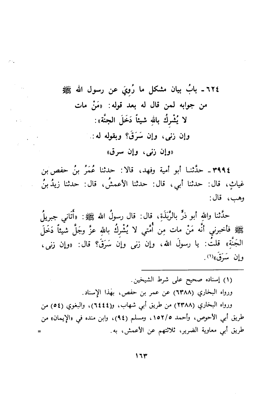 بَابُ بَيَانِ مُشْكِلِ مَا رُوِيَ عَنْ رَسُولِ اللهِ صَلَّى اللَّهُ عَلَيْهِ وَسَلَّمَ مِنْ جَوَابِهِ لِمَنْ قَالَ لَهُ بَعْدَ قَوْلِهِ: " مَنْ مَاتَ لَا يُشْرِكُ بِاللهِ شَيْئًا دَخَلَ الْجَنَّةَ ": وَإِنْ زَنَى، وَإِنْ سَرَقَ؟ وَبِقَوْلِهِ لَهُ: " وَإِنْ زَنَى، وَإِنْ سَرَقَ "