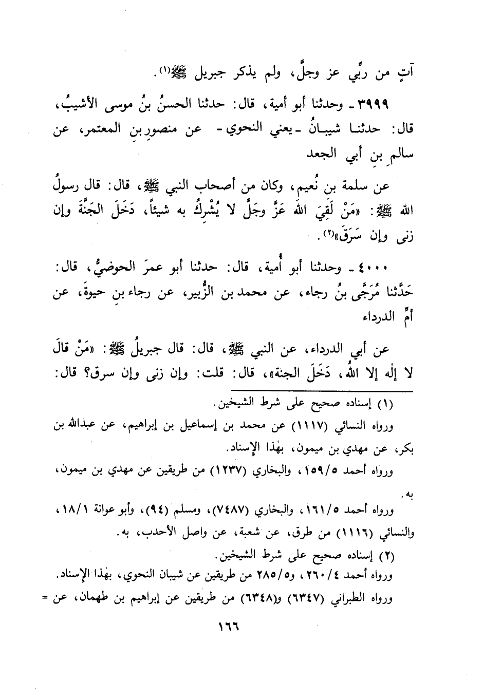 4000 - وَحَدَّثَنَا أَبُو أُمَيَّةَ، قَالَ: حَدَّثَنَا أَبُو عُمَرَ الْحَوْضِيُّ، قَالَ: حَدَّثَنَا مُرَجَّى بْنُ رَجَاءٍ، عَنْ مُحَمَّدِ بْنِ الزُّبَيْرِ، عَنْ رَجَاءِ بْنِ حَيْوَةَ، عَنْ أُمِّ الدَّرْدَاءِ، عَنْ أَبِي الدَّرْدَاءِ، عَنِ النَّبِيِّ صَلَّى اللَّهُ عَلَيْهِ وَسَلَّمَ، قَالَ: " قَالَ جِبْرِيلُ عَلَيْهِ السَّلَامُ: " مَنْ قَالَ: لَا إِلَهَ إِلَّا اللهُ، دَخَلَ الْجَنَّةَ " قَالَ: قُلْتُ: وَإِنْ زَنَى وَإِنْ سَرَقَ؟ قَالَ: " -[167]- وَإِنْ زَنَى وَإِنْ سَرَقَ "