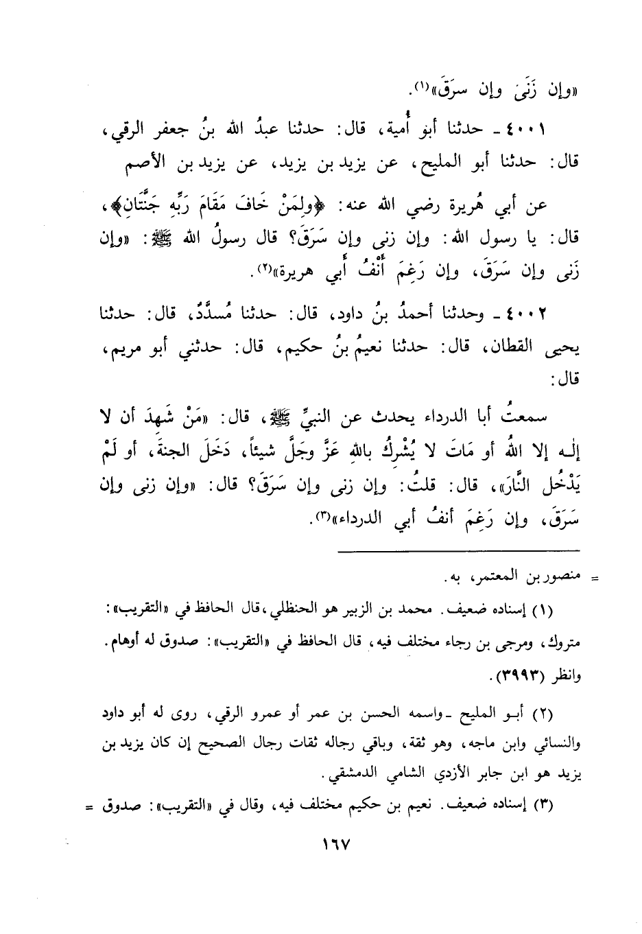 4002 - وَحَدَّثَنَا أَحْمَدُ بْنُ دَاوُدَ، قَالَ: حَدَّثَنَا مُسَدَّدٌ، قَالَ: حَدَّثَنَا يَحْيَى الْقَطَّانُ، قَالَ: حَدَّثَنَا نُعَيْمُ بْنُ حَكِيمٍ، قَالَ: حَدَّثَنِي أَبُو مَرْيَمَ، قَالَ: سَمِعْتُ أَبَا الدَّرْدَاءِ يُحَدِّثُ عَنِ النَّبِيِّ صَلَّى اللَّهُ عَلَيْهِ وَسَلَّمَ، قَالَ: " مَنْ شَهِدَ أَنْ لَا إِلَهَ إِلَّا اللهُ، أَوْ مَاتَ لَا يُشْرِكُ بِاللهِ عَزَّ وَجَلَّ شَيْئًا، دَخَلَ الْجَنَّةَ، أَوْ لَمْ يَدْخُلِ النَّارَ " قَالَ: قُلْتُ: وَإِنْ زَنَى وَإِنْ سَرَقَ؟ قَالَ: " وَإِنْ زَنَى وَإِنْ سَرَقَ، وَإِنْ رَغِمَ أَنْفُ أَبِي الدَّرْدَاءِ "