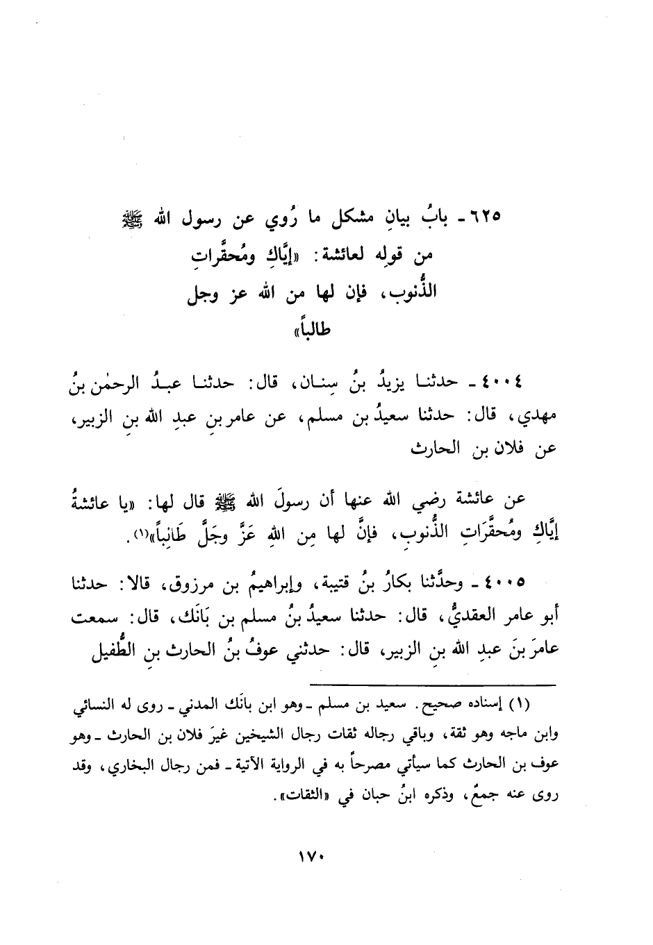 4004 - حَدَّثَنَا يَزِيدُ بْنُ سِنَانٍ، قَالَ: حَدَّثَنَا عَبْدُ الرَّحْمَنِ بْنُ مَهْدِيٍّ، قَالَ: حَدَّثَنَا سَعِيدُ بْنُ مُسْلِمٍ، عَنْ عَامِرِ بْنِ عَبْدِ اللهِ بْنِ الزُّبَيْرِ، عَنْ فُلَانِ بْنِ الْحَارِثِ، عَنْ عَائِشَةَ رَضِيَ اللهُ عَنْهَا أَنَّ رَسُولَ اللهِ صَلَّى اللَّهُ عَلَيْهِ وَسَلَّمَ قَالَ لَهَا: " يَا عَائِشَةُ، إِيَّاكِ وَمُحَقَّرَاتِ الذُّنُوبِ، فَإِنَّ لَهَا مِنَ اللهِ عَزَّ وَجَلَّ طَالِبًا "