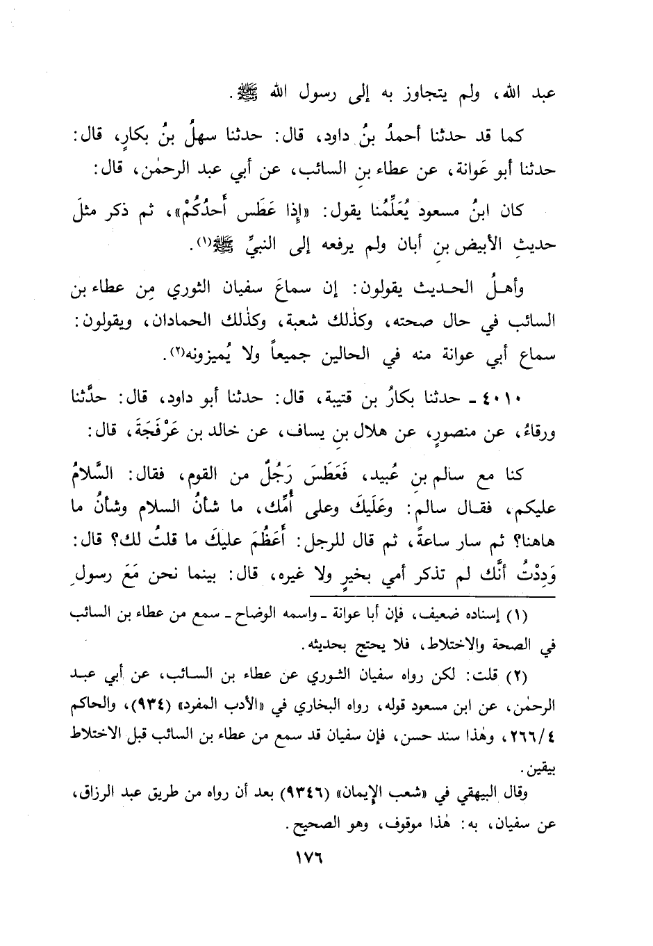4010 - حَدَّثَنَا بَكَّارُ بْنُ قُتَيْبَةَ، قَالَ: حَدَّثَنَا أَبُو دَاوُدَ، قَالَ: حَدَّثَنَا وَرْقَاءُ، عَنْ مَنْصُورٍ، عَنْ هِلَالِ بْنِ يَسَافٍ، عَنْ خَالِدِ بْنِ عَرْفَجَةَ، قَالَ: كُنَّا مَعَ سَالِمِ بْنِ عُبَيْدٍ، فَعَطَسَ رَجُلٌ مِنَ الْقَوْمِ، فَقَالَ: السَّلَامُ عَلَيْكُمْ، فَقَالَ سَالِمٌ: وَعَلَيْكَ وَعَلَى أُمِّكَ، مَا شَأْنُ السَّلَامِ وَشَأْنُ مَا هَاهُنَا؟ ثُمَّ سَارَ سَاعَةً، ثُمَّ قَالَ لِلرَّجُلِ: أَعَظُمَ عَلَيْكَ مَا قُلْتُ لَكَ؟ قَالَ: وَدِدْتُ أَنَّكَ لَمْ تَذْكُرْ أُمِّي بِخَيْرٍ وَلَا غَيْرِهِ، قَالَ: " بَيْنَمَا نَحْنُ مَعَ رَسُولِ -[177]- اللهِ صَلَّى اللَّهُ عَلَيْهِ وَسَلَّمَ إِذْ عَطَسَ رَجُلٌ مِنَ الْقَوْمِ، فَقَالَ: السَّلَامُ عَلَيْكُمْ، فَقَالَ رَسُولُ اللهِ صَلَّى اللَّهُ عَلَيْهِ وَسَلَّمَ: " عَلَيْكَ وَعَلَى أُمِّكَ، إِذَا عَطَسَ أَحَدُكُمْ، فَلْيَقُلِ: الْحَمْدُ لِلَّهِ رَبِّ الْعَالَمِينَ، أَوْ عَلَى كُلِّ حَالٍ، وَلْيَرُدُّوا عَلَيْهِ: يَرْحَمُكَ اللهُ، وَلْيَرُدَّ عَلَيْهِمْ: يَغْفِرُ اللهُ لَكُمْ " -[179]-